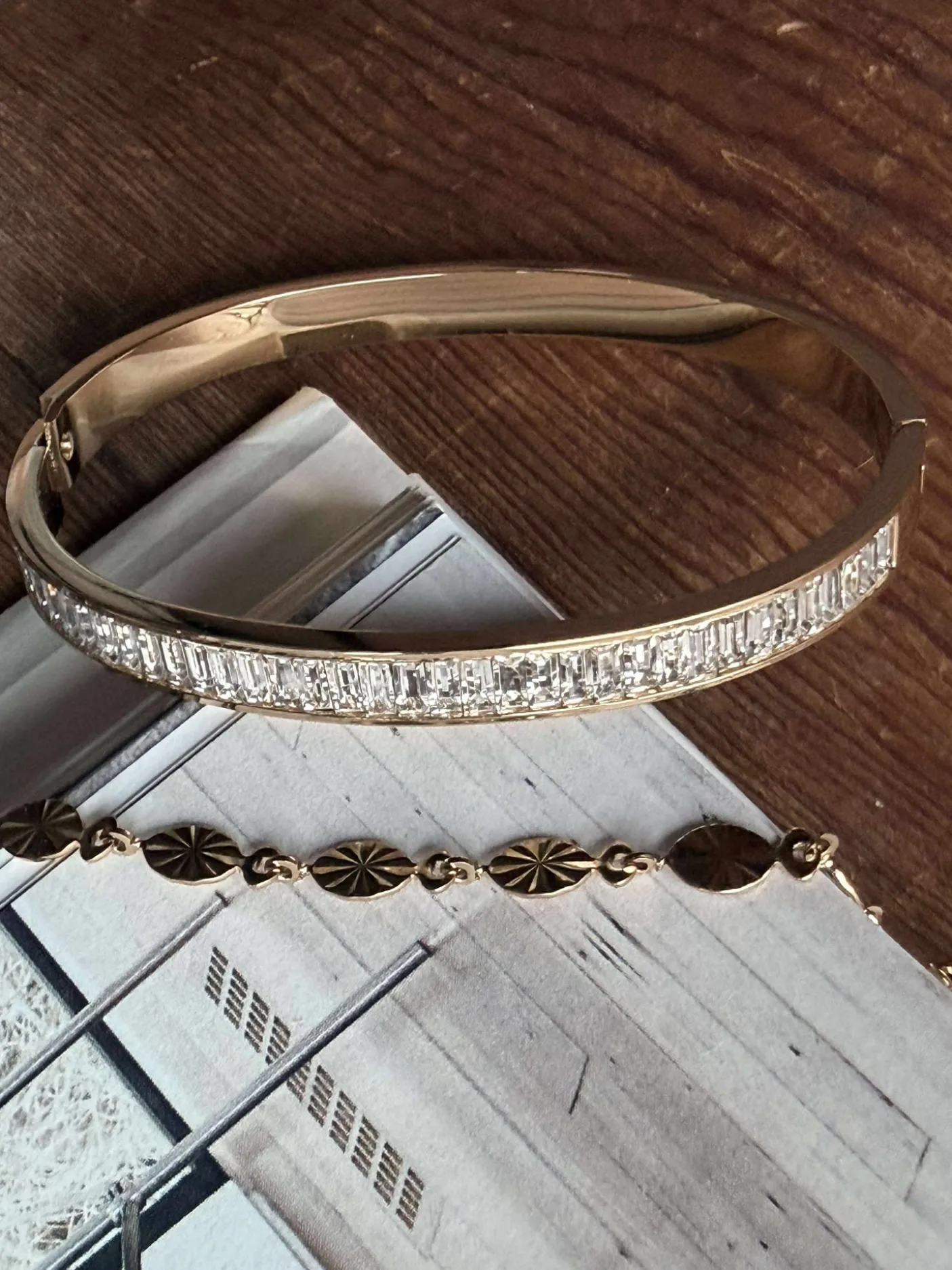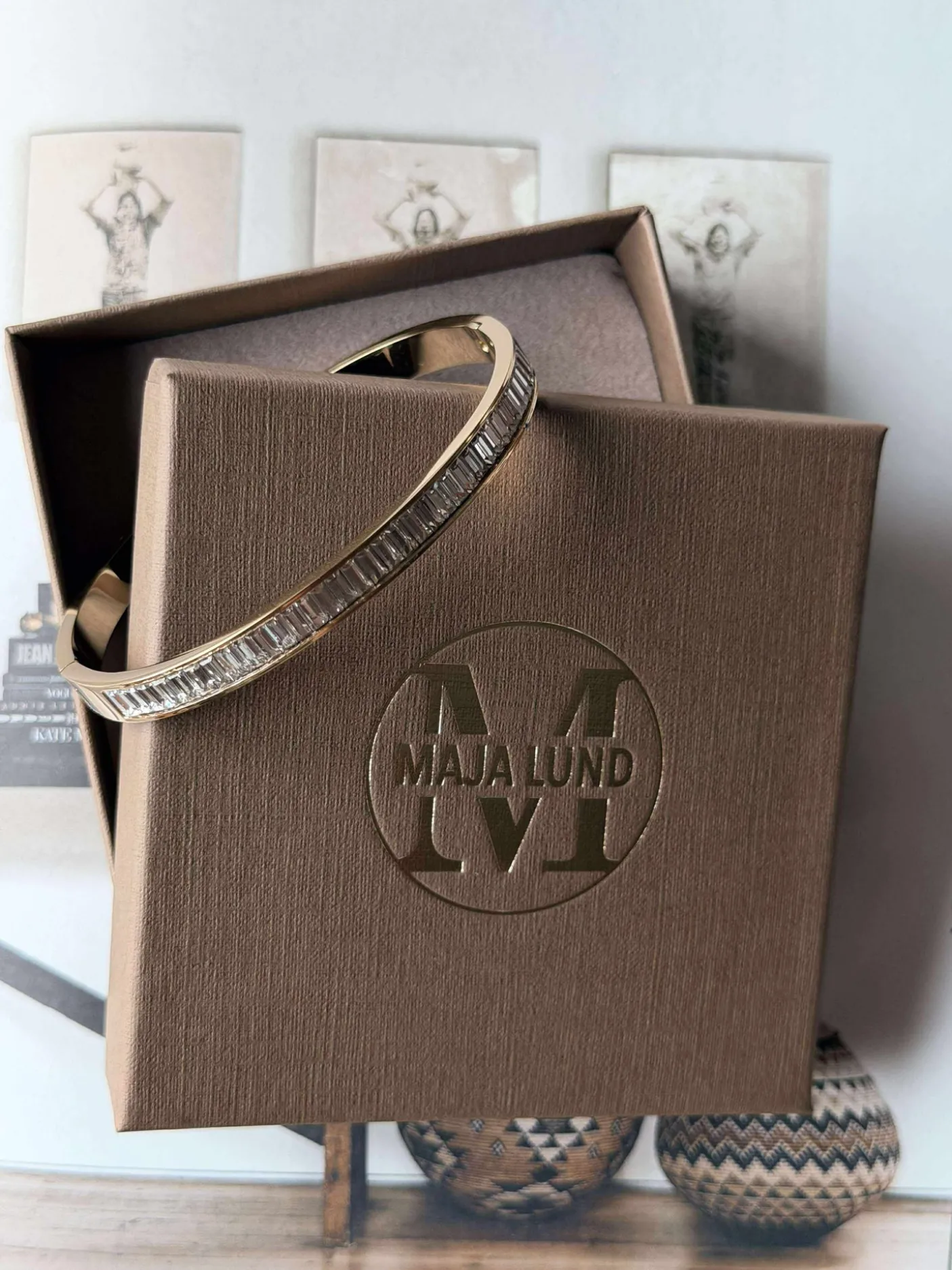 Armring FILUCA forgyldt er et kraftigt bangle armbånd med et klart, ensfarvet guldudtryk. Armbåndet har en indvendig diameter på 60 mm og en smal bredde på 0,5 cm. I bredden er der isat baguette CZ sten, som tilføjer et præcist, geometrisk snit. Produktet leveres præsenteret i en gave-æske.