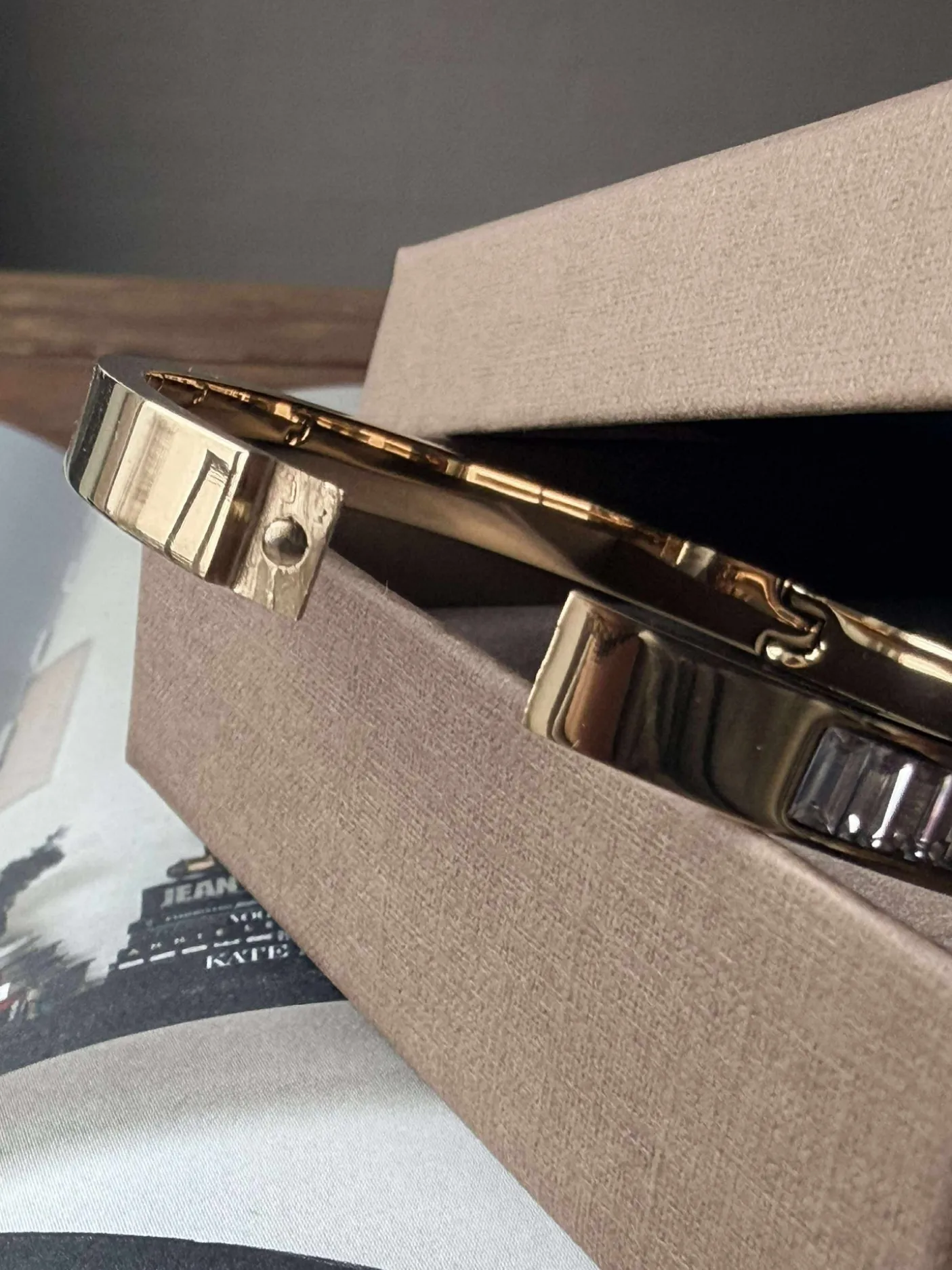 Materialet er rustfrit stål med 18K forgyldning, hvilket giver armbåndet den gule metaltone og et ensartet look.