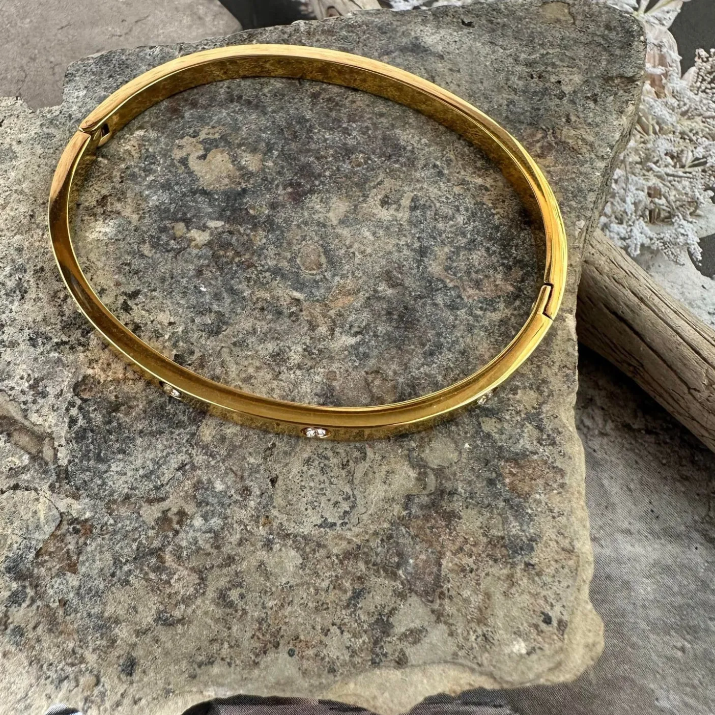 Smukt bangle armbånd udført i rustfrit stål, forgyldt med 18K guld og sat med ægte zirkoner. Mål: 17 cm — størrelse S/M, passer small/medium. Det forgyldte rustfri stål giver et varmt, ensfarvet guldudtryk, mens zirkonerne tilfører en diskret glans ved håndleddet.