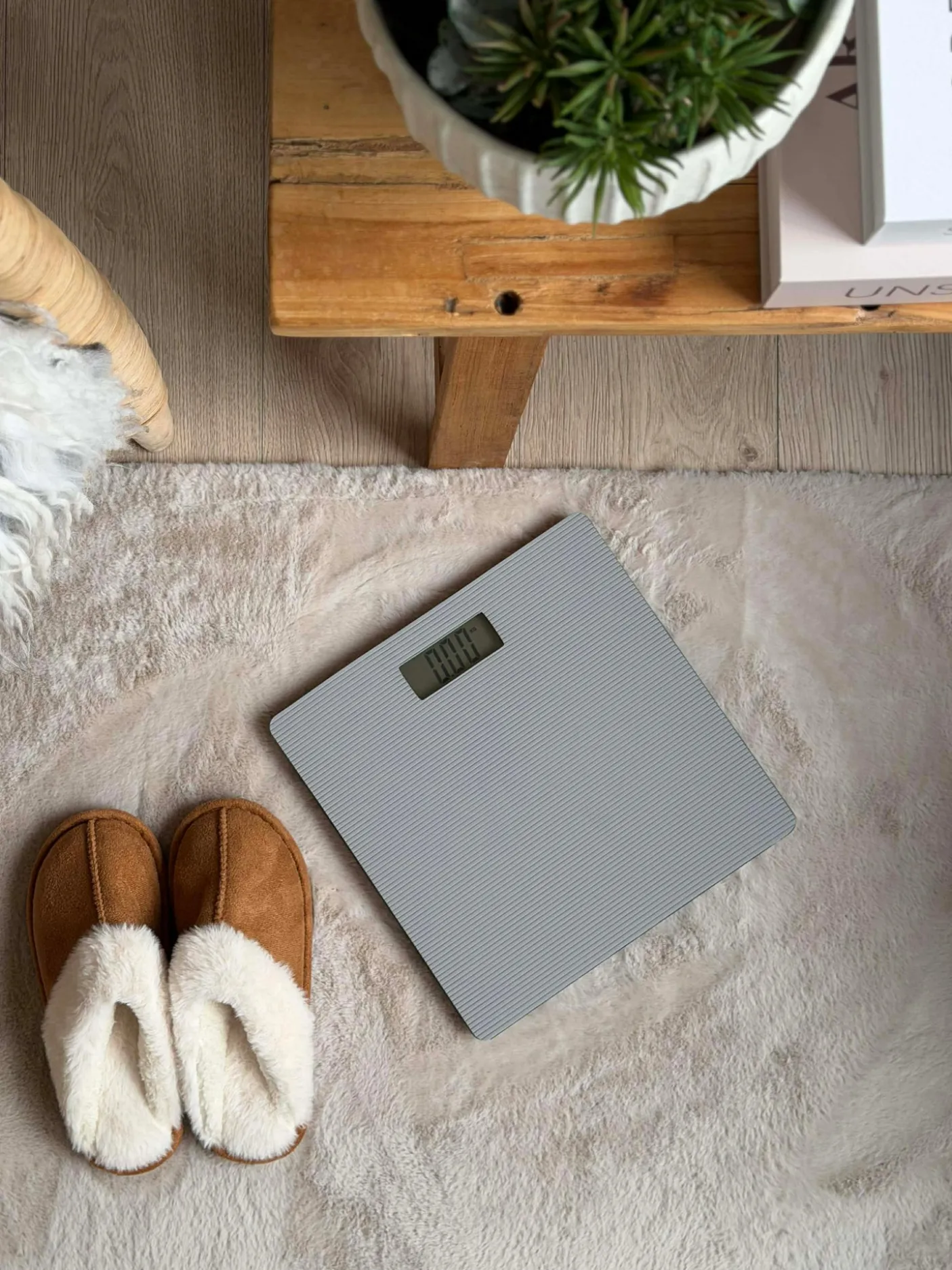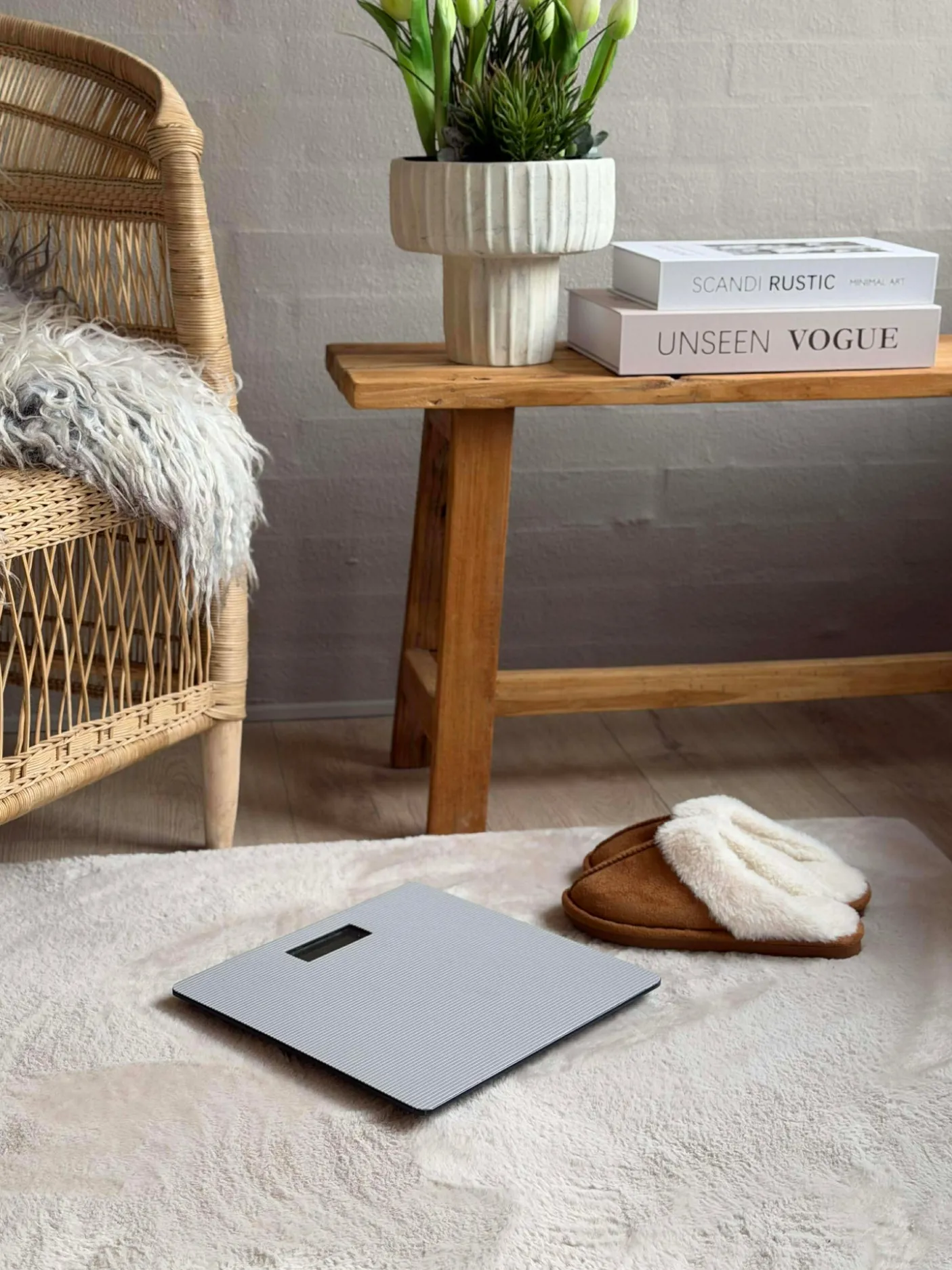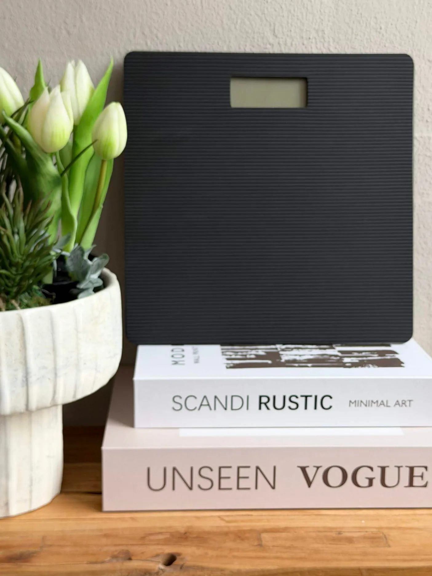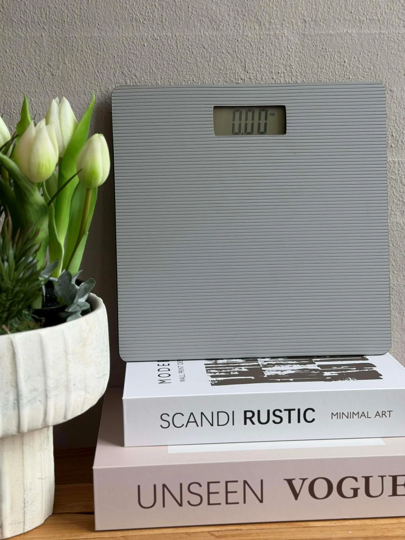 Badevægten fungerer som et fast aflæsningspunkt i badeværelset og passer til en stil, hvor sober indretning prioriteres. Det flade design betyder, at vægten ikke fylder visuelt i rummet og kan holde sig diskret fremme ved håndvask eller skabe.