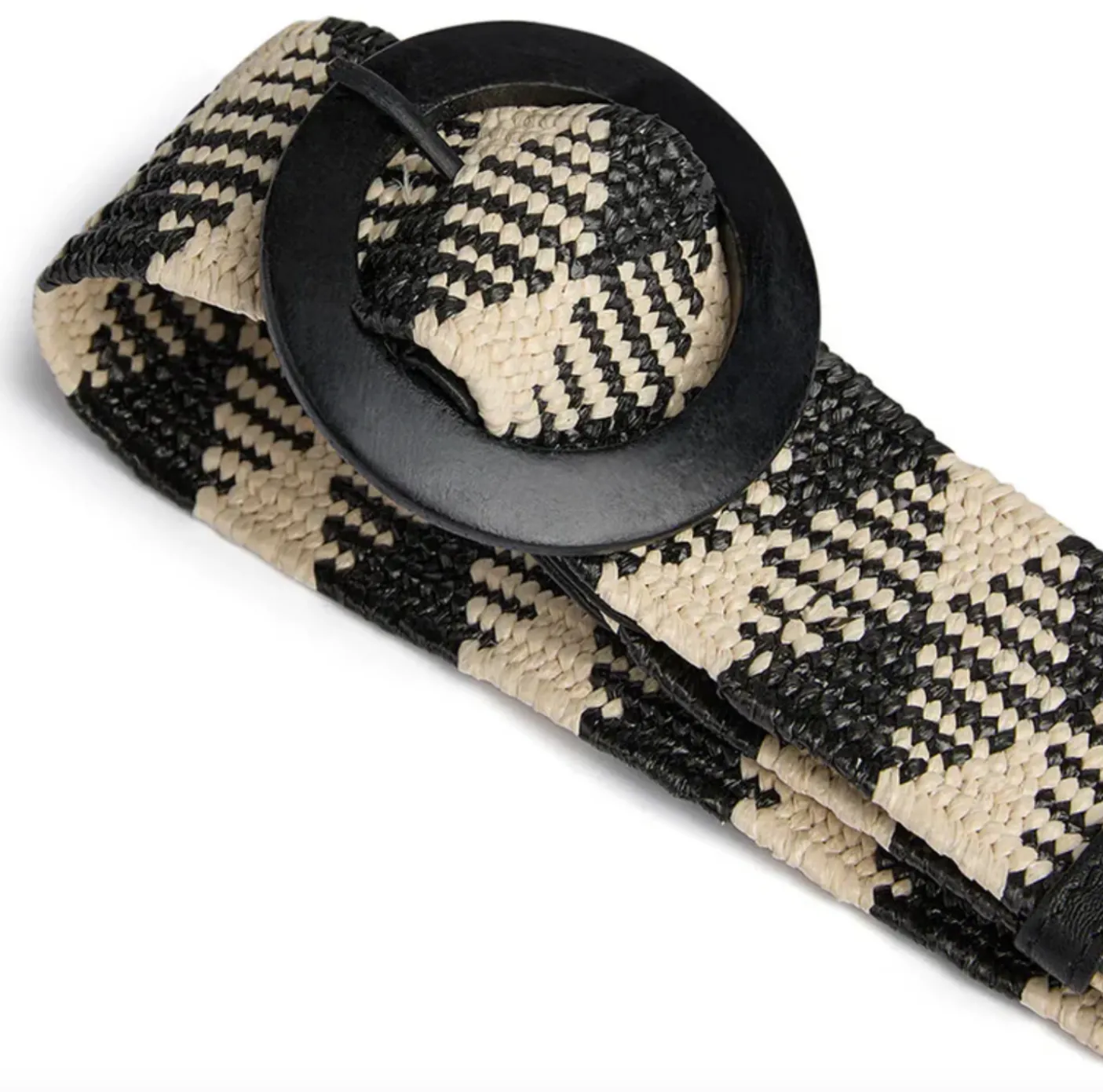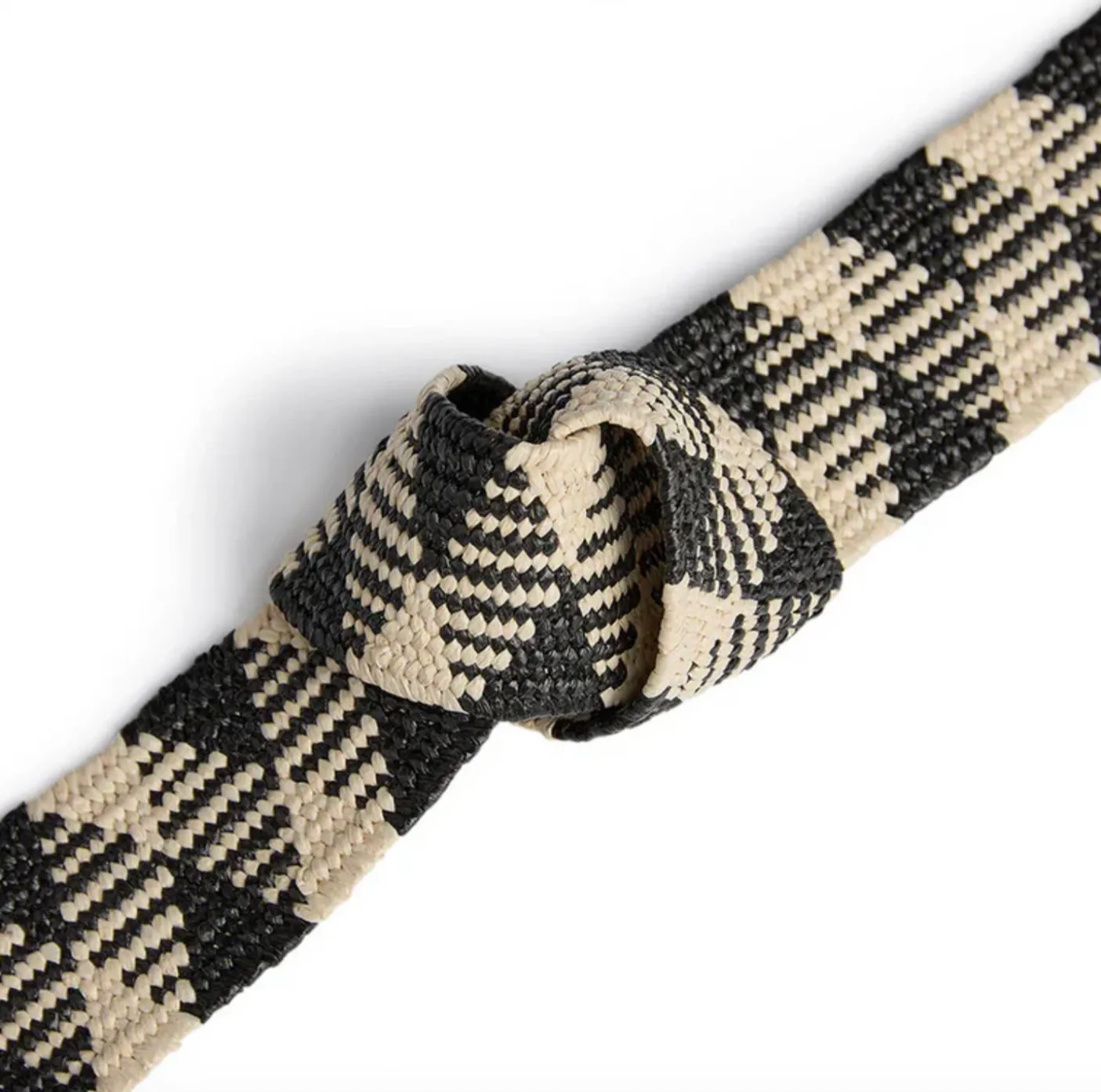 Bæltet er udført i træ og har en tydelig struktur, som fremhæver det vævede udtryk i designet. Den sorte farve gør det enkelt at kombinere med både lyse og mørke nuancer.