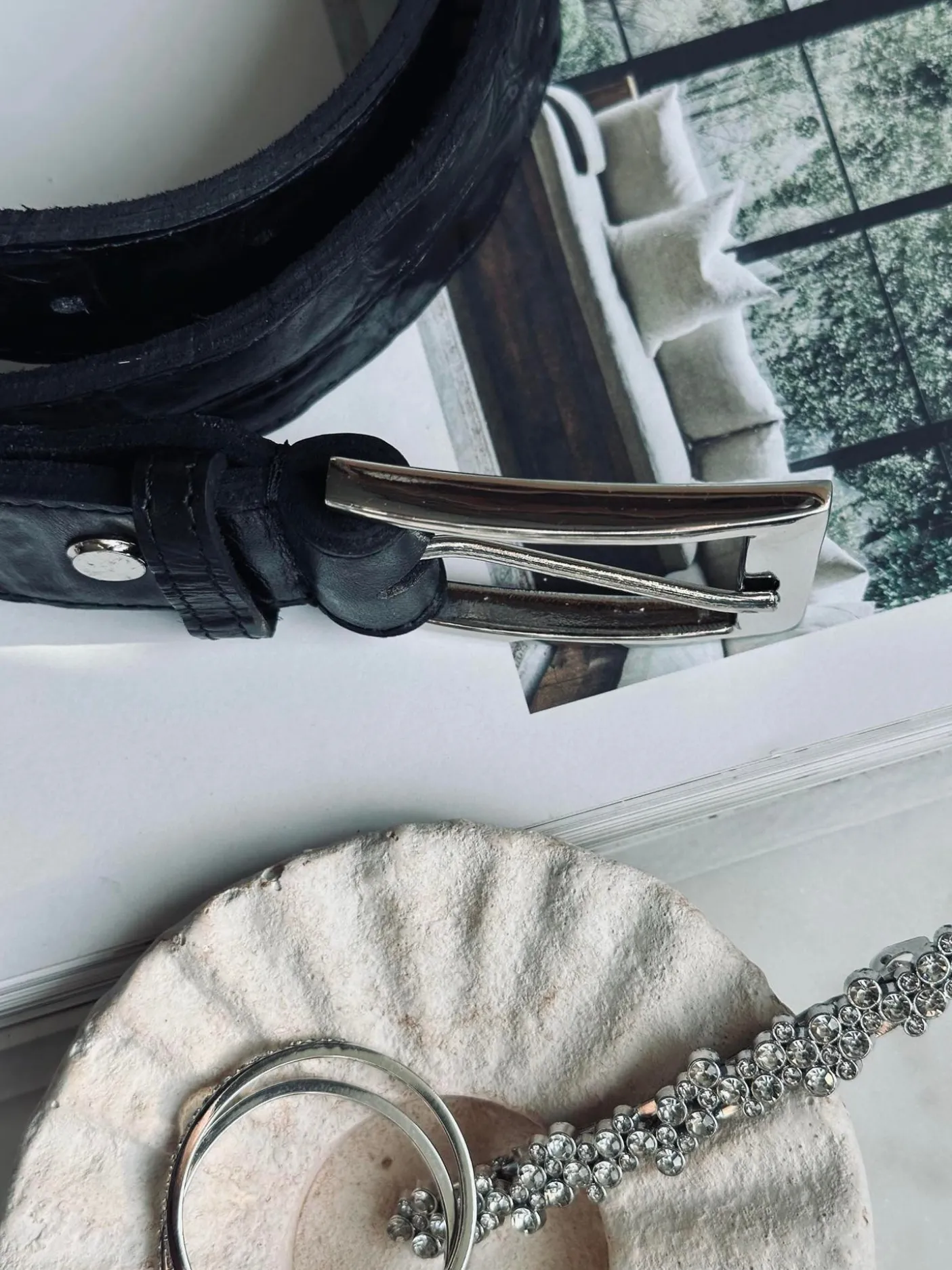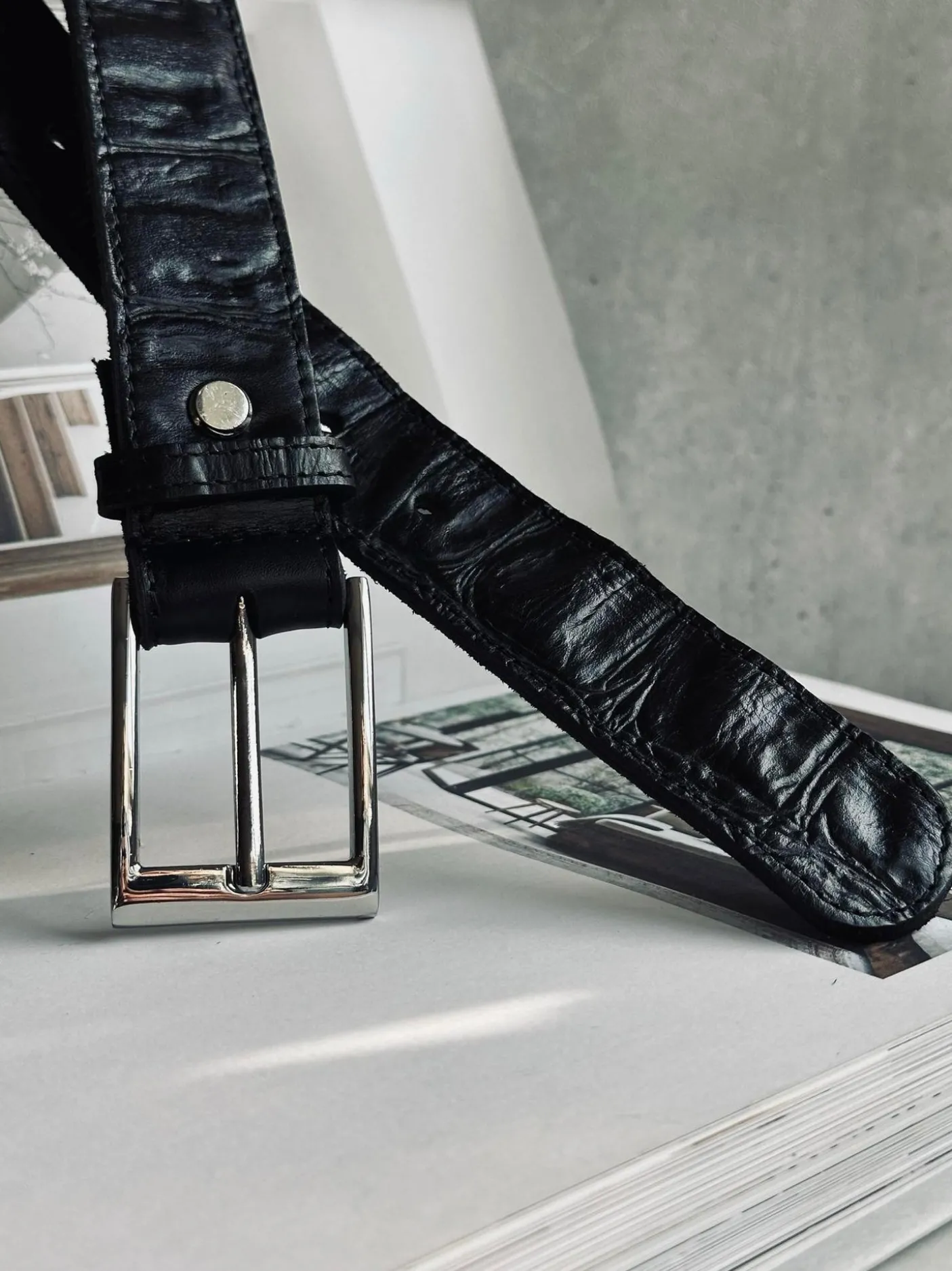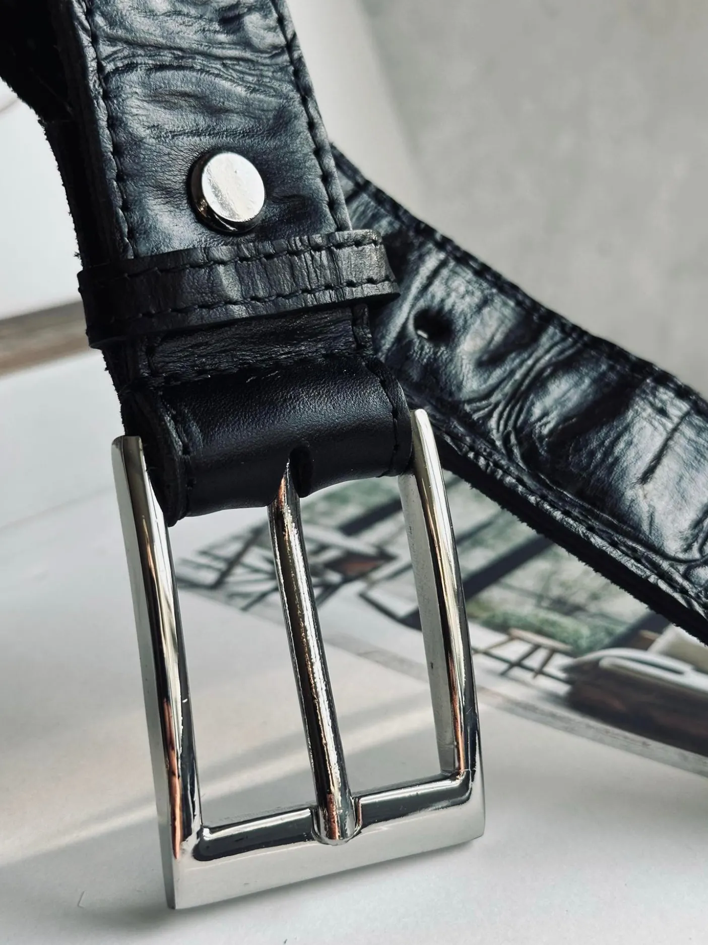 Bæltet er fremstillet i læder og har en tydelig struktureret overflade, som understreger croc-udtrykket. Brug det som et enkelt statement-accessory, når du vil samle outfittet.