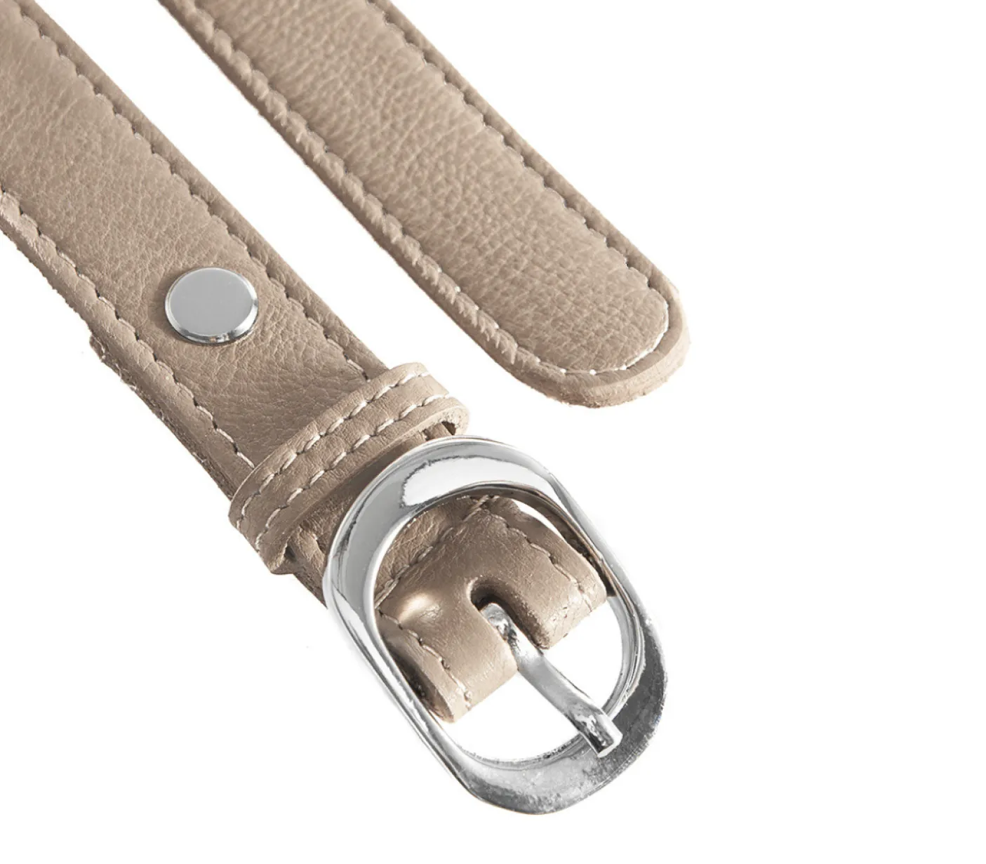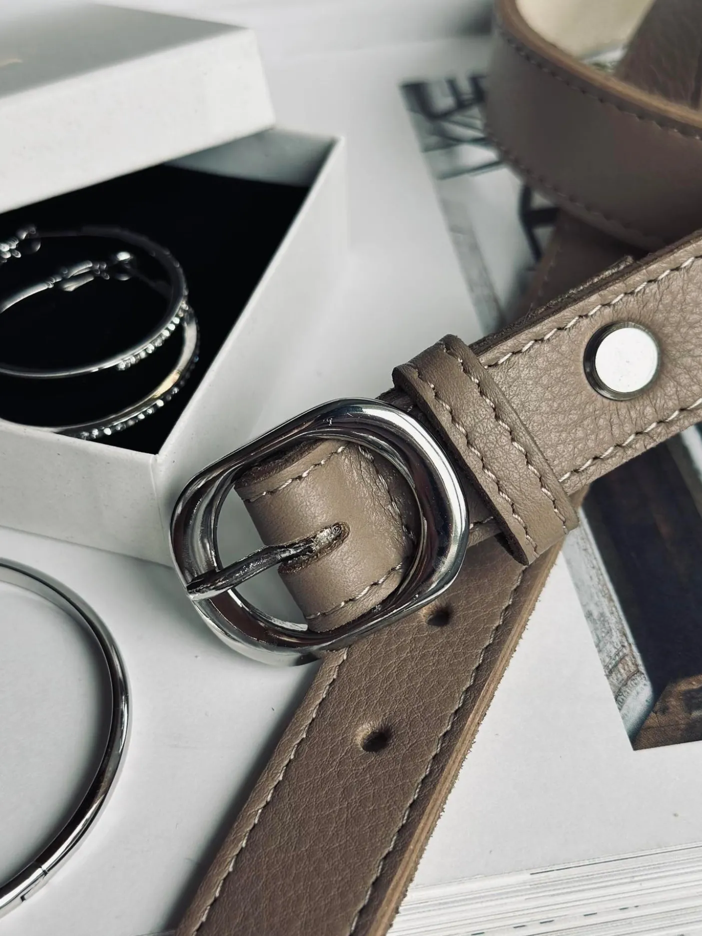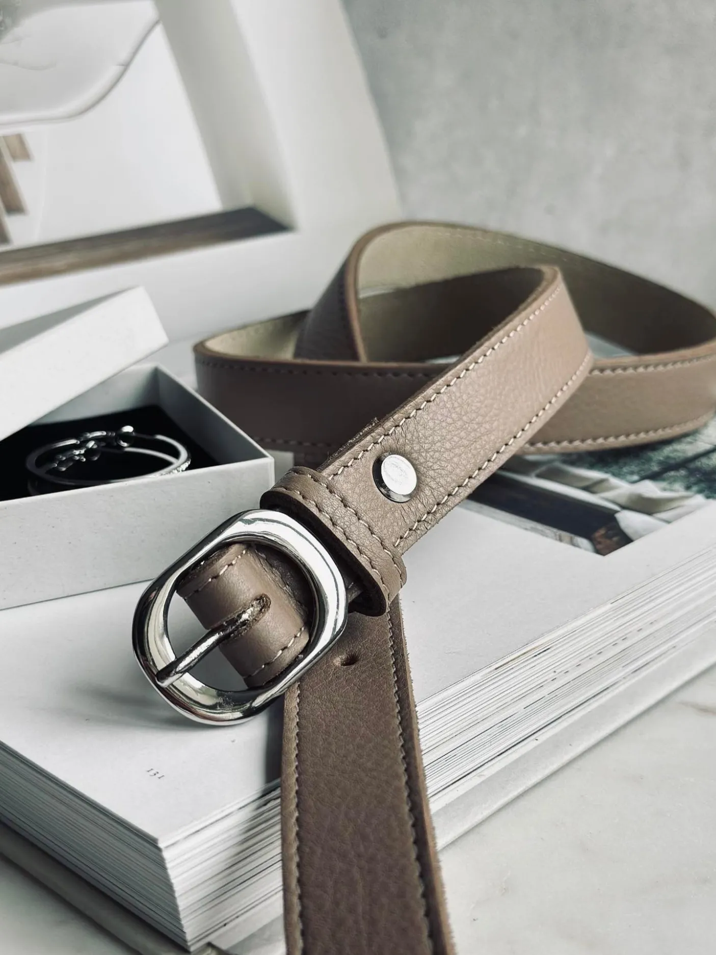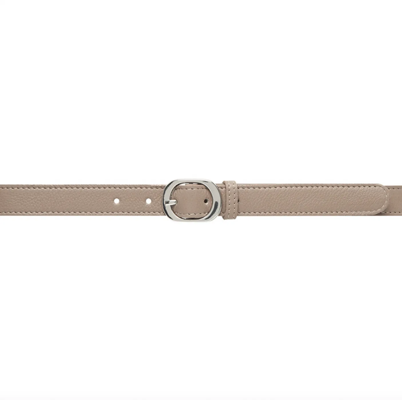 Et klassisk, smalt bælte i dusty taupe, der giver et roligt og underspillet udtryk. Den ensfarvede overflade gør det nemt at style til både hverdag og mere velklædte looks. Med sin smalle bredde får bæltet et let og diskret præg, der fungerer godt, når du ønsker en fin detalje uden at det fylder visuelt.