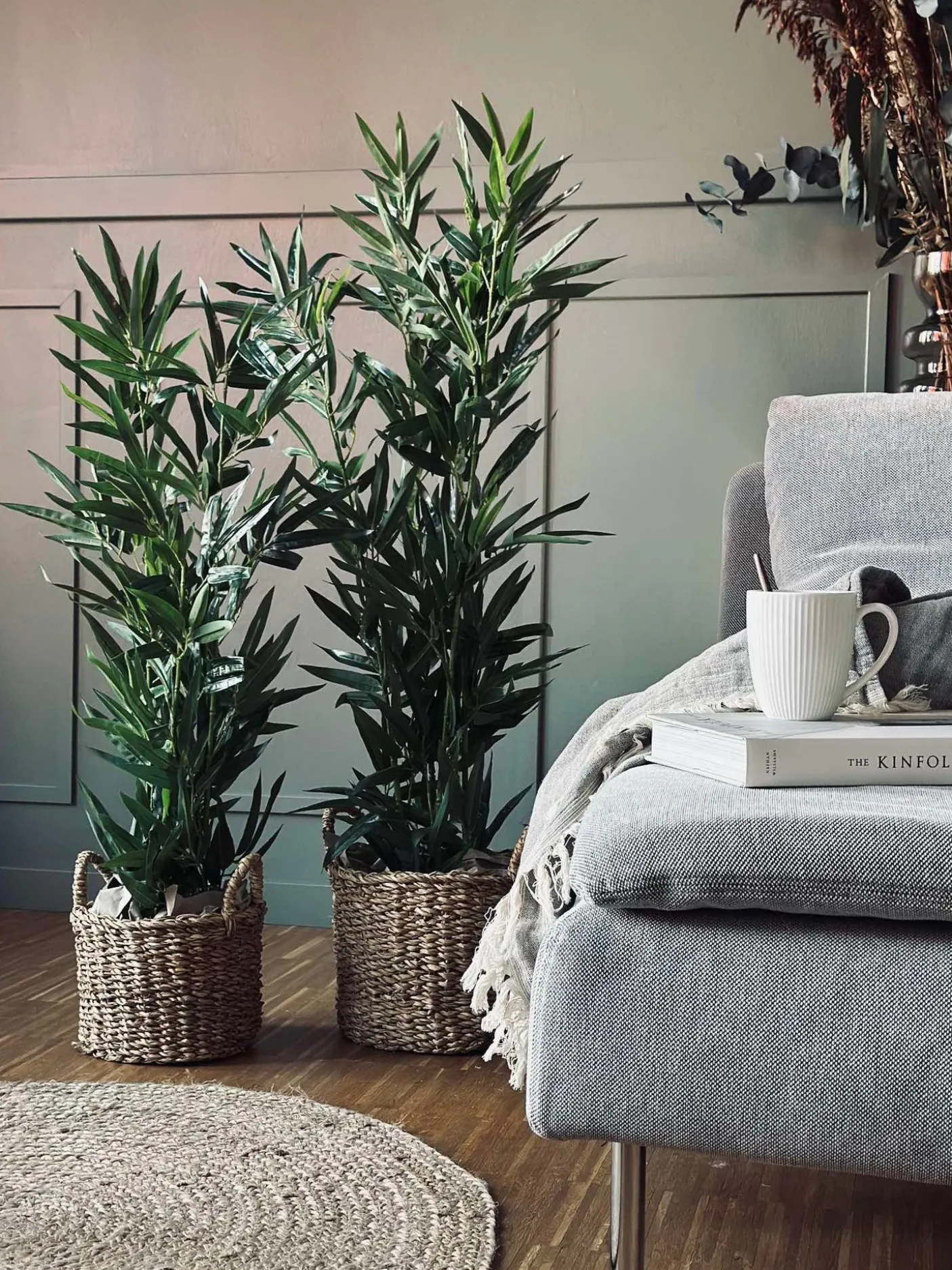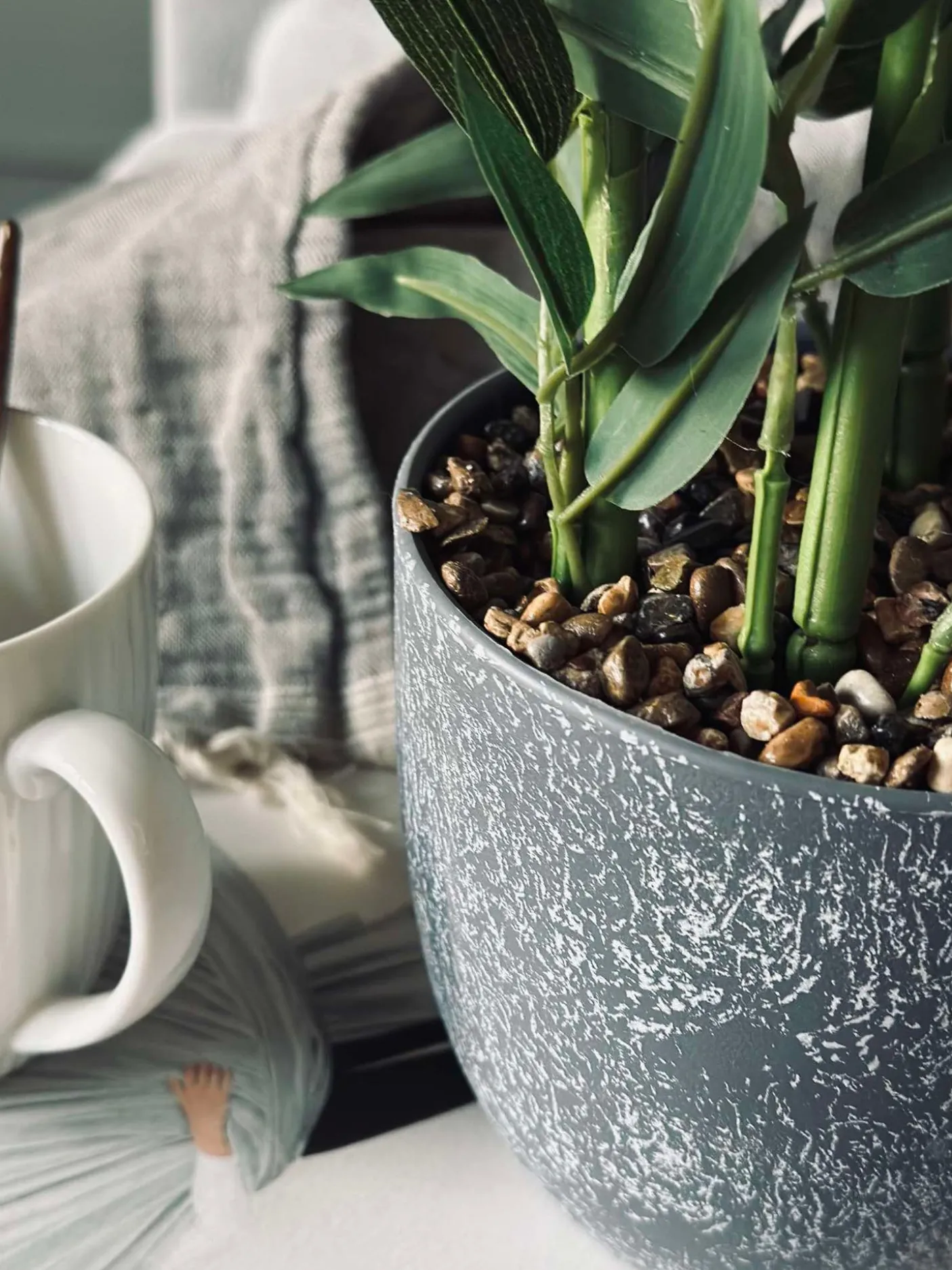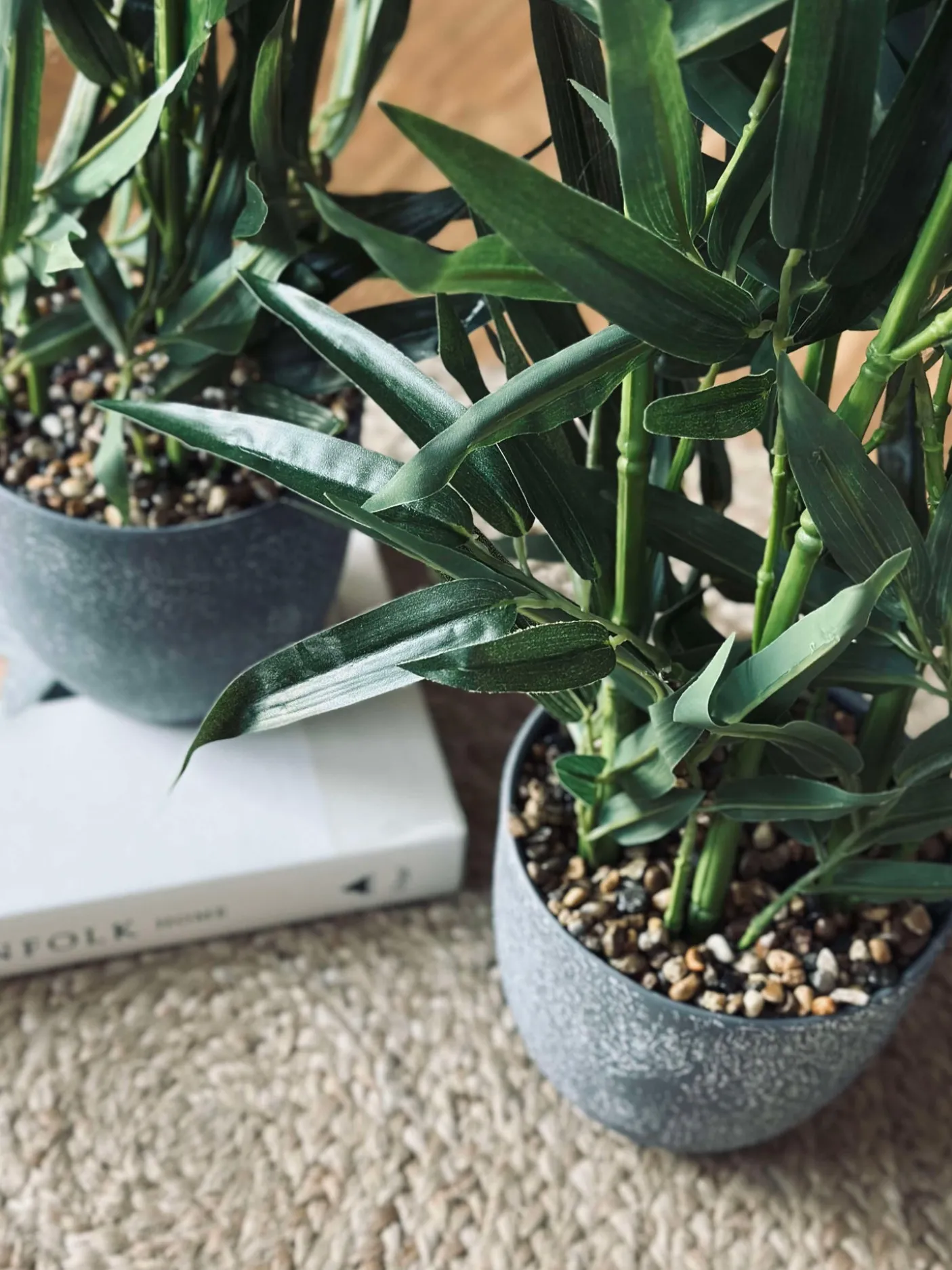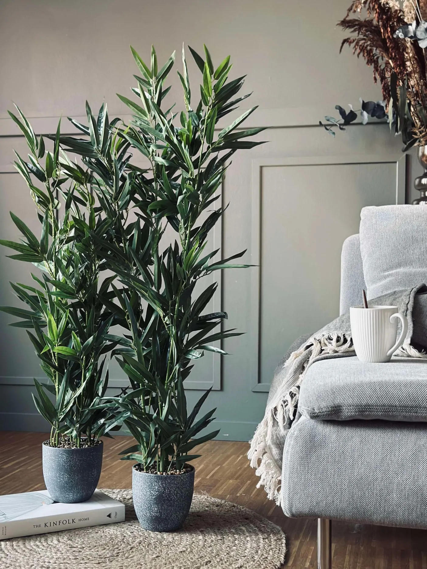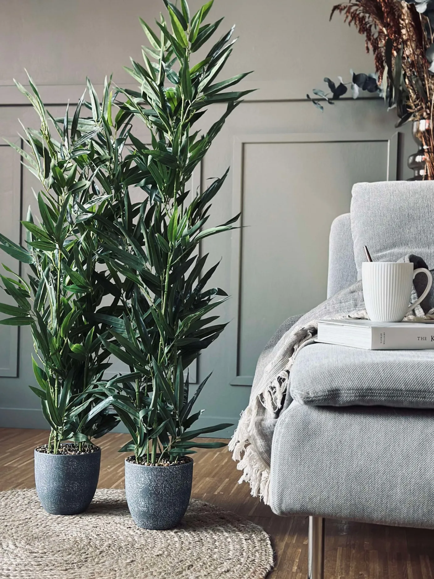 Flot Kunstig , men naturtro bambus i grå potte.