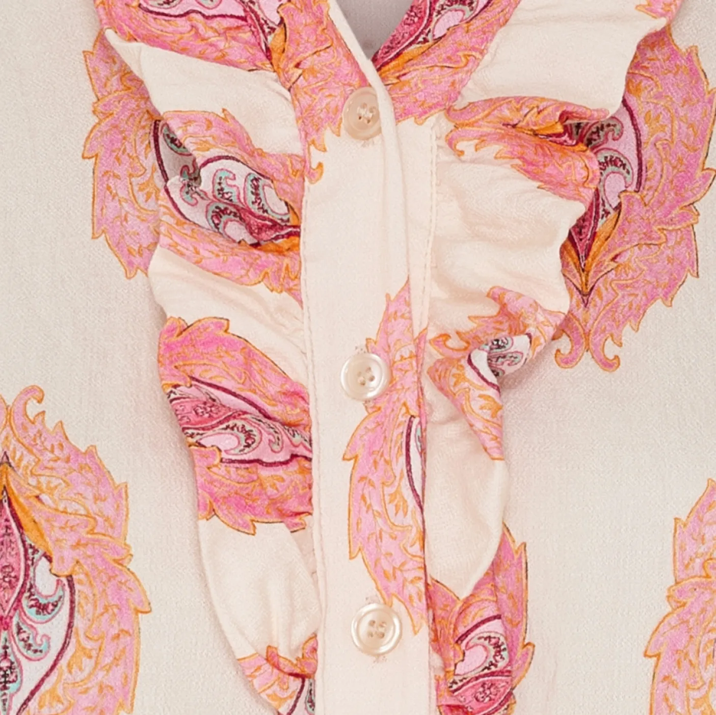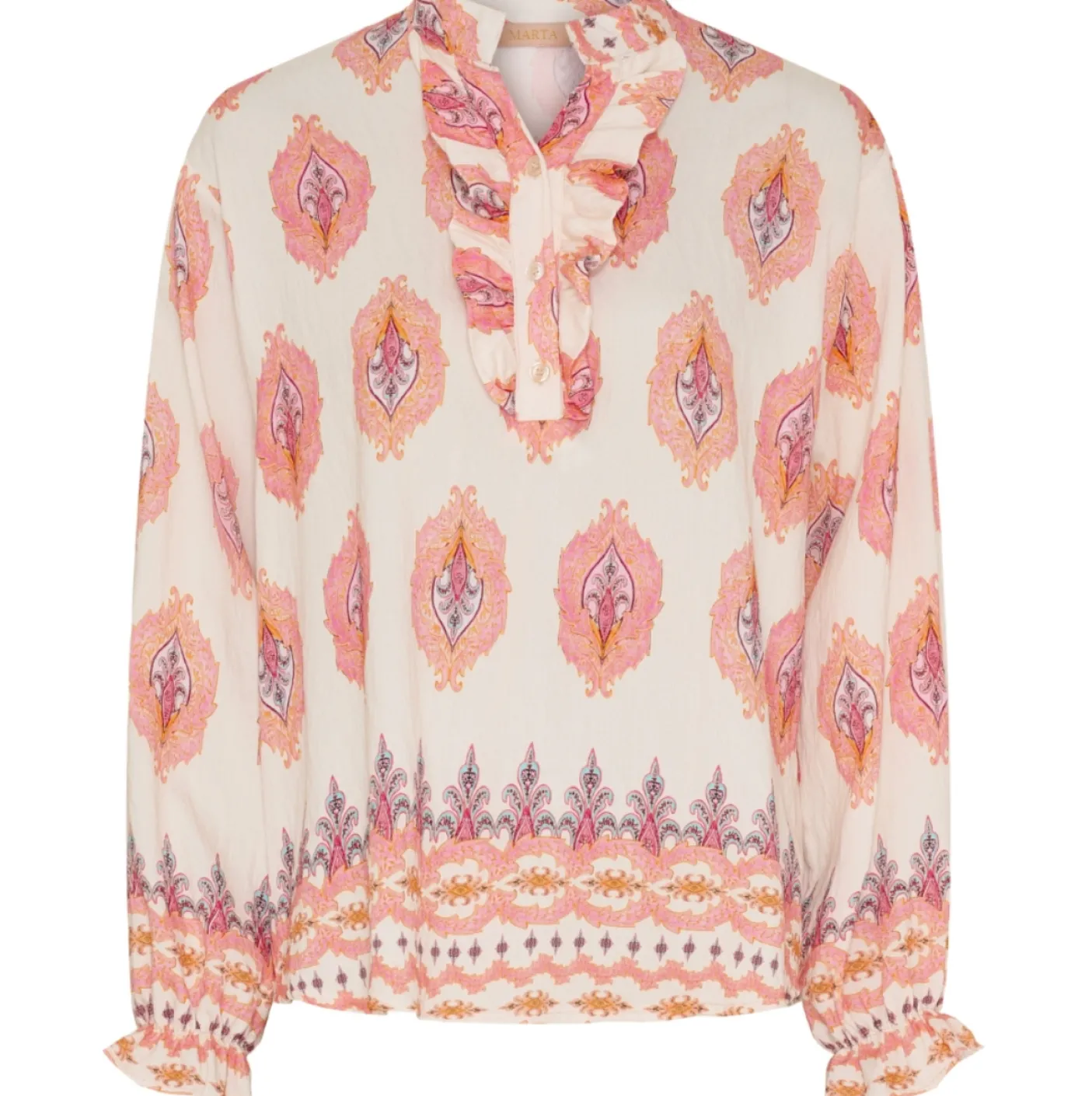 Fin bluse med flæser og smock ved ærmerne.