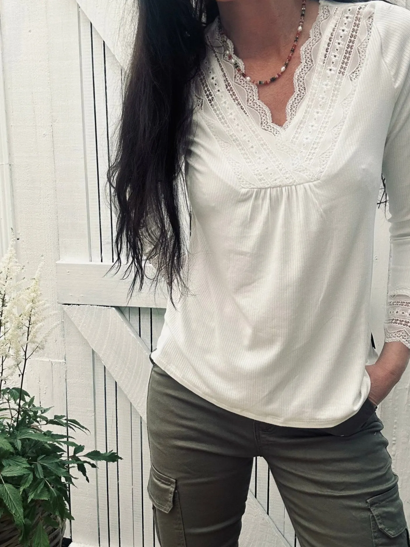 Blusen har blonde på hals og ærmer. Perfekt til både nederdel og bukser.
