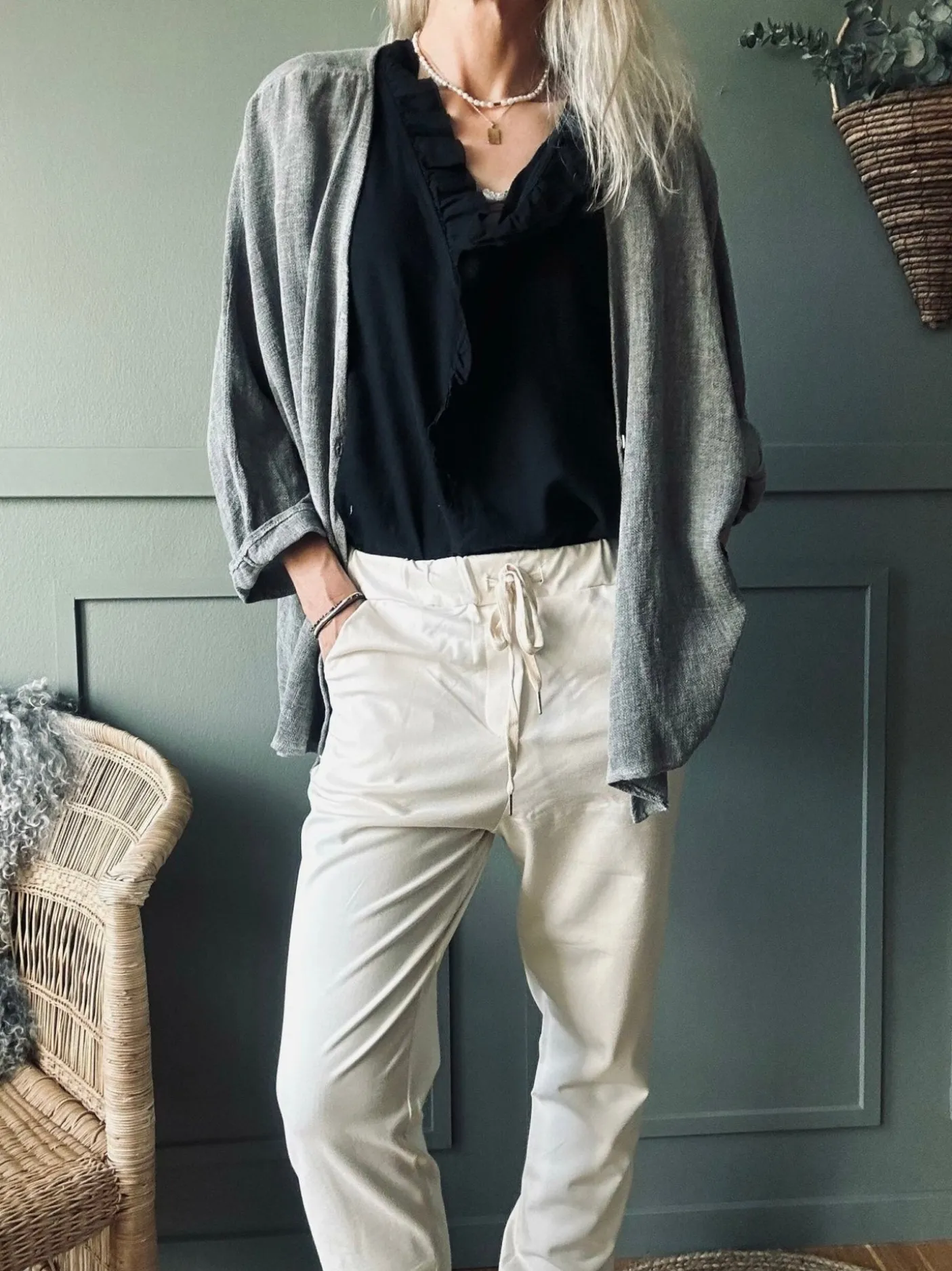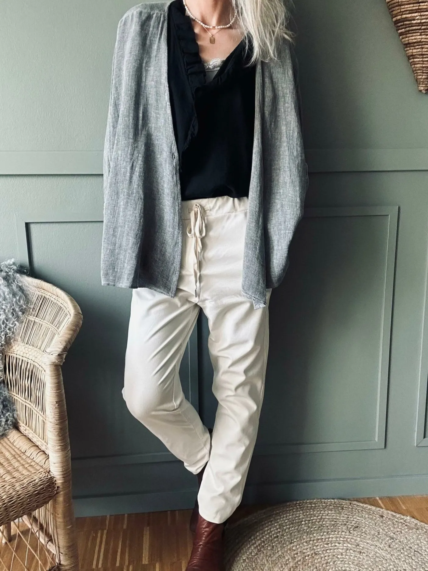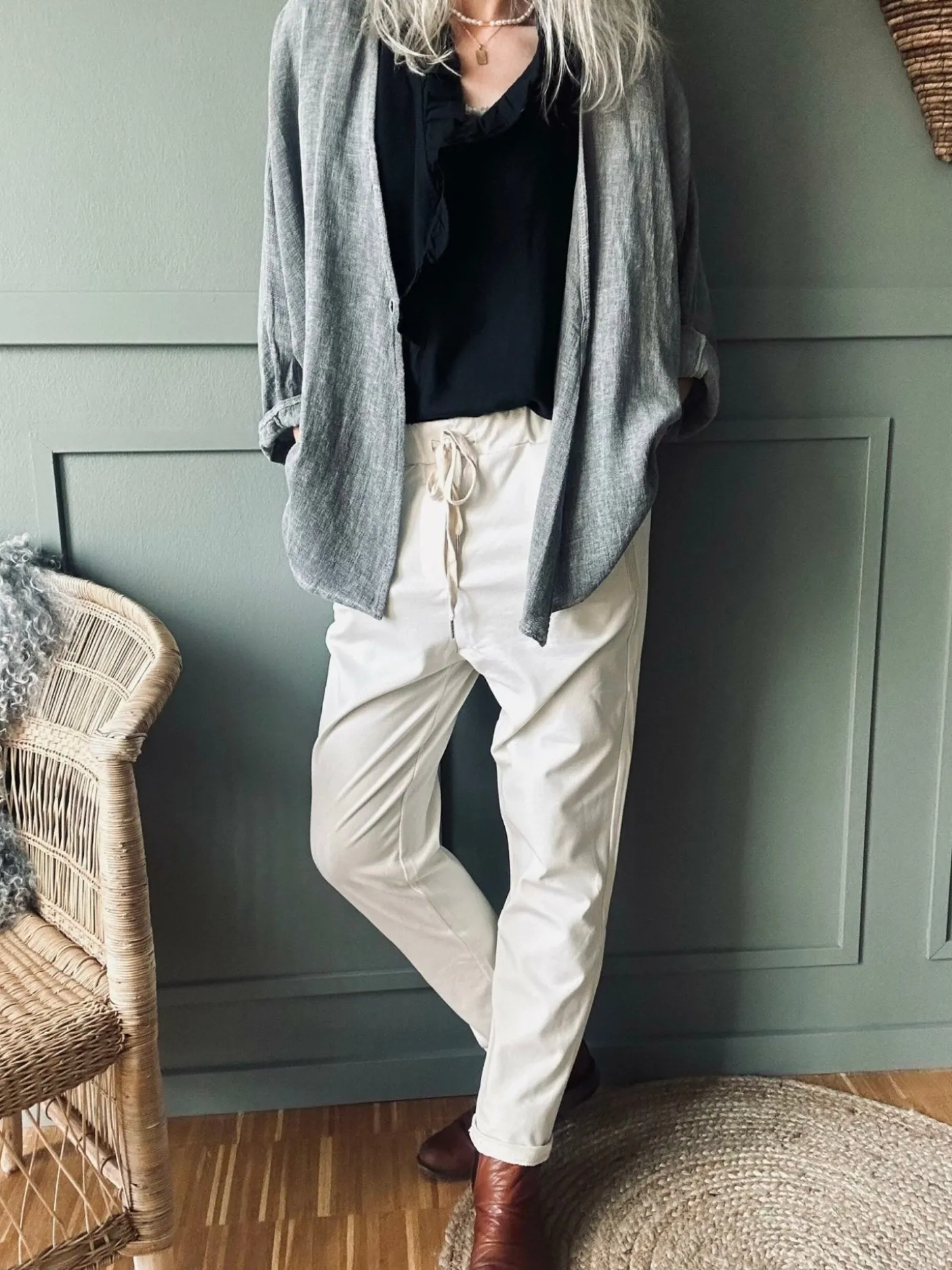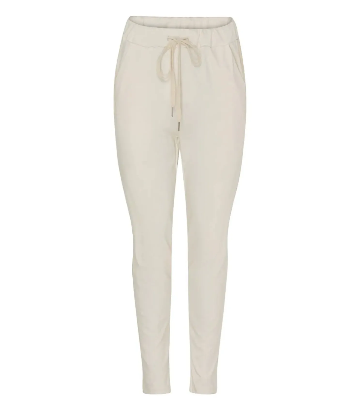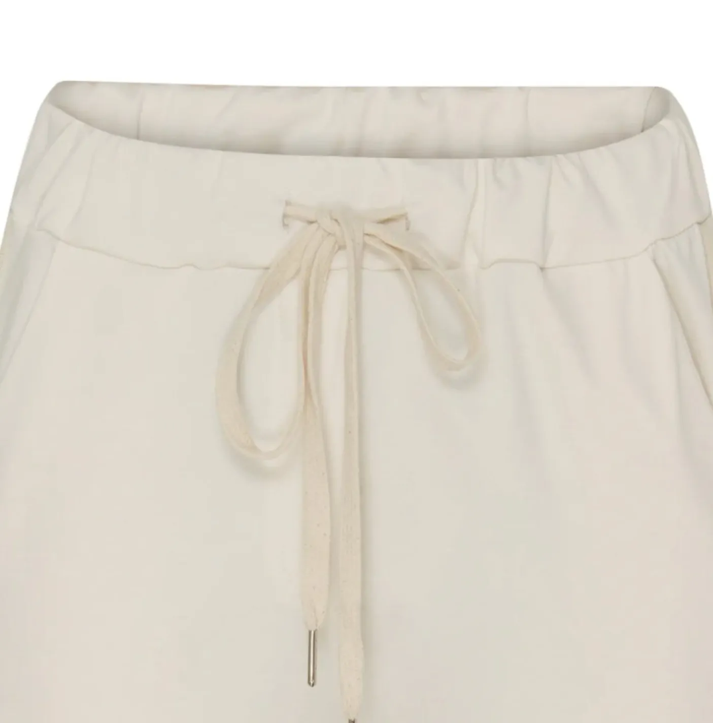 Materialesammensætning: 52% bomuld, 40% nylon og 8% elastan. Den lyse beige tone giver et neutralt og afdæmpet udtryk, der fungerer som en blandbar base i garderoben.