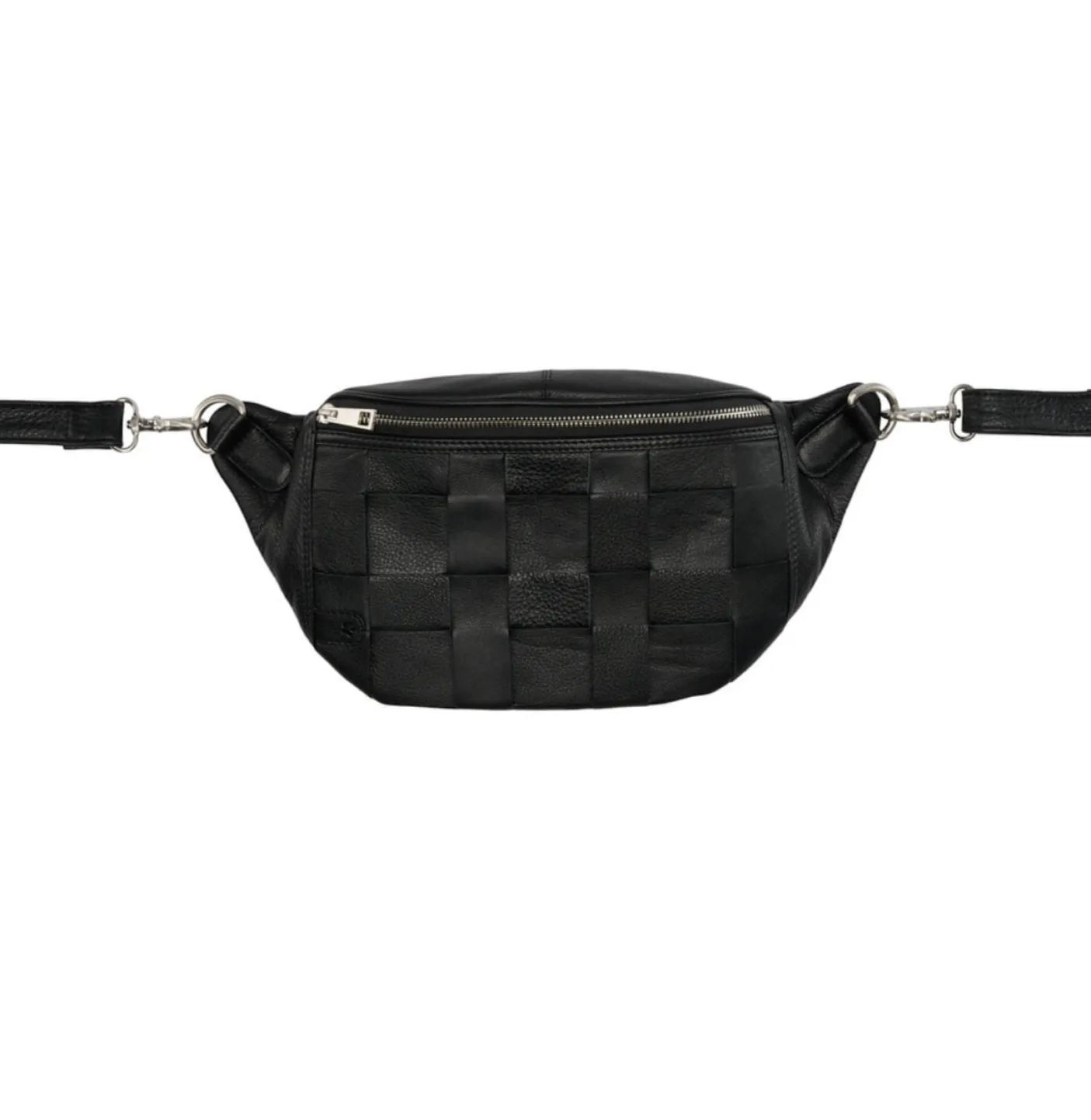 Rummelig bumbag I sort skind med flettet front.