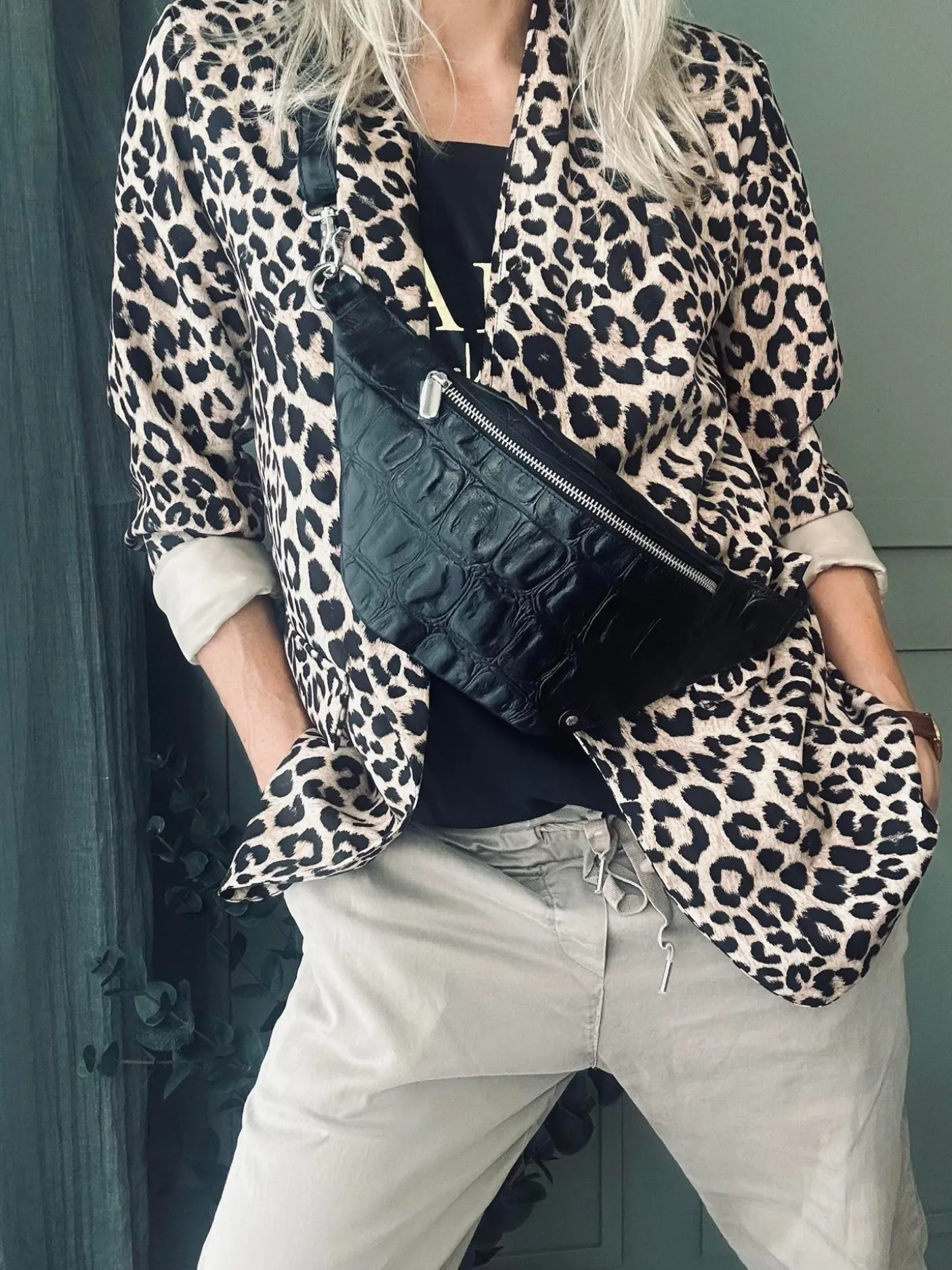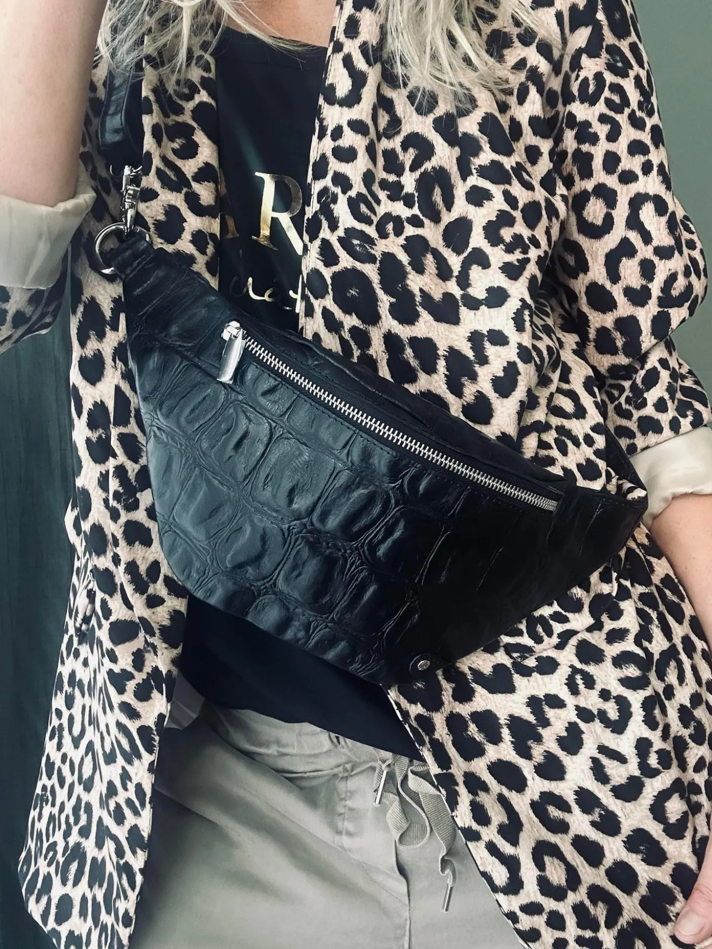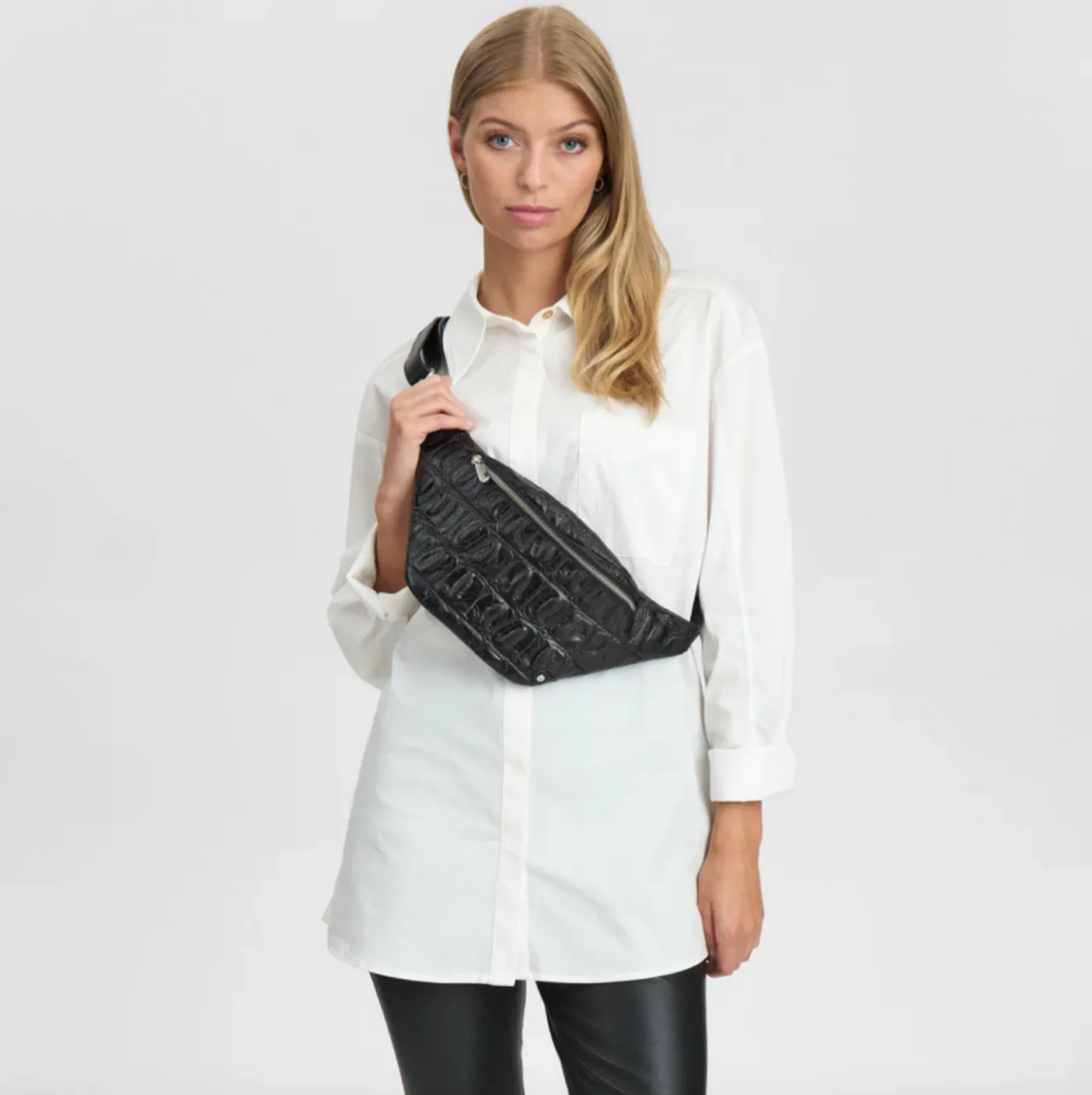 Et skarpt udtryk og gennemtænkt funktionalitet mødes i denne bumbag i eksklusivt croco-præget skind. Den strukturerede overflade giver tasken et sofistikeret og moderne udtryk, der emmer af selvtillid og stil – perfekt til dig, der ønsker en taske med både karakter og klasse.