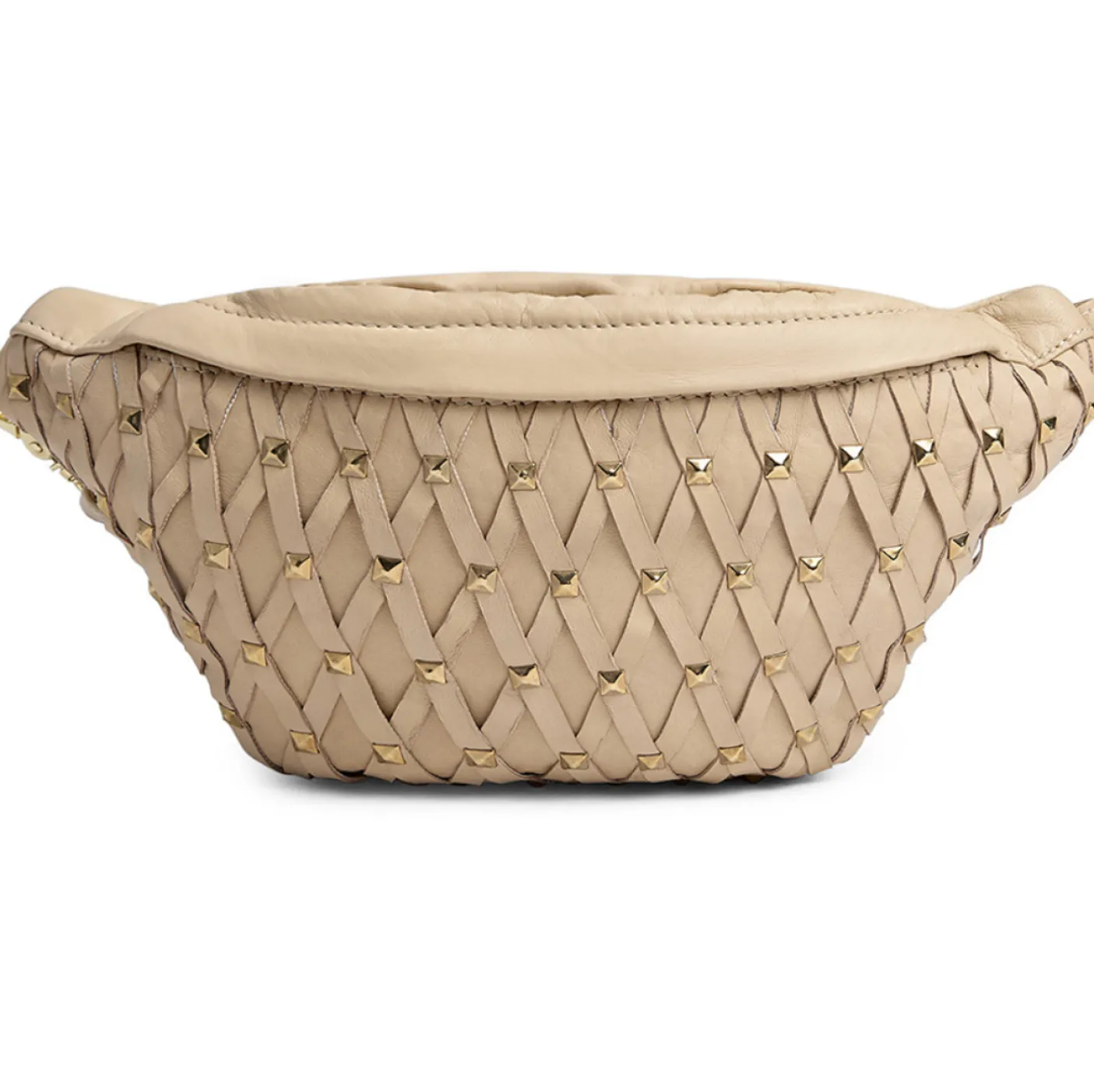 Denne bumbag er både chic og funktionel, perfekt til hverdag, sommerens festivaller og ferier. Tasken måler H: 18 x B: 34 x D: 7,5 cm og er dekoreret med nitter, som giver tasken et kantet, men sofistikeret udseende. Læderdetaljerne krydser smukt henover hinanden og tilføjer ekstra elegance til den iøjnefaldende taske.