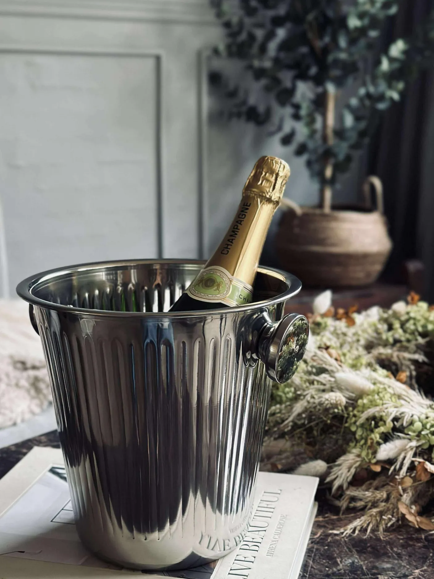 Smuk champagnekøler i rustfri stål.