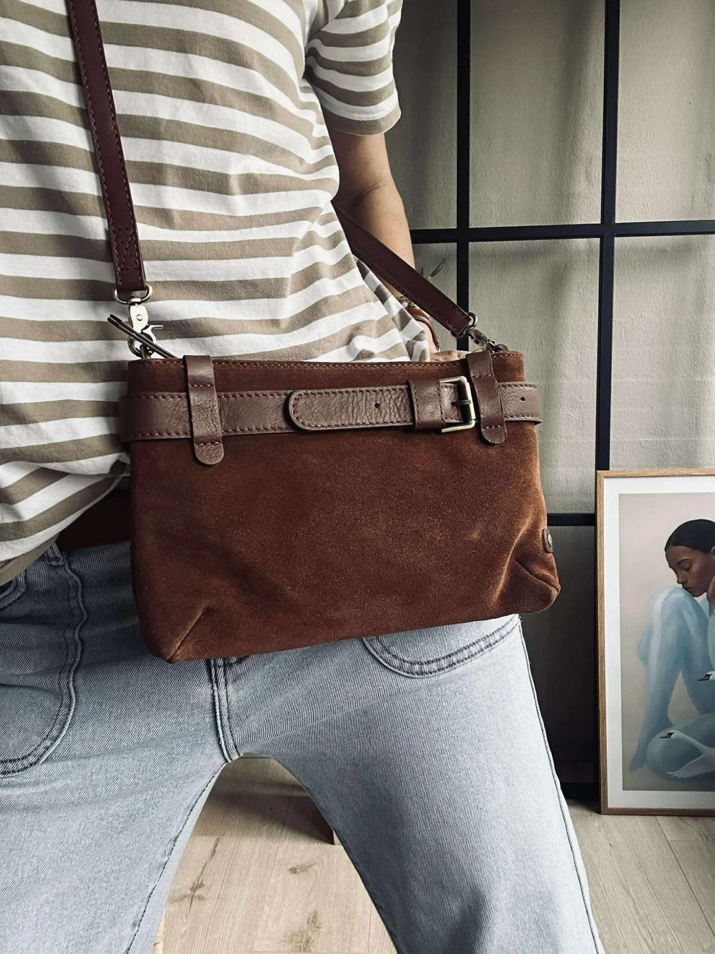 Denne crossover/clutch i smukt ruskind er en perfekt kombination af cool og elegant. Med sin eksklusive skindkvalitet og rå bælte-detalje hele vejen rundt om tasken, får den et unikt og karakterfuldt udtryk, der skiller sig ud.