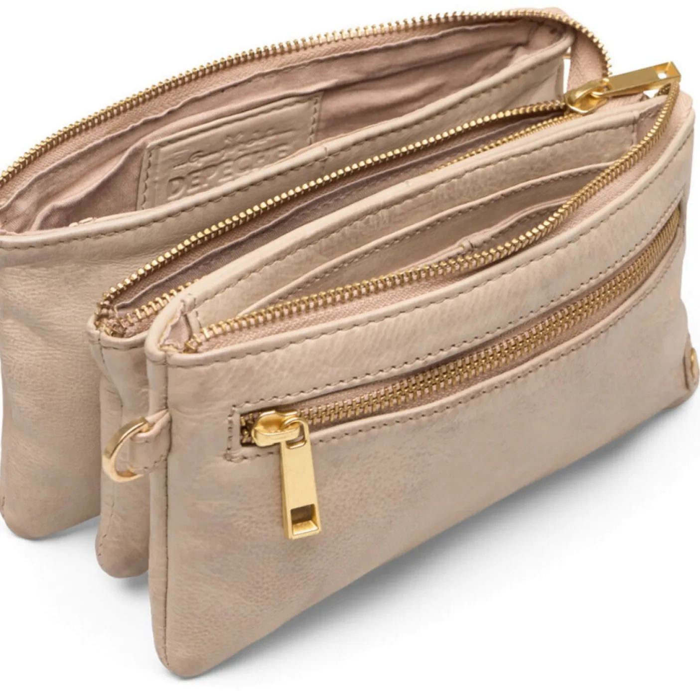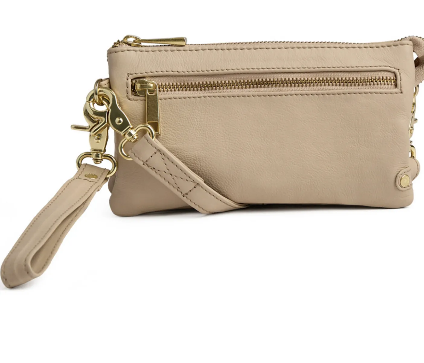Denne clutch har et enkelt men feminint look, bl.a. pga. de fine guldfarvede detaljer. Tasken er dekoreret med en lynlås lomme på fronten.