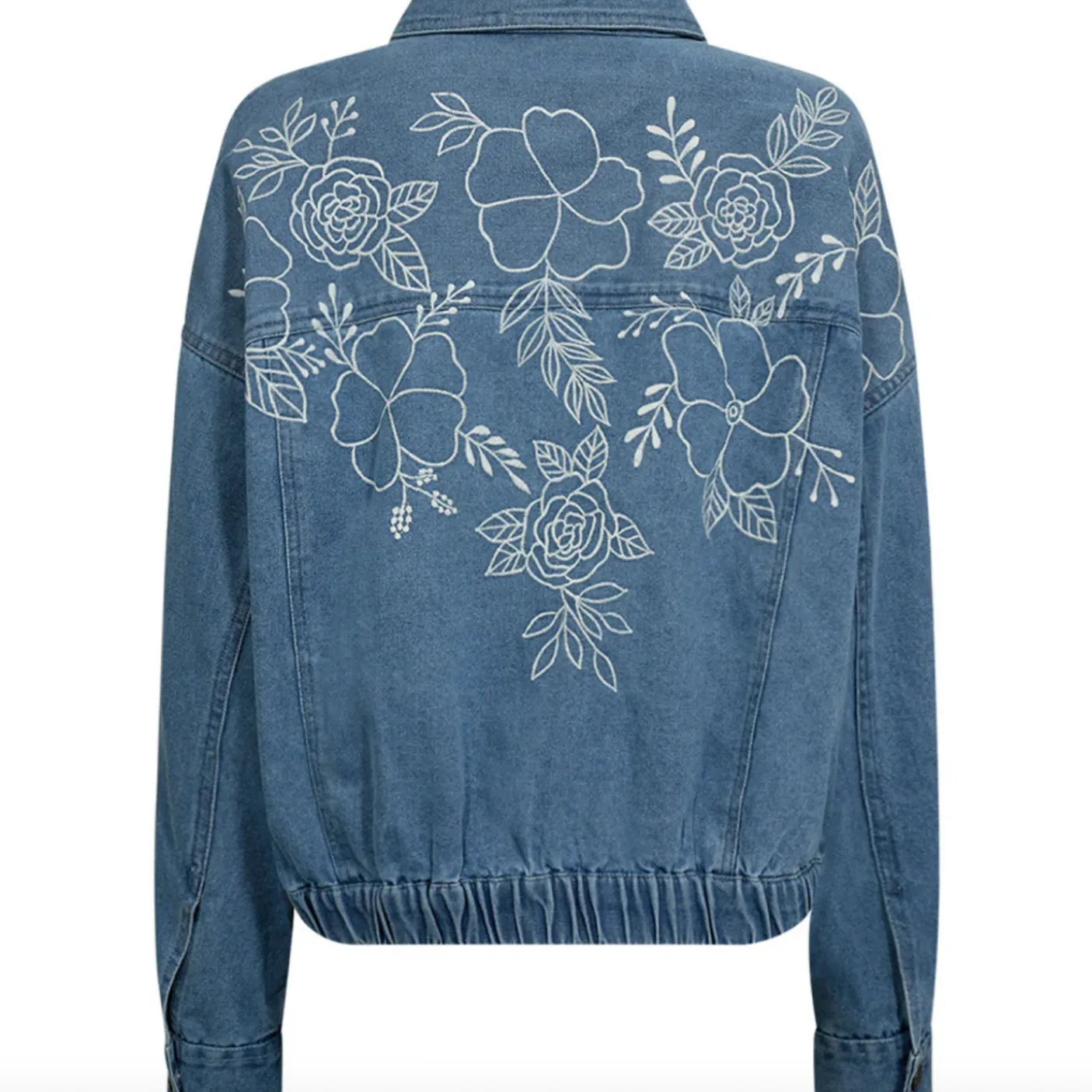 Claire jakken er en moderne klassiker med et råt og cool udtryk, der får et unikt twist med det smukke broderi på ryggen. Jakken har et loose fit og lange ærmer, hvilket giver en afslappet og stilfuld silhuet. De praktiske lommer foran understreger jakkens tidløse design og gør den anvendelig til både hverdag og casual lejligheder. Knaplukningen i fronten tilføjer en ekstra designdetalje, der fuldender looket.
