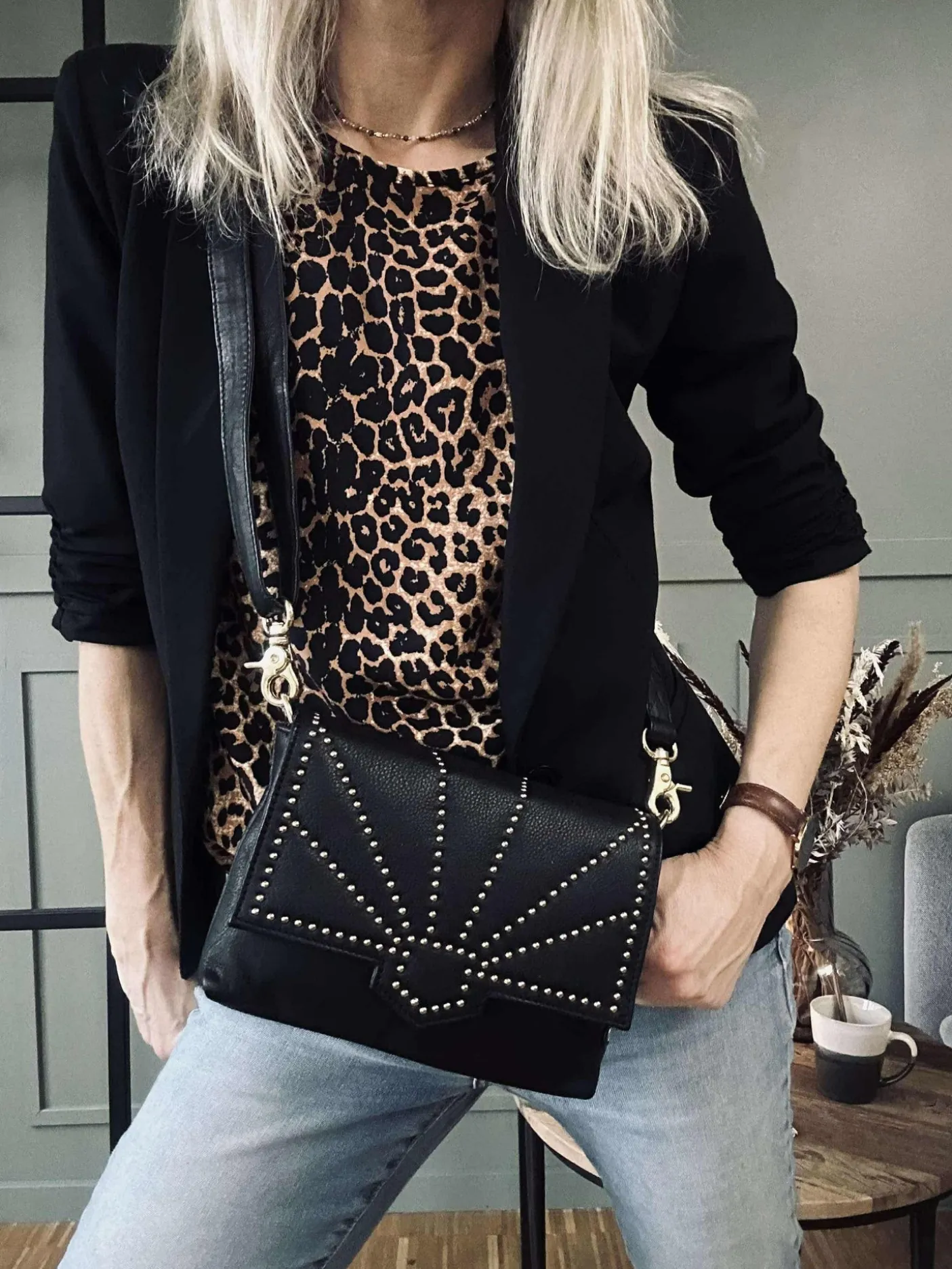 Denne smarte crossover kombinerer et trendy og råt look med et feminint touch. Dekoreret med stilfulde nitter, udstråler tasken en unik og iøjnefaldende stil.