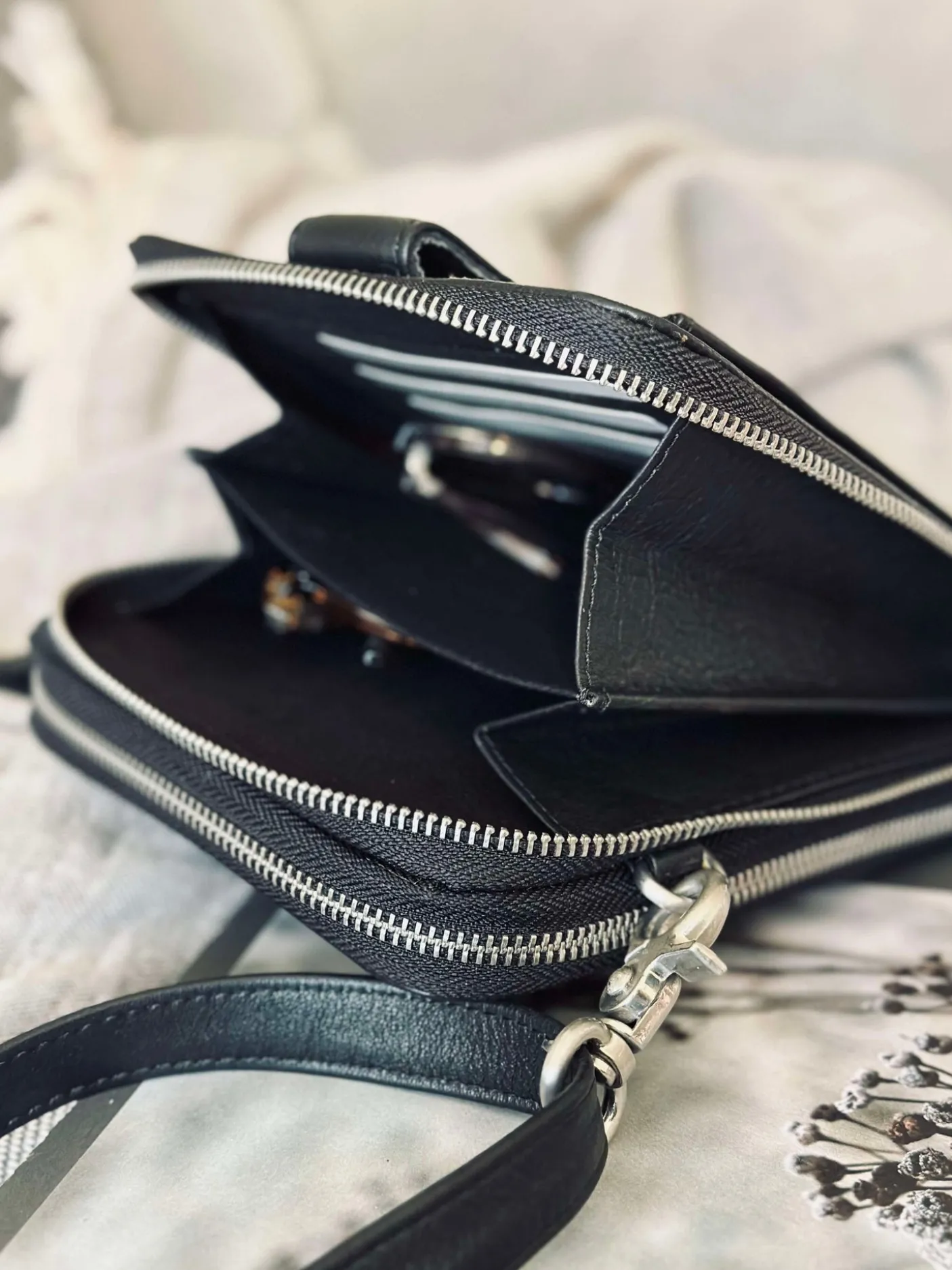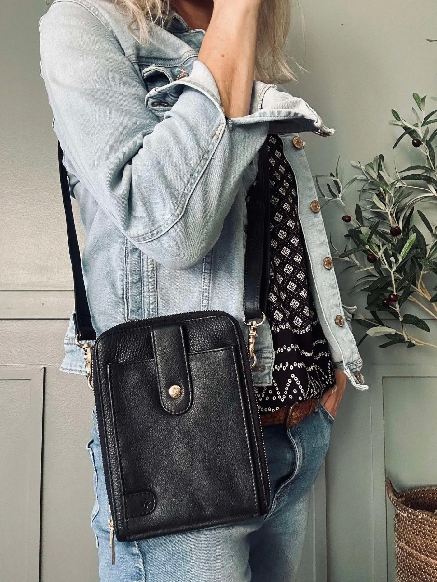 Cross-over multibag i læder med guld lynlås og justerbar rem.