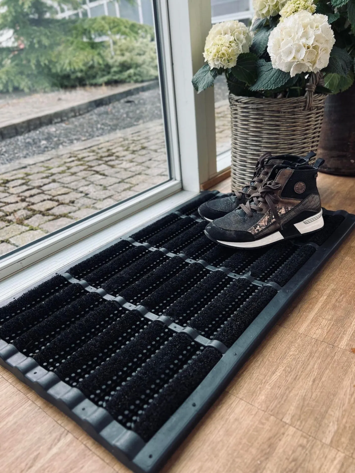 Dørmåtte i sort gummi med børste.