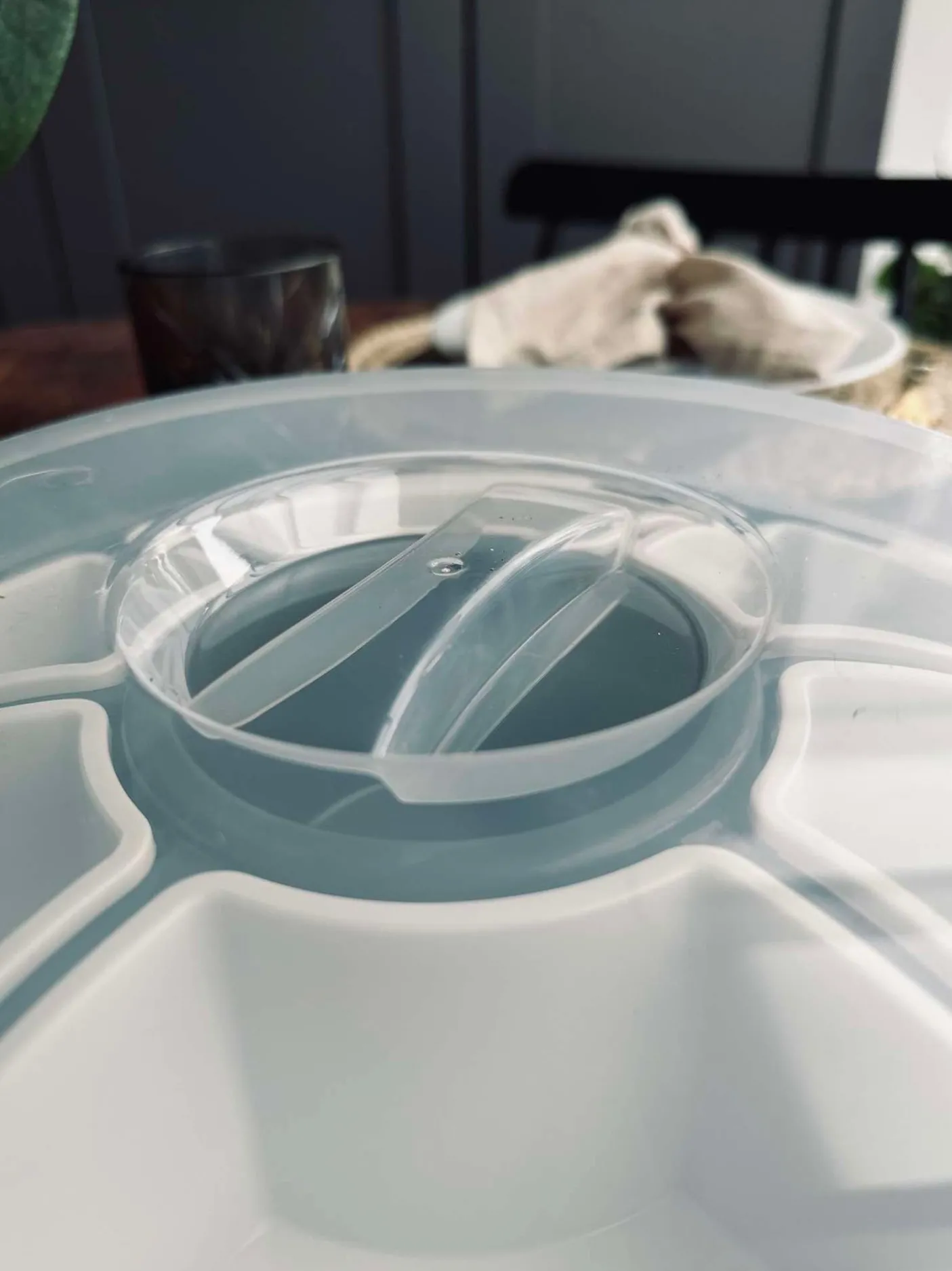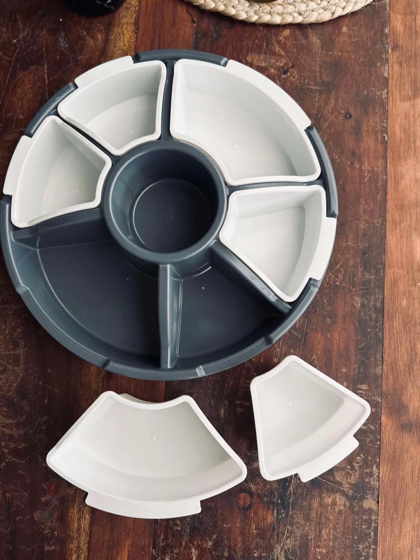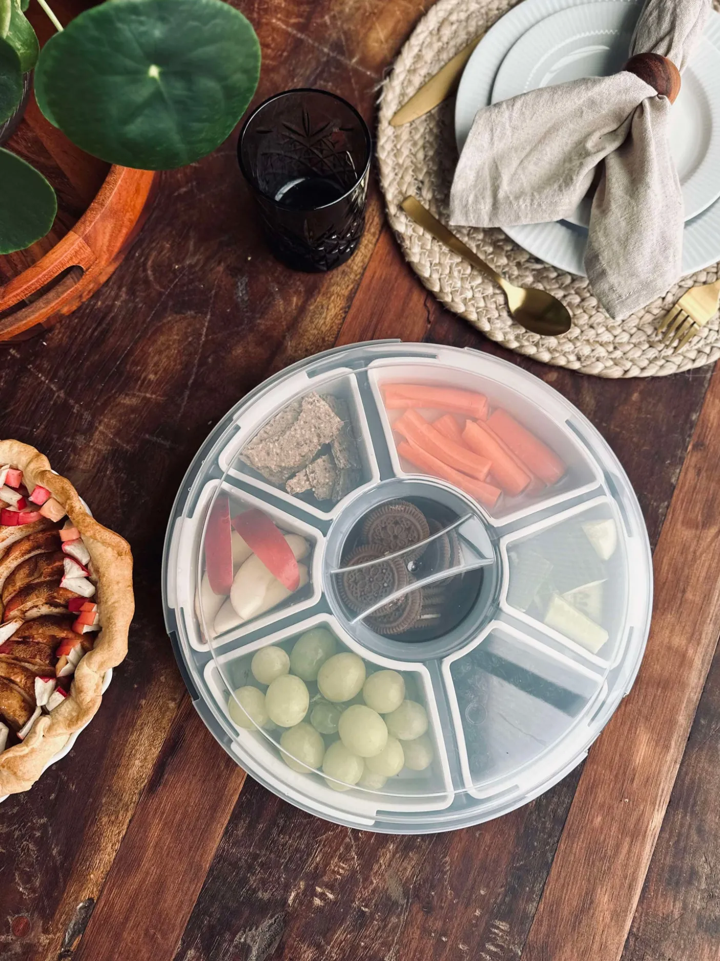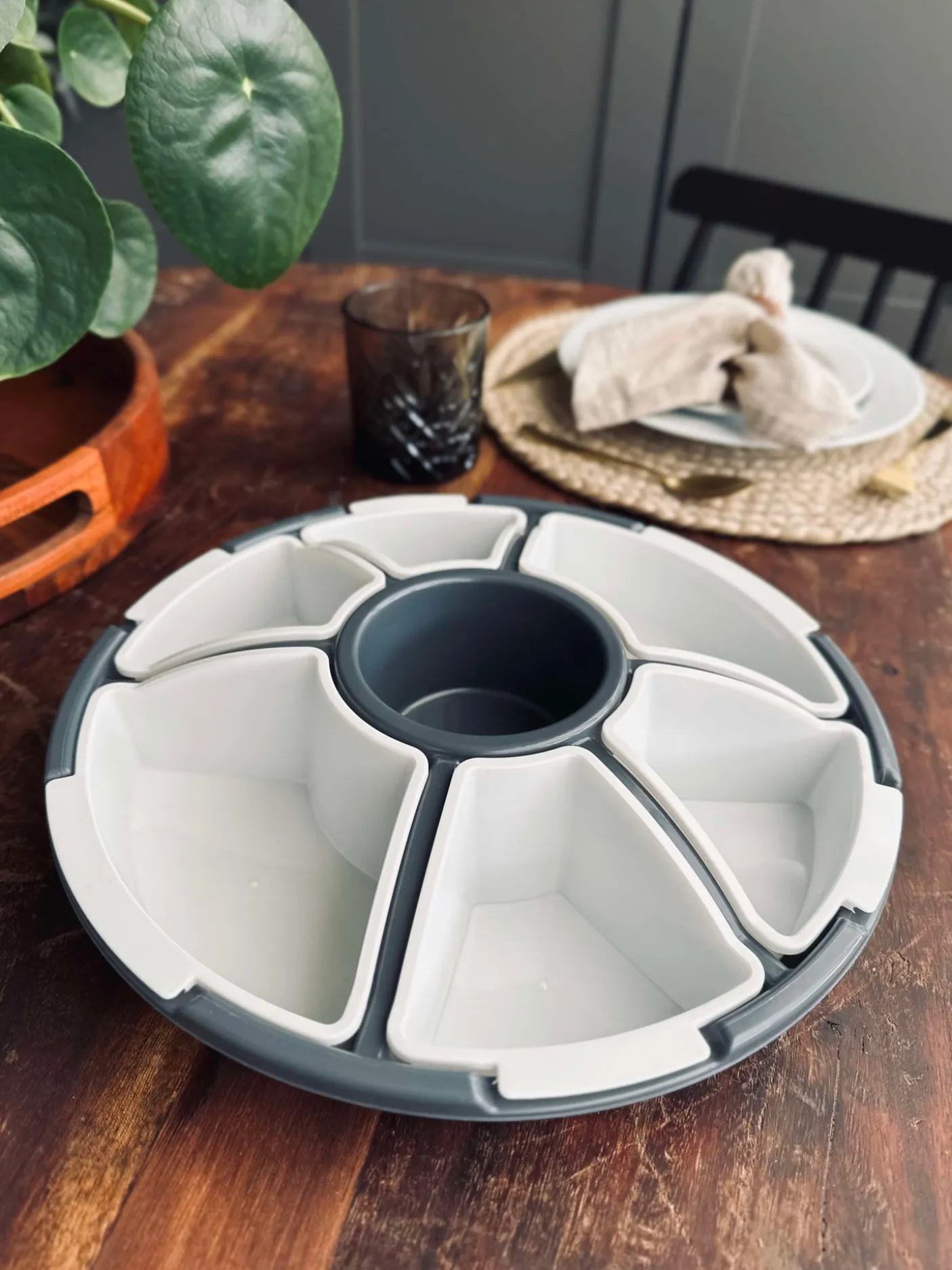 Dette fad med opdeling og låg er en praktisk snack tallerken til servering af små anretninger, snacks og tapas. Det ensfarvede, hvide udtryk gør det nemt at bruge på både hverdagens bord og til gæster. Låget hjælper med at holde indholdet samlet, når du vil sætte fadet frem.