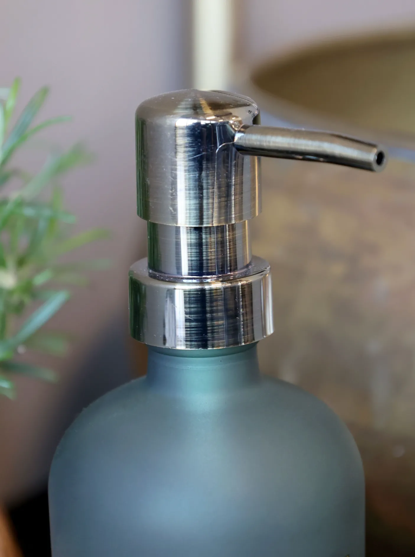 Dispenser i glas med tekst.