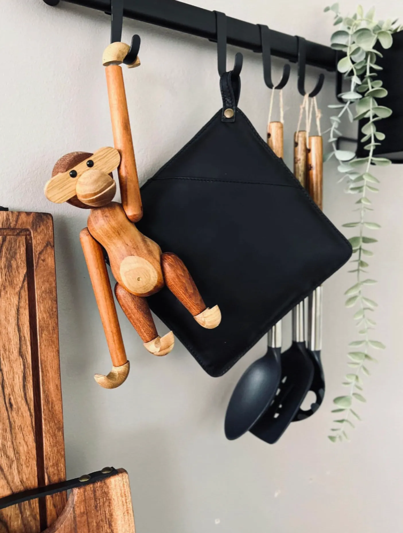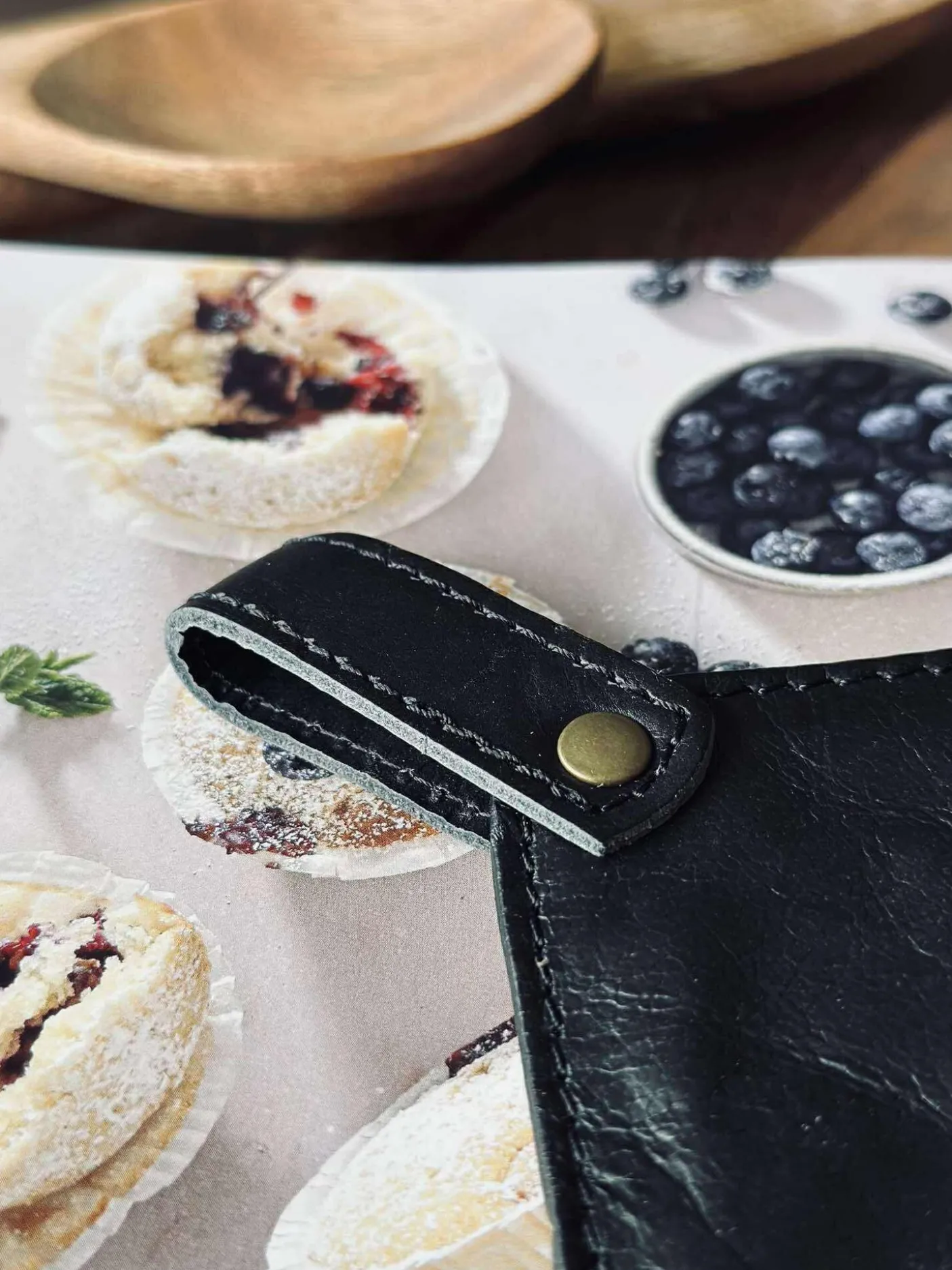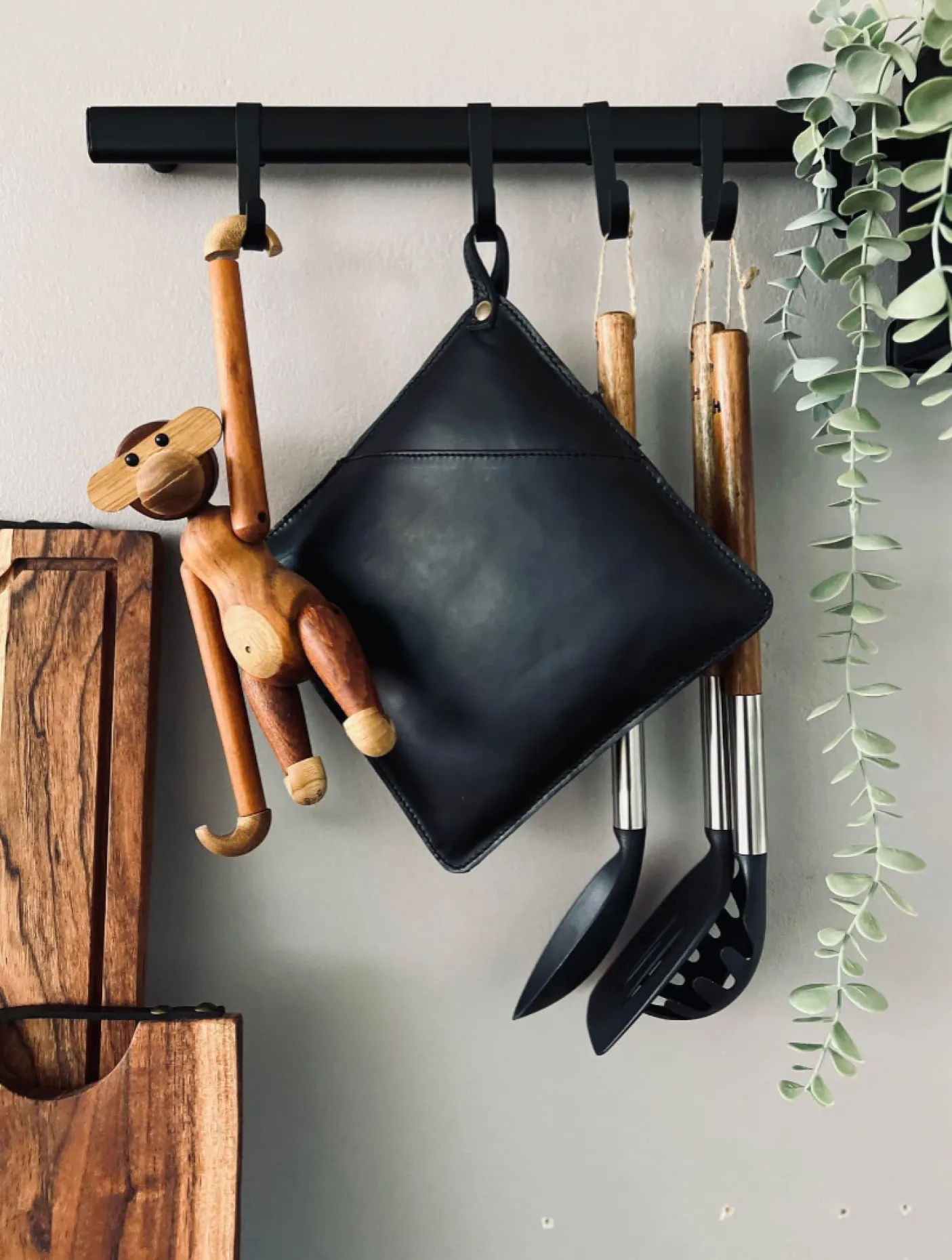 Grydelap med lomme i sort skind.
