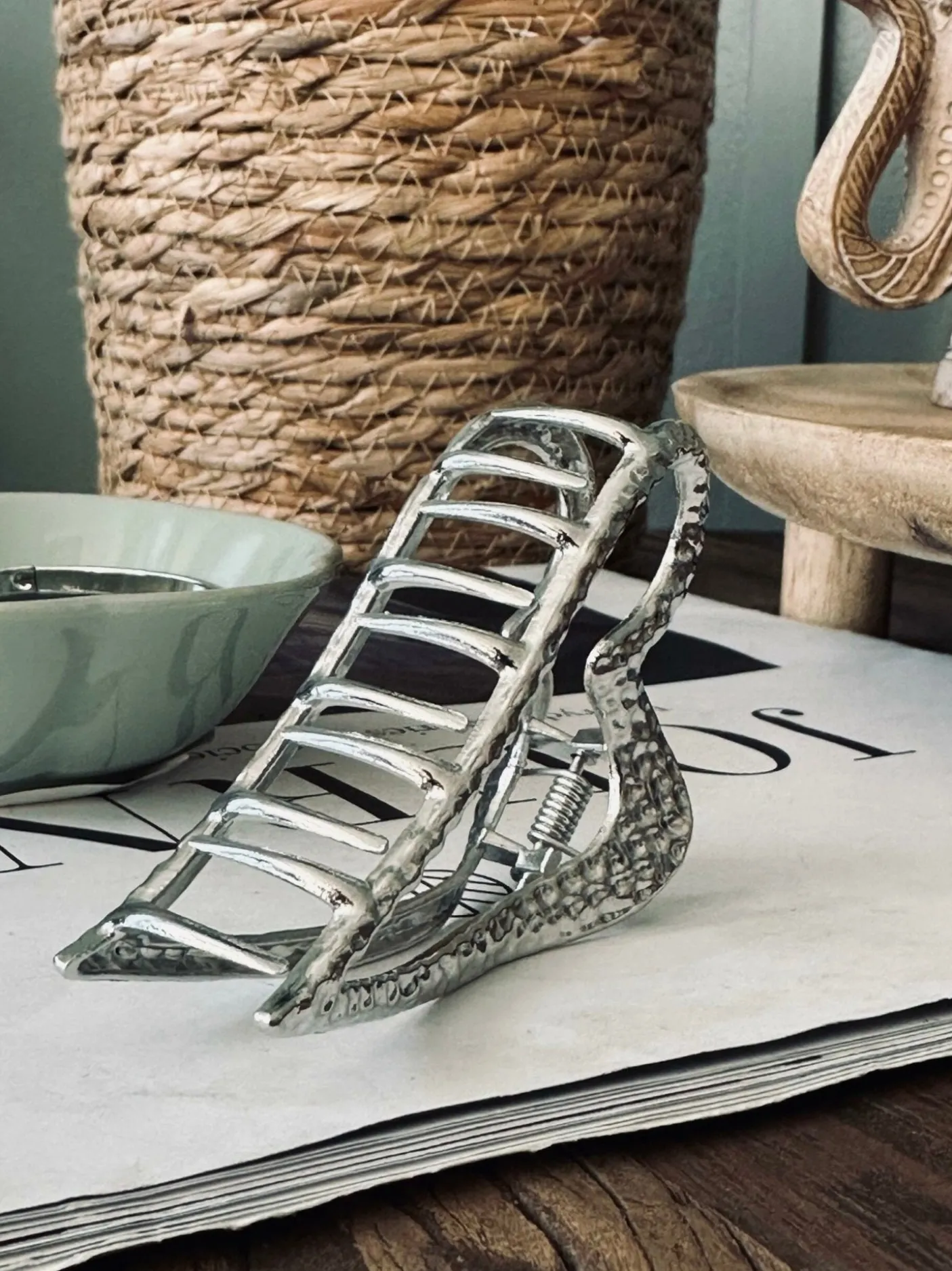 Hårklemmen er fremstillet i metal og har en sølvfarvet overflade. Det strukturerede udtryk giver et fint spil i klemmen uden at virke prangende.