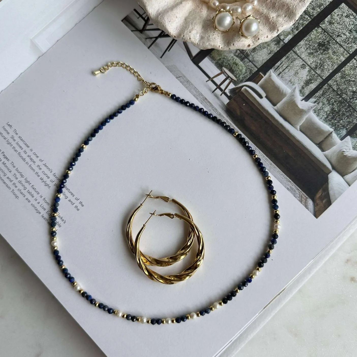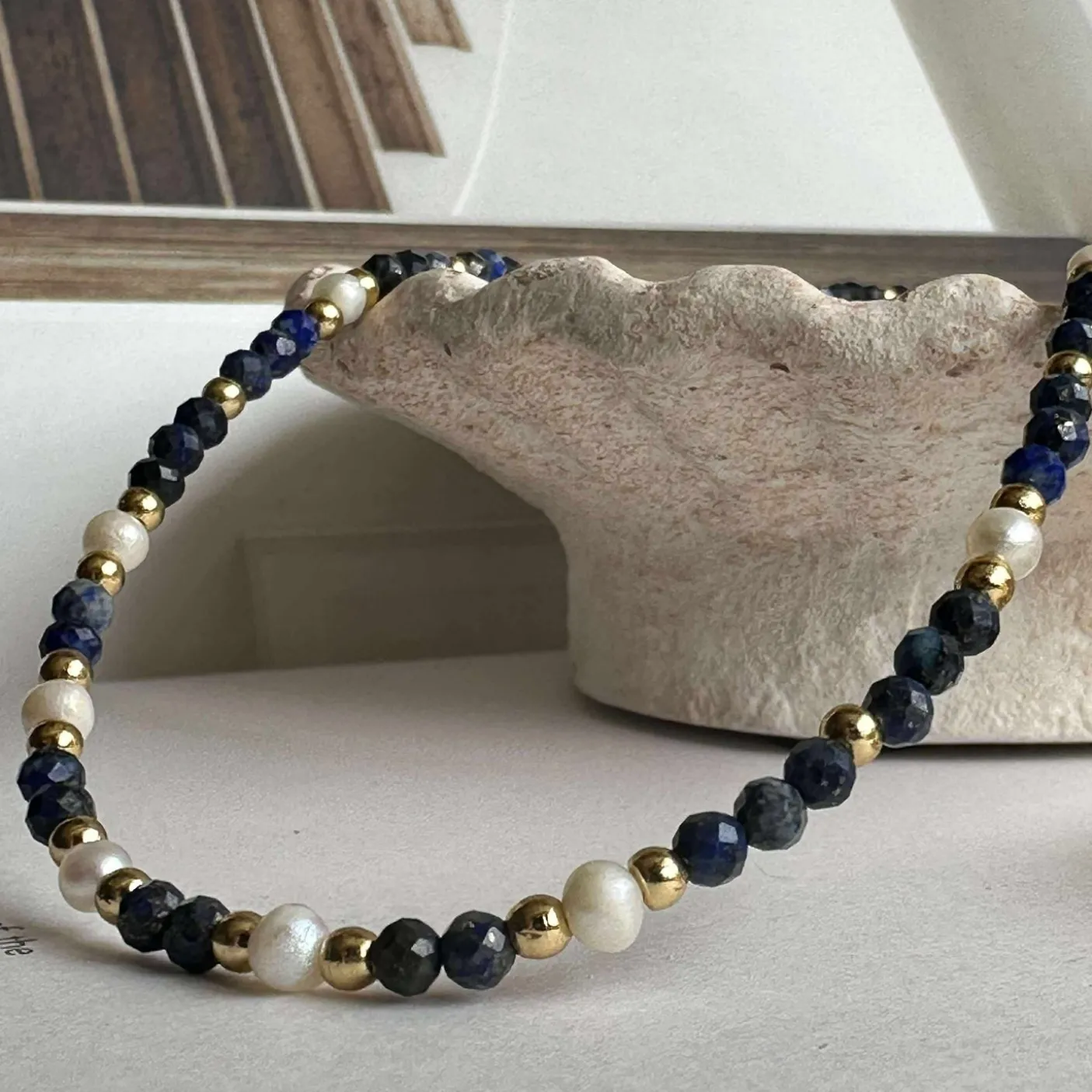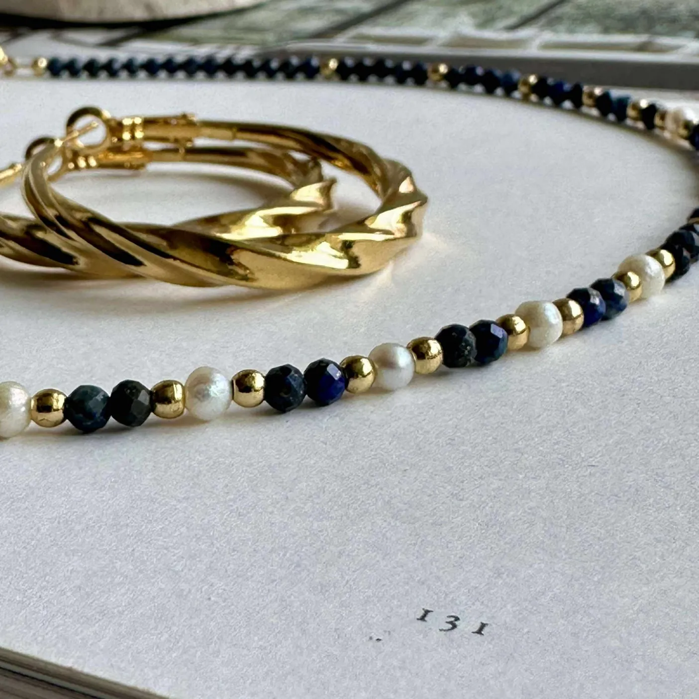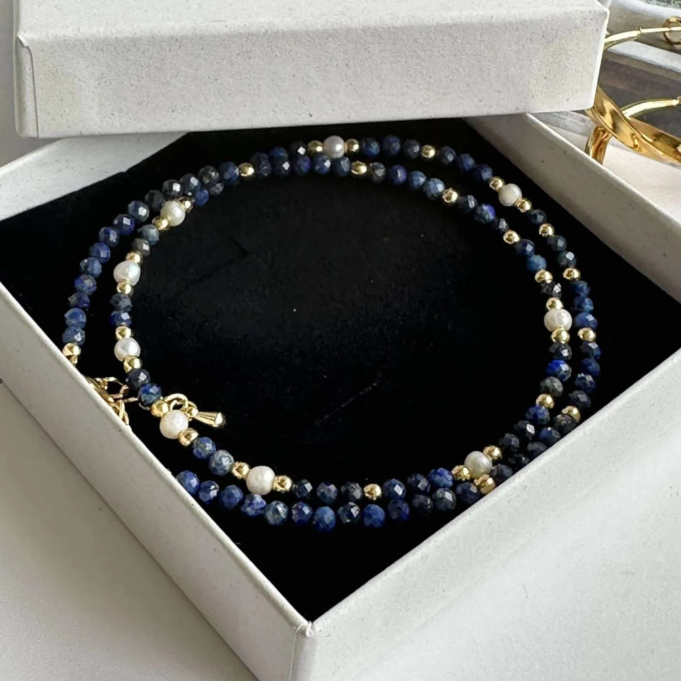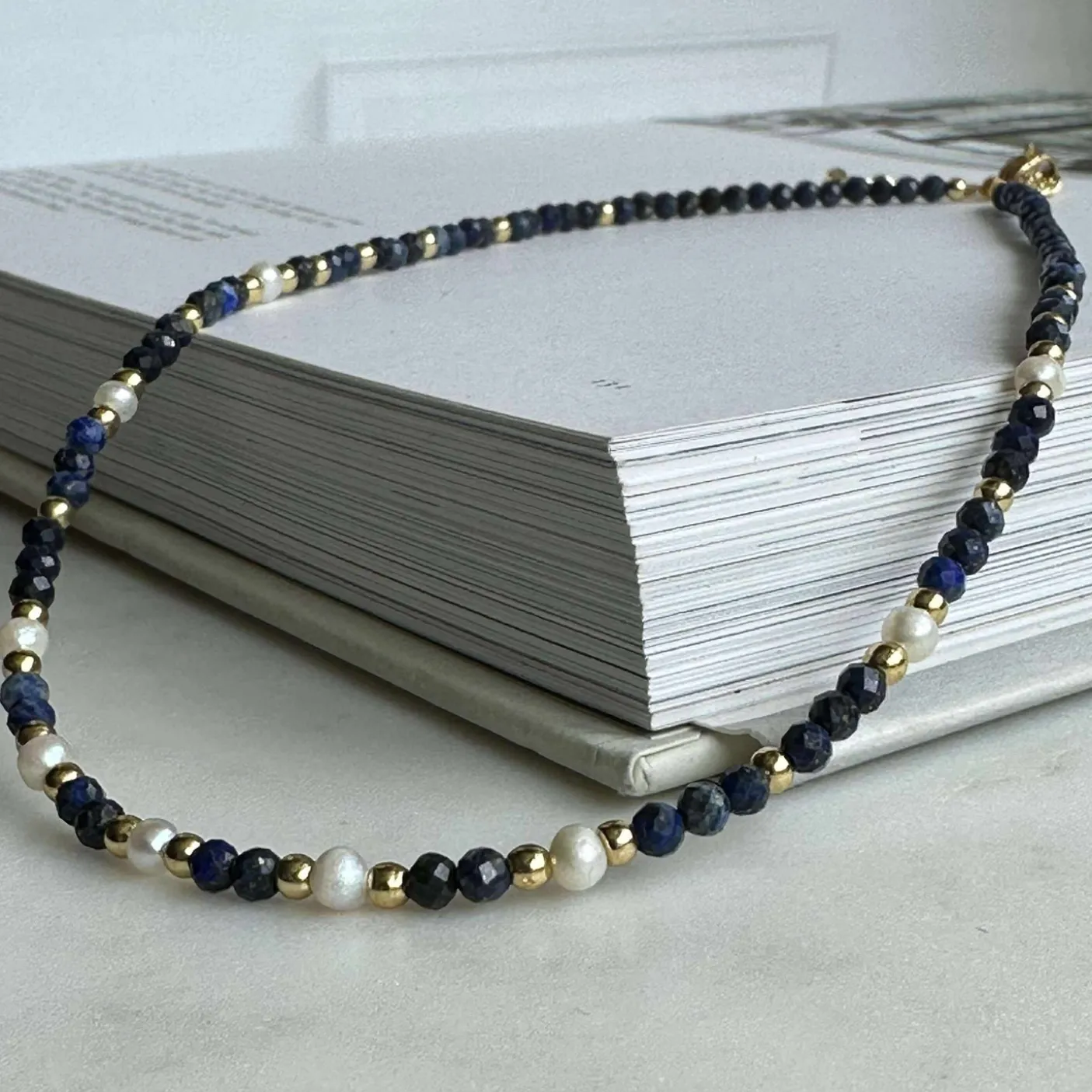 Smuk halskæde betrukket med de smukkeste, små og facetterede natur-sten og med ægte ferskvandsperler. De 3 mm facetterede sten er i royal blå nuancer.