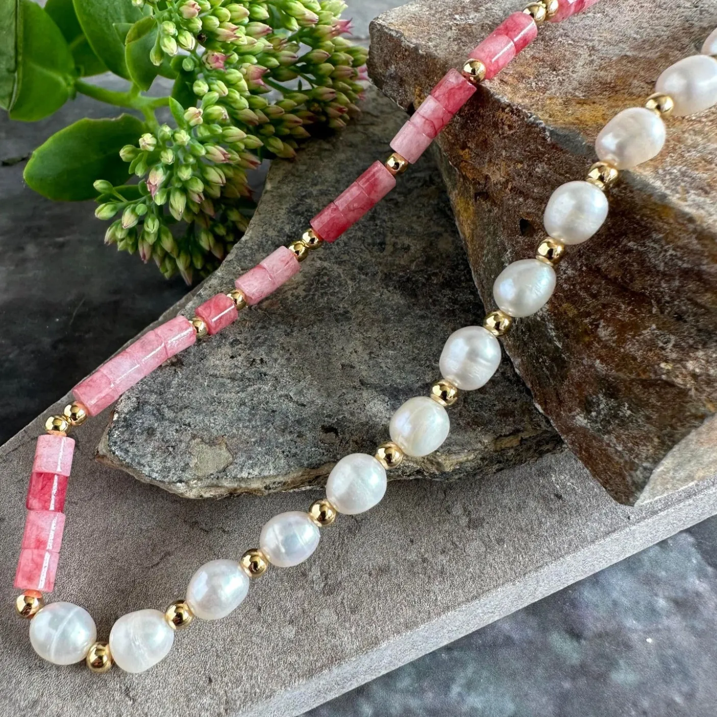Halskæde med ægte og unikke ferskvandsperler. Isat en smykkelås, fremstillet i messing forgyldt 18K.