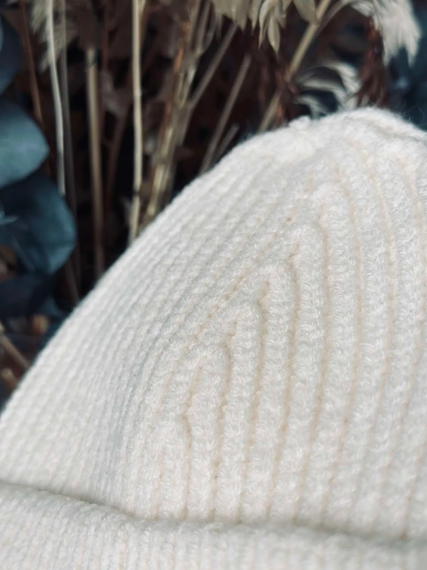 Den er lavet som en hvid beanie, der fungerer som en enkel vinterhue i garderoben, når du vil have et neutralt og tidløst valg.
