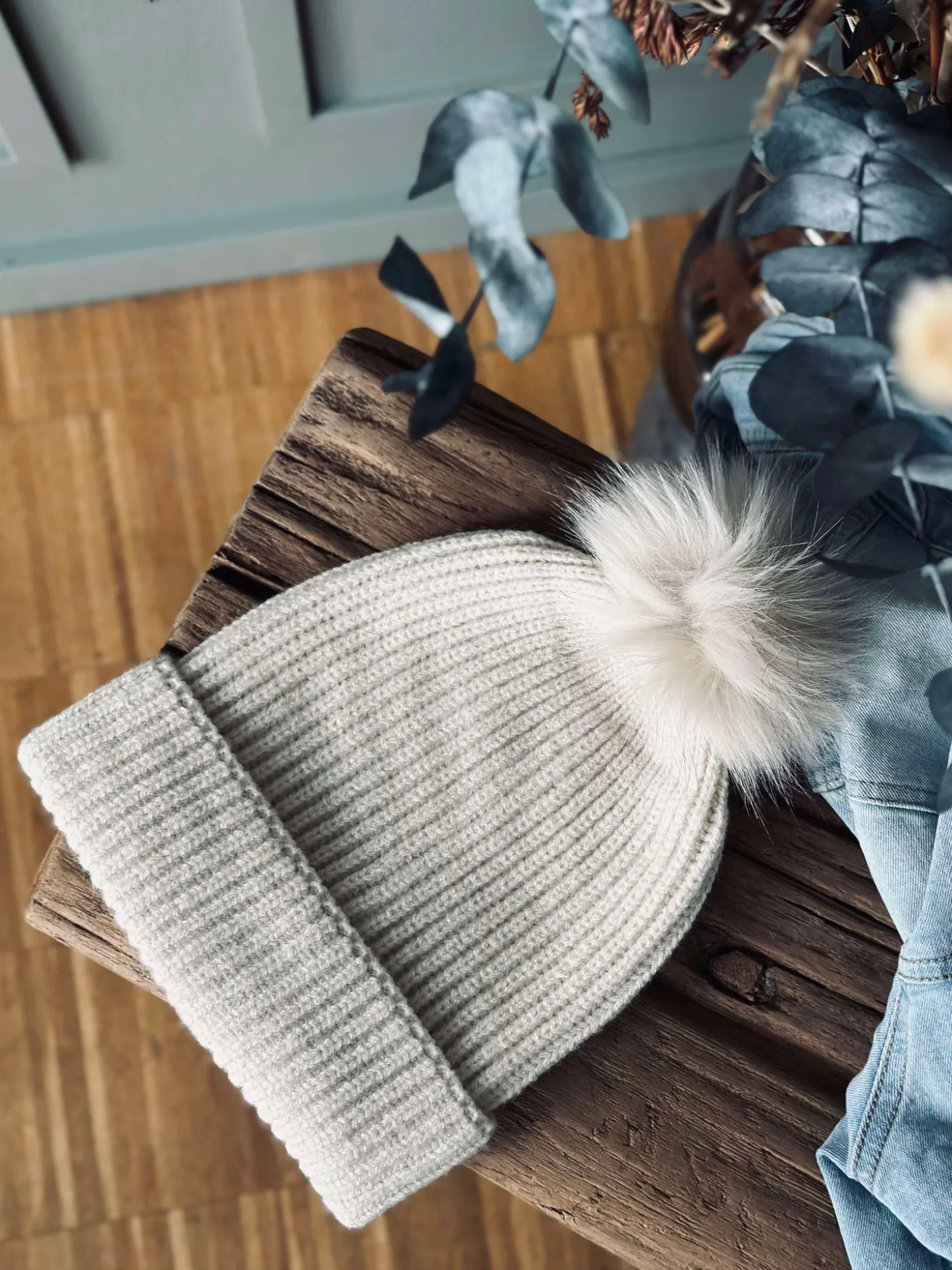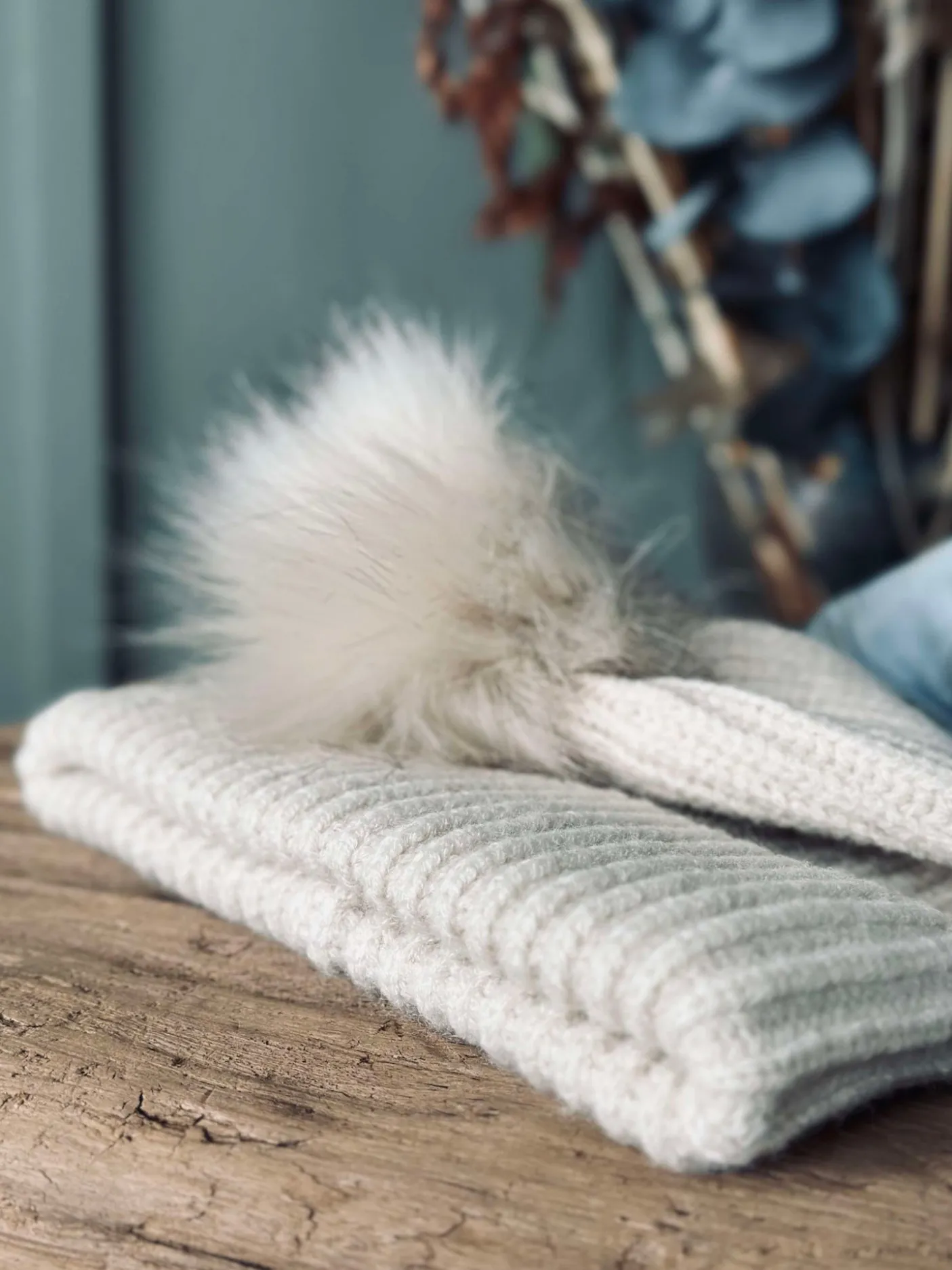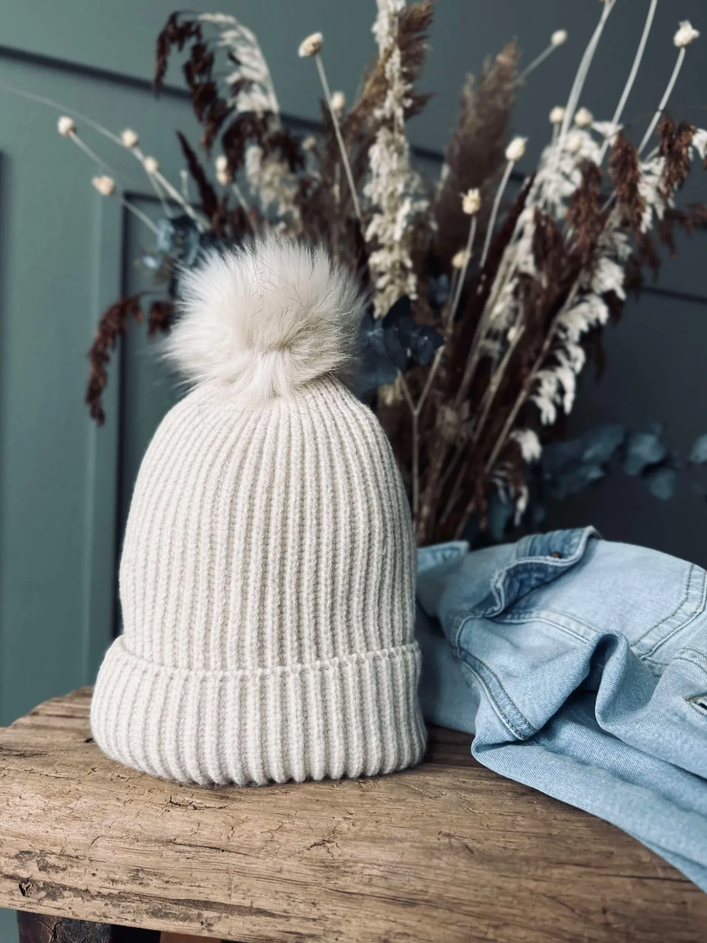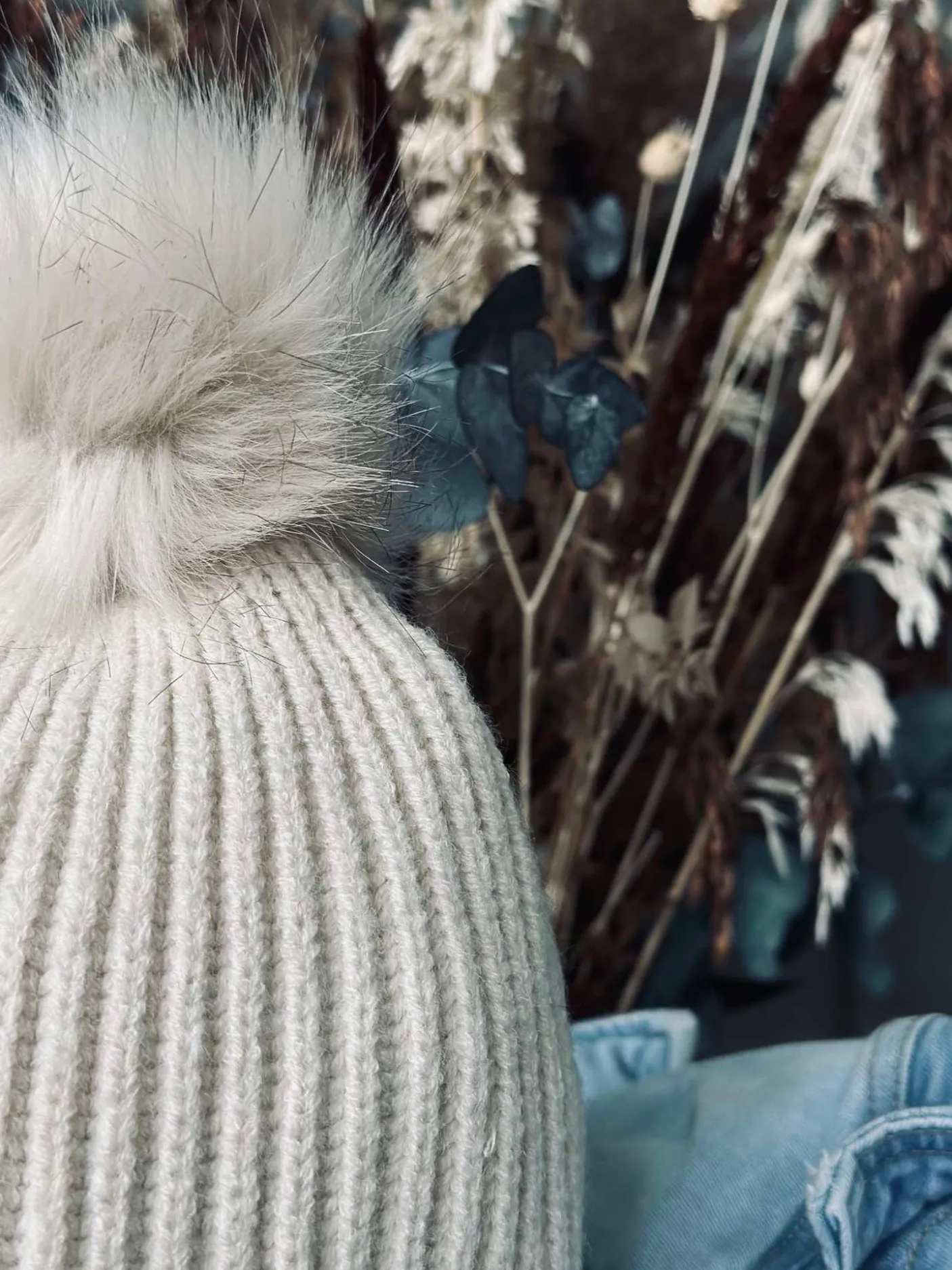 Hue med kvast – Creme er en strikket vinterhue i uld med et enkelt, ensfarvet udtryk. Den dekorative kvast giver huen et roligt, afdæmpet look, der er nemt at style til både frakker og jakker.