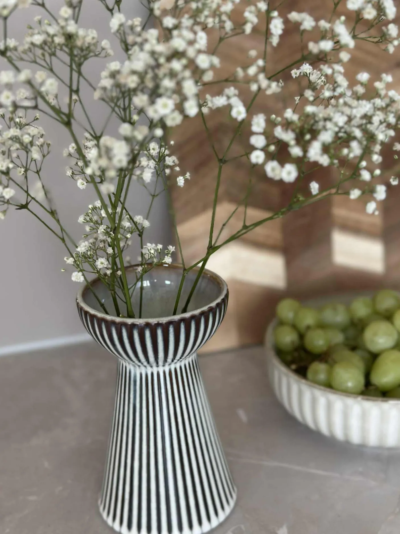 Smuk vase i stentøj. Vasen kan både benyttes som lysestage til bloklys og almindelig vase – den vil især være fordelagtig til hyacinter.