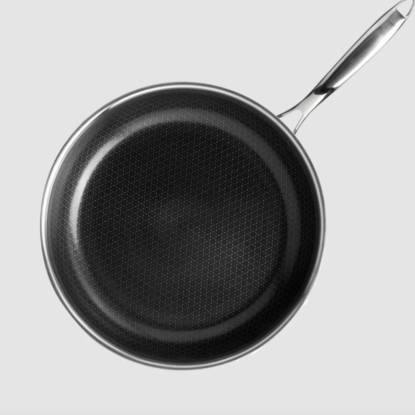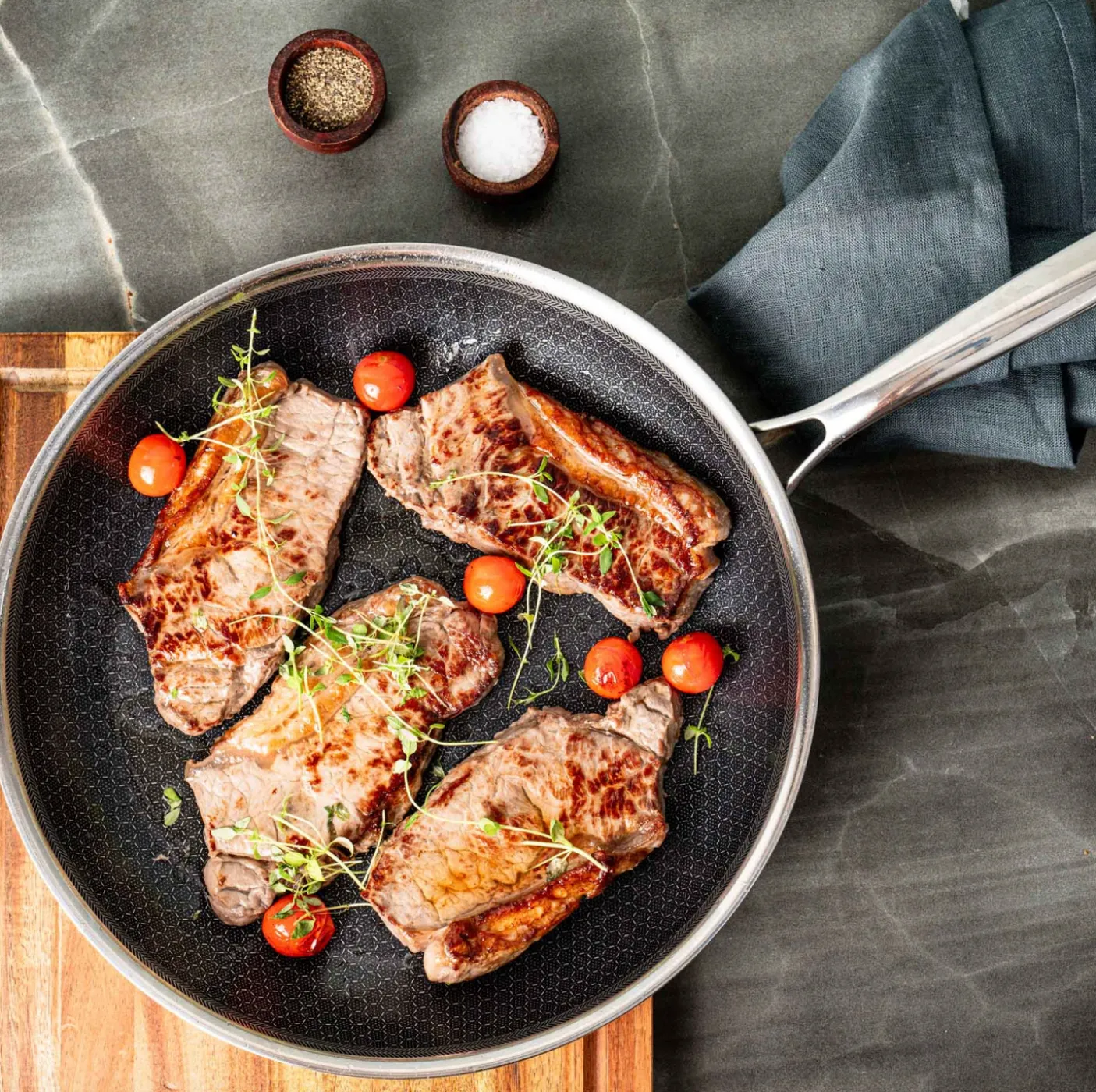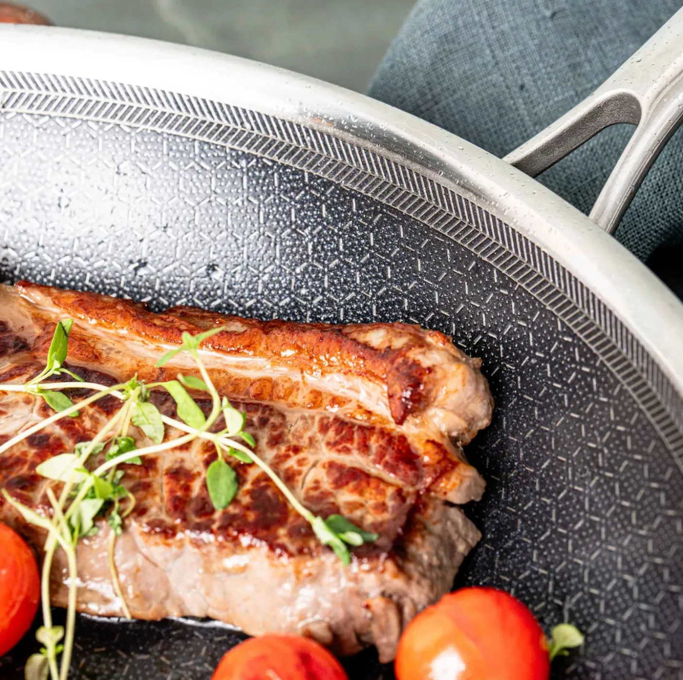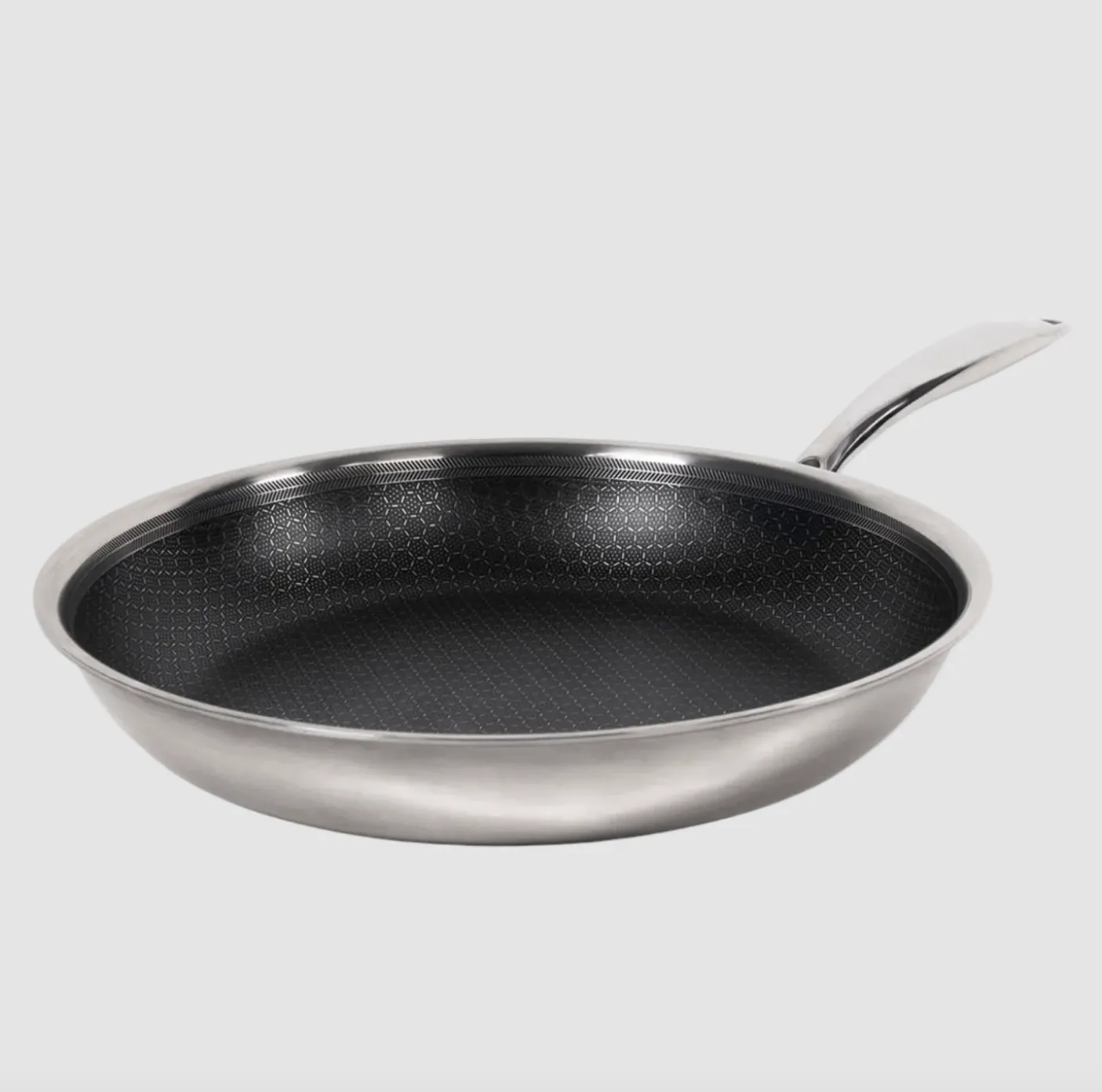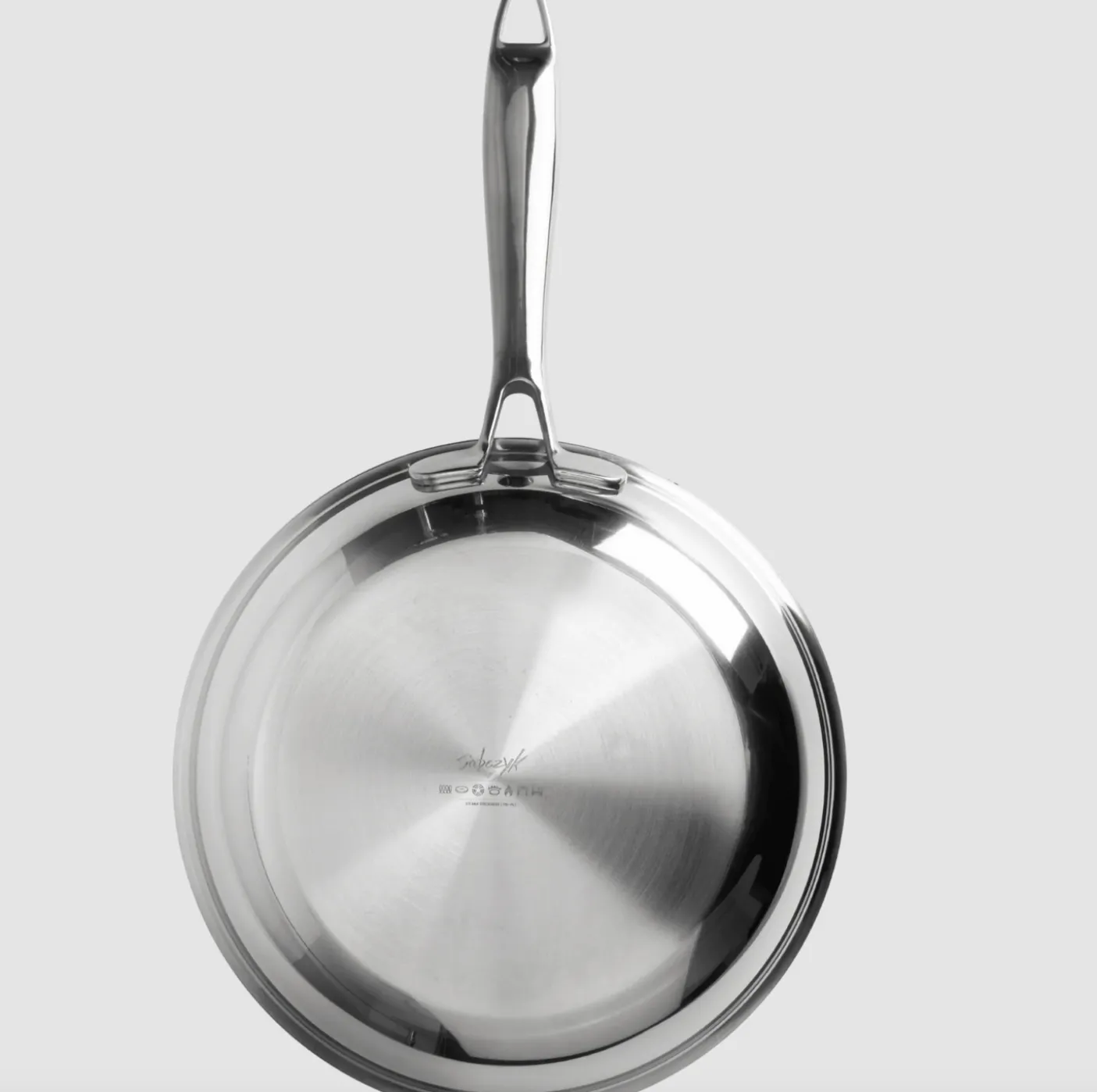 Panden er bygget op i tre lag stål med et kerne-lag af aluminium. Det sikrer en jævn varmefordeling, så du kan stege bøffer, grøntsager og fisk helt perfekt – hver gang. Samtidig giver det yderste lag af rustfrit stål en holdbarhed, der kan klare hverdagens brug uden at miste form eller funktion.