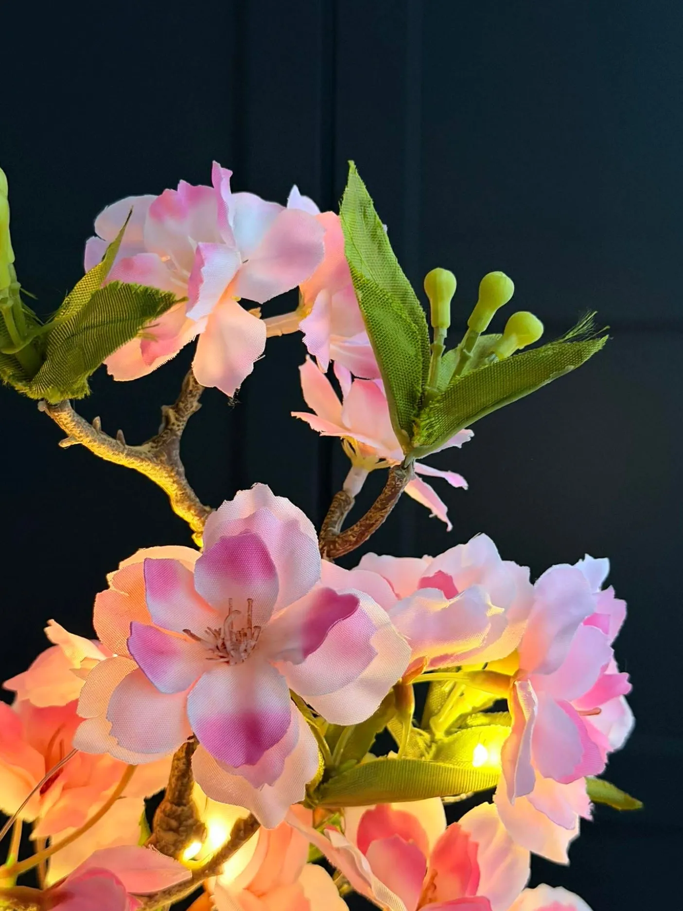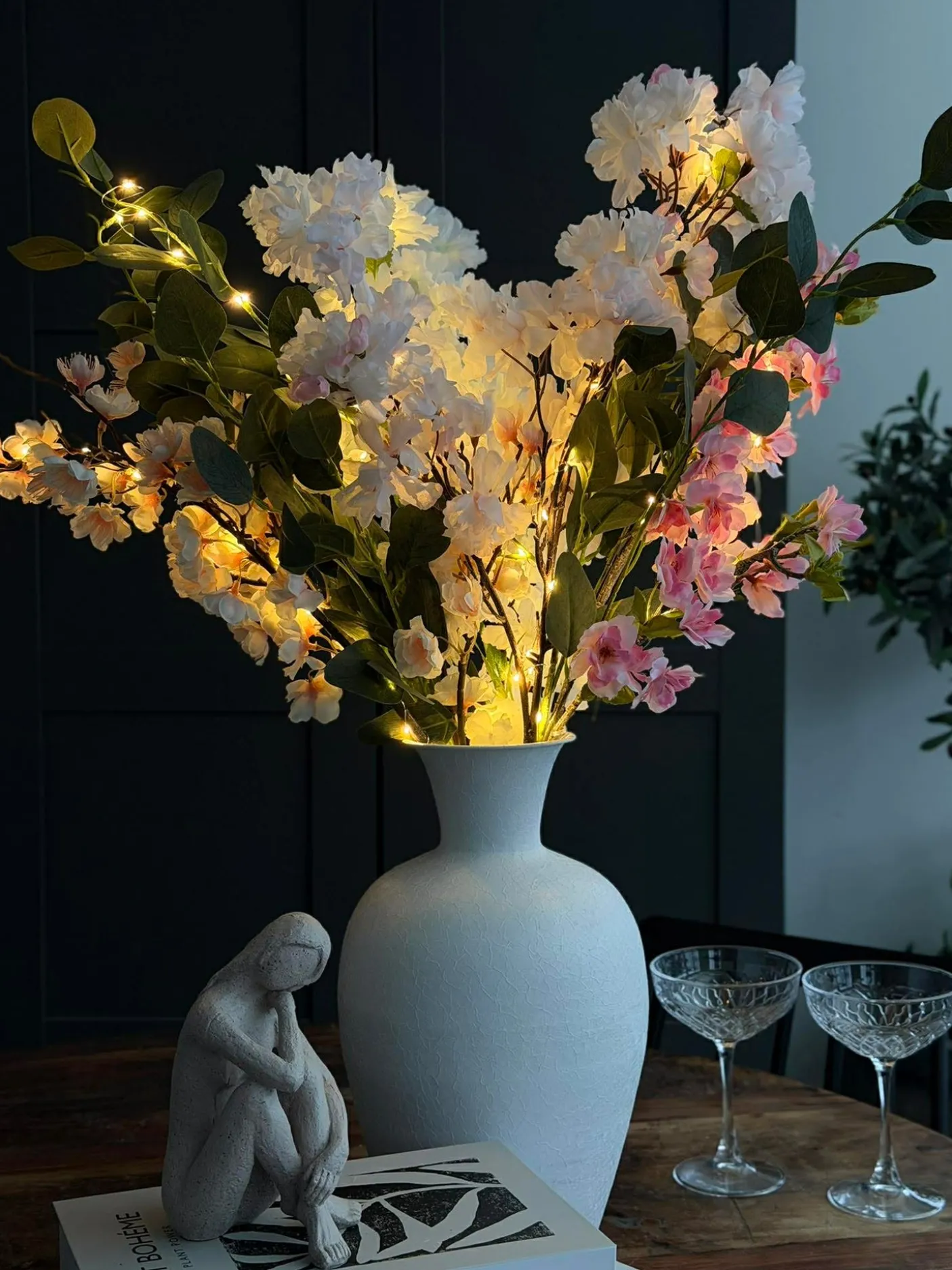 Dekorativ kirsebærgren, velegnet som dekorativ detalje i stuen eller på et konsolbord. Grenens højde er 105 cm, og den har en indbygget lyskæde af små LED-lys. Et blidt udtryk gør den velegnet til både neutrale og farverige rum.