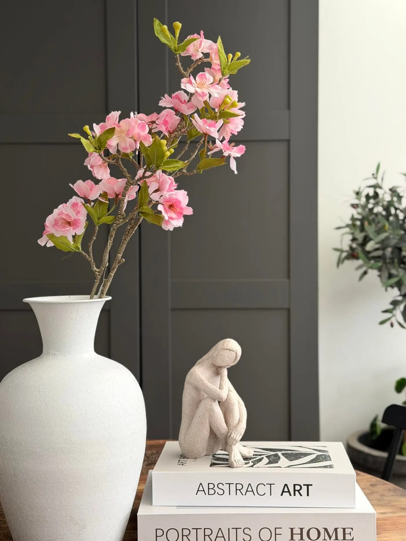 Placer kirsebærgrenen i en smal, høj vase på et sidebord eller på en konsol i entréen for et blødt fokuspunkt. Den kan også lægges ned som en del af en bordopstilling eller kombineres med andre dekorationsobjekter for varierende udtryk.