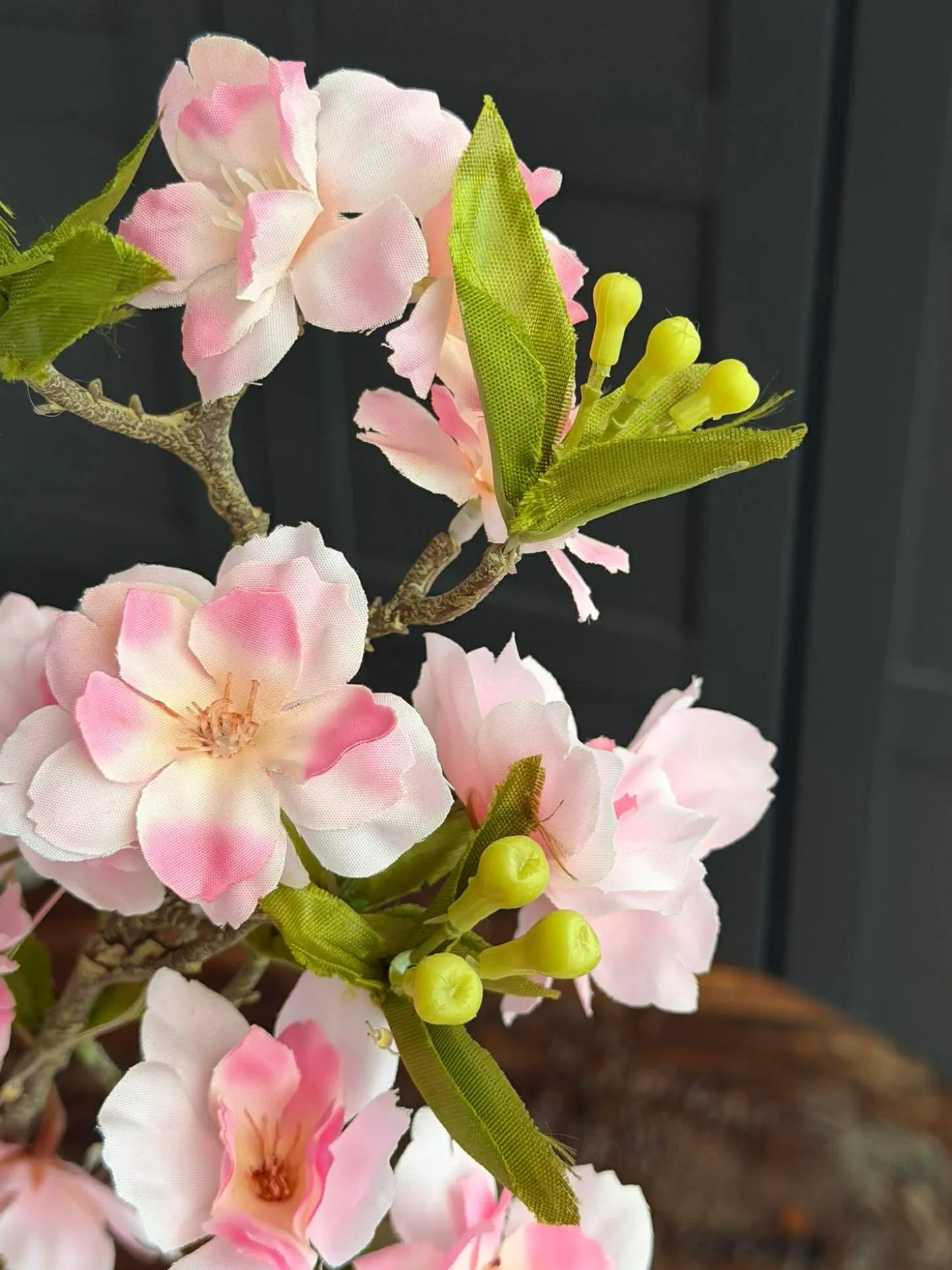 Udførelsen fremhæver rosa og hvide blomster, som skaber et sart og dekorativt look. Grenens proportioner og farvespil gør den velegnet som et enkeltstående element i en høj vase eller som del af et stilleben på et bord.