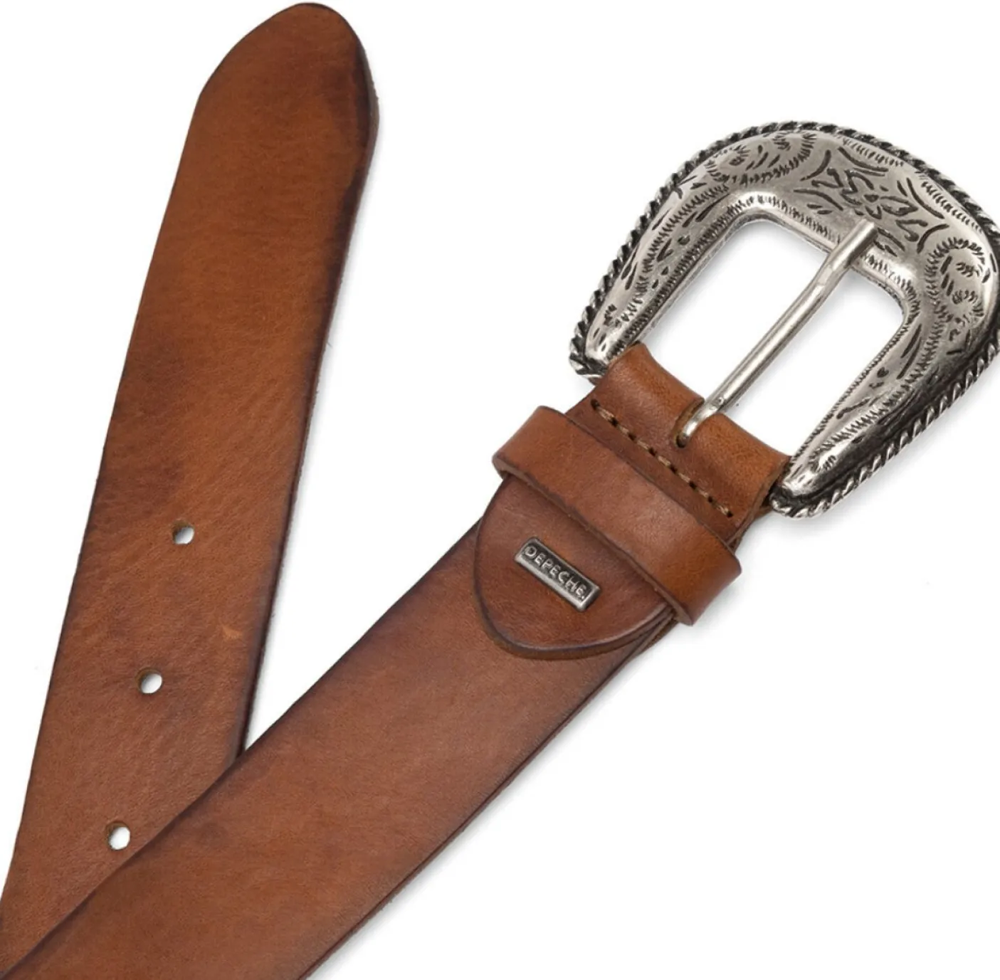 Farven cognac tilfører varme til garderoben, mens det dekorative bæltespænde understreger det stilrene udtryk uden at tage over.