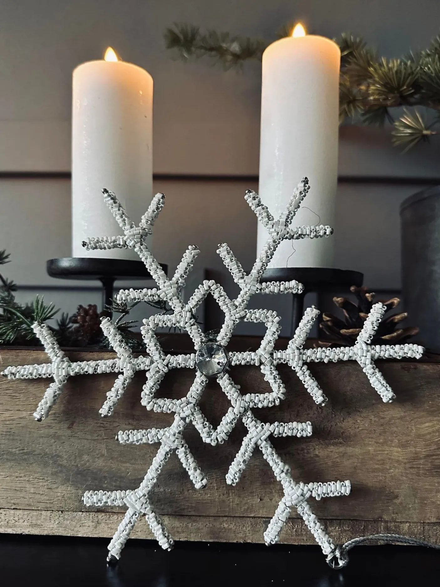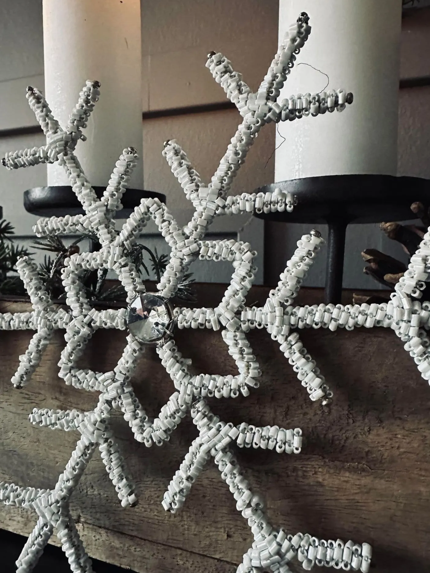 Juleophæng – Snefnug i hvide perler.