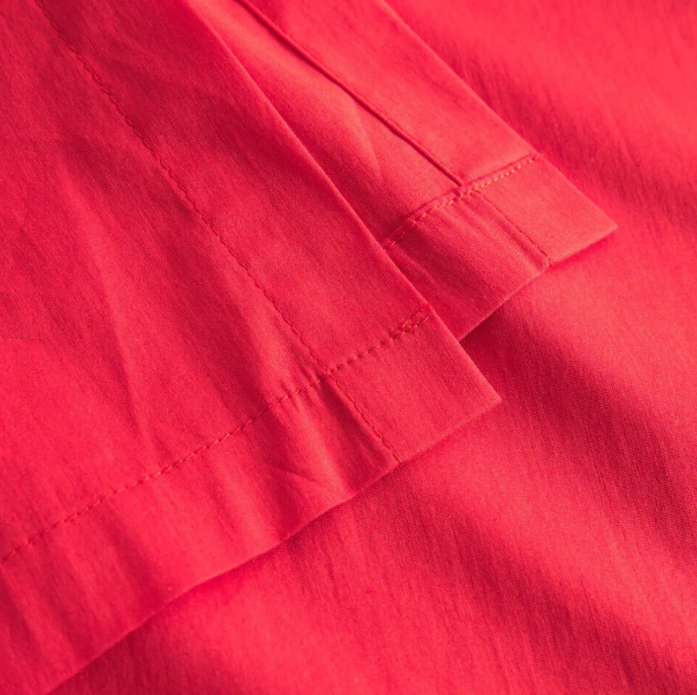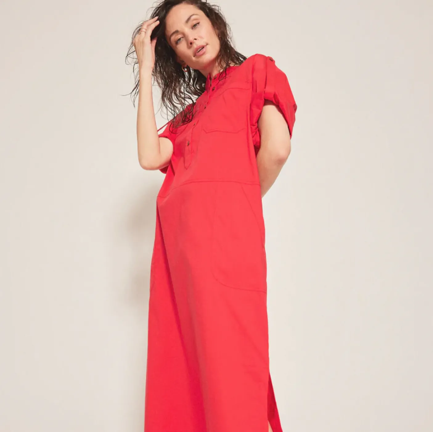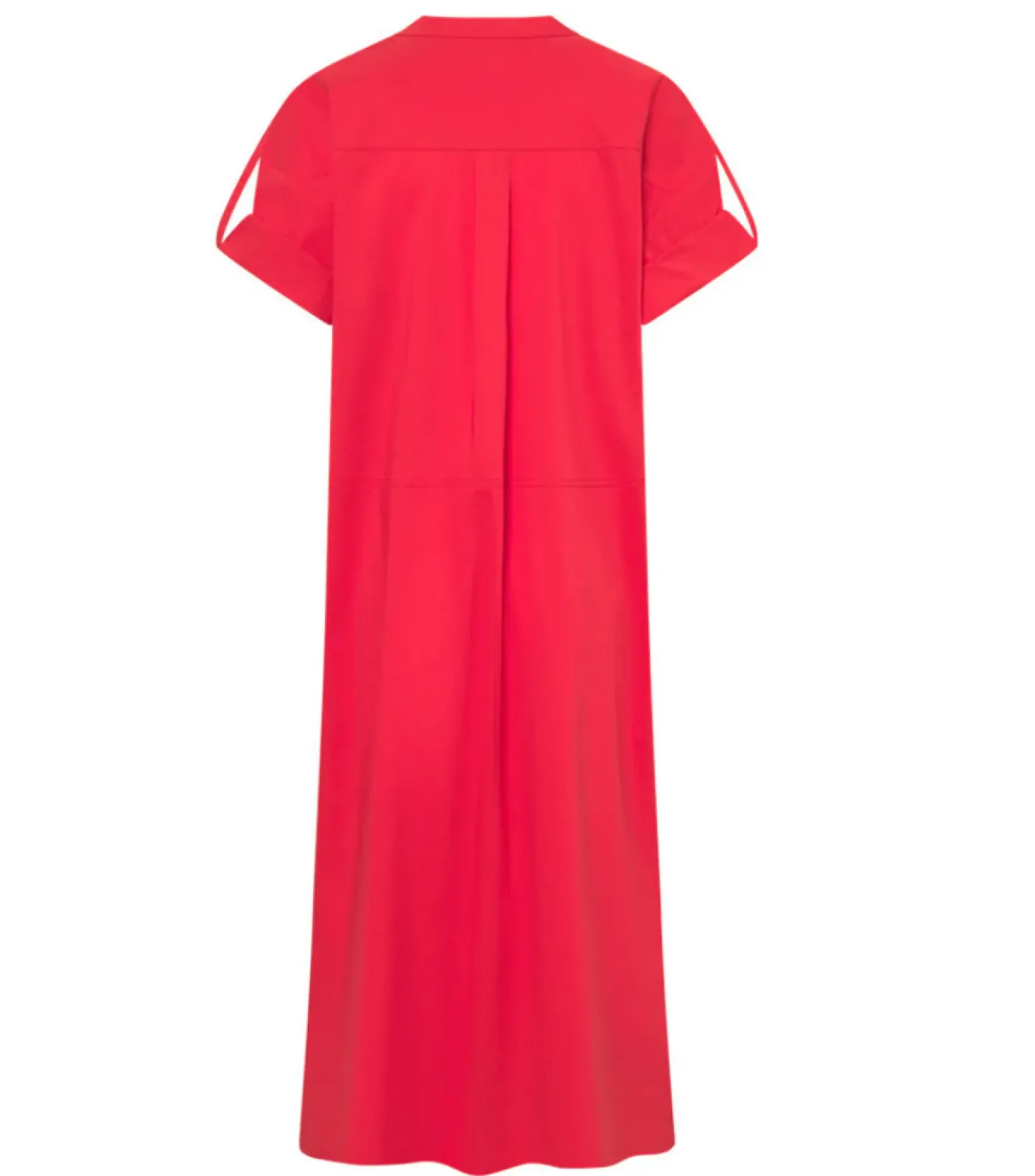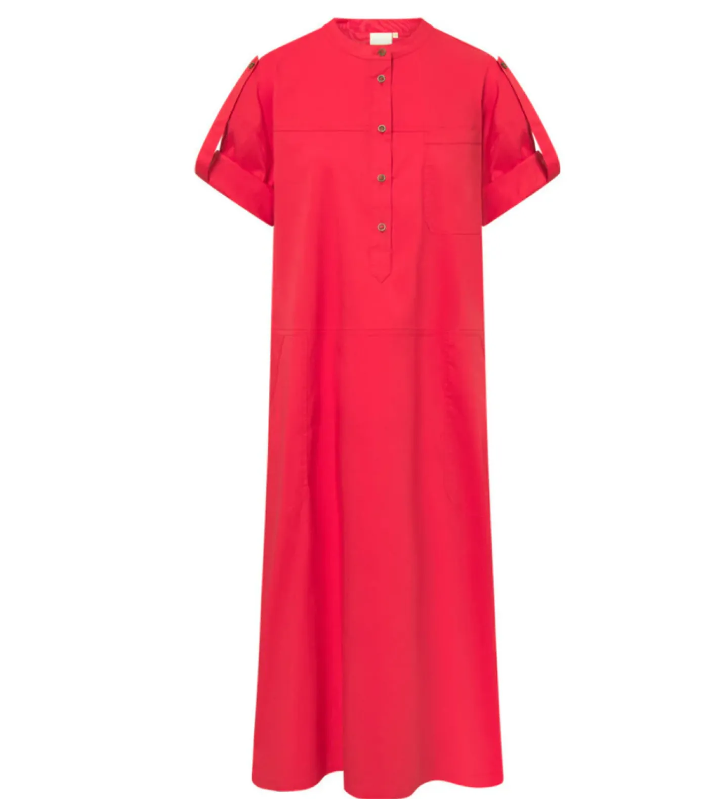 Kjole Aby rød er en løs pasforms kjole i rød farve med under knæ-længde, skabt til både hverdagsbrug og mere festlige lejligheder. Den er fremstillet i en cotton/stretch-kvalitet med en blanding af bomuld, polyamid og elastan. Ærmerne har turn up-stropper, så længde og udtryk kan varieres efter ønske. Kjolens lommer og knapper foran giver et enkelt og funktionelt udtryk.