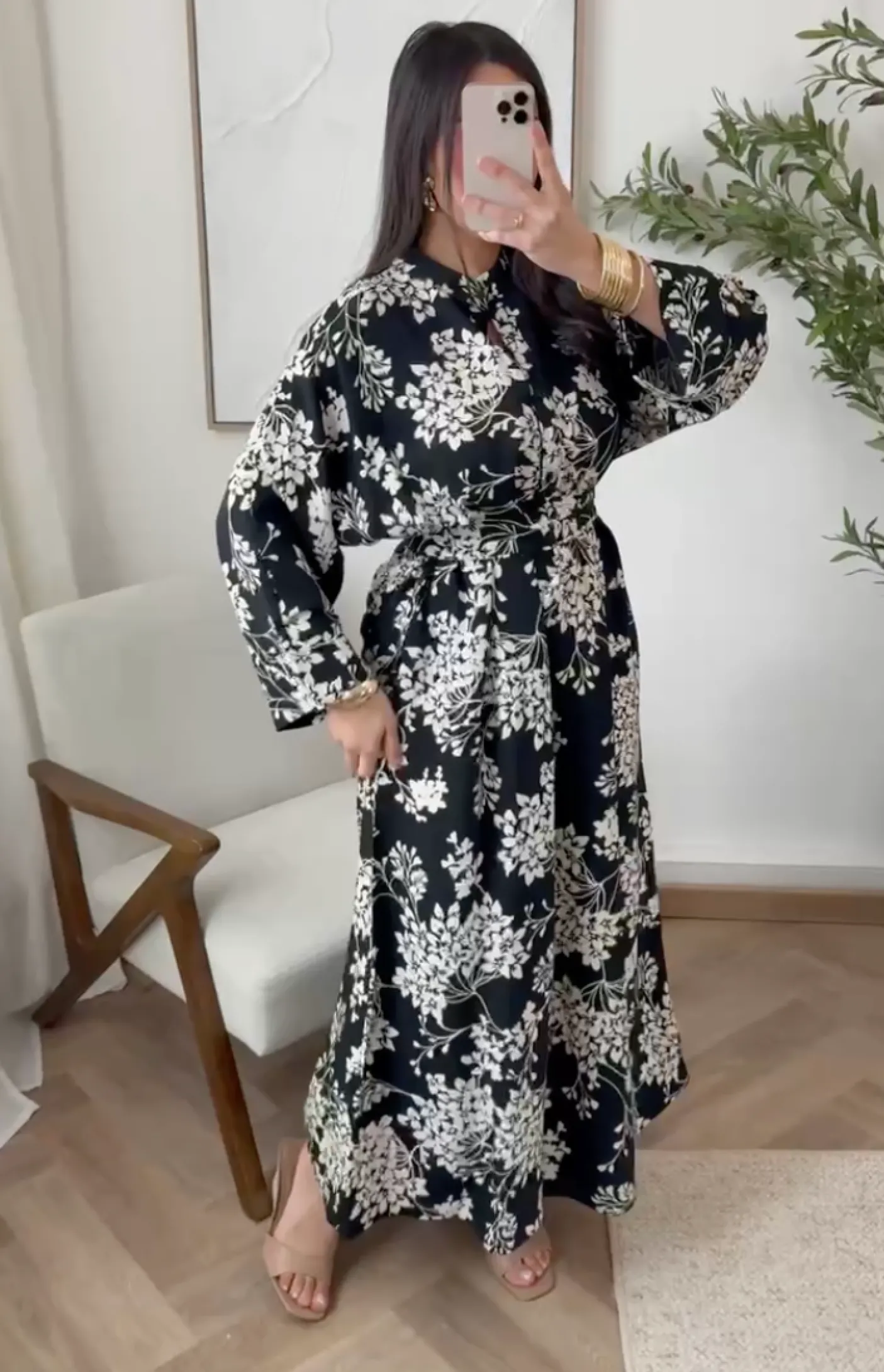 Lang kjole der kan anvendes både til daglige udflugter og ved mere markante anledninger, hvor blomsterprintet bliver et centralt udtryk. Den mørke farve gør printet tydeligt og giver et roligt udtryk i helheden.