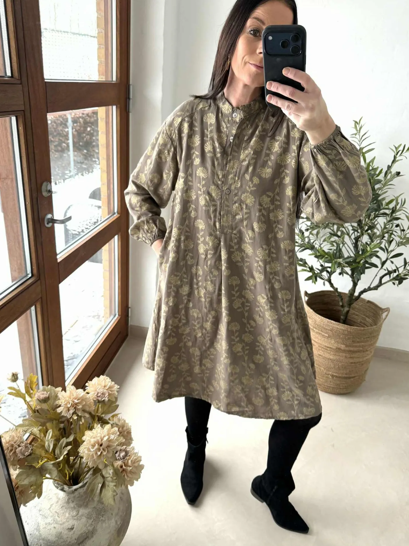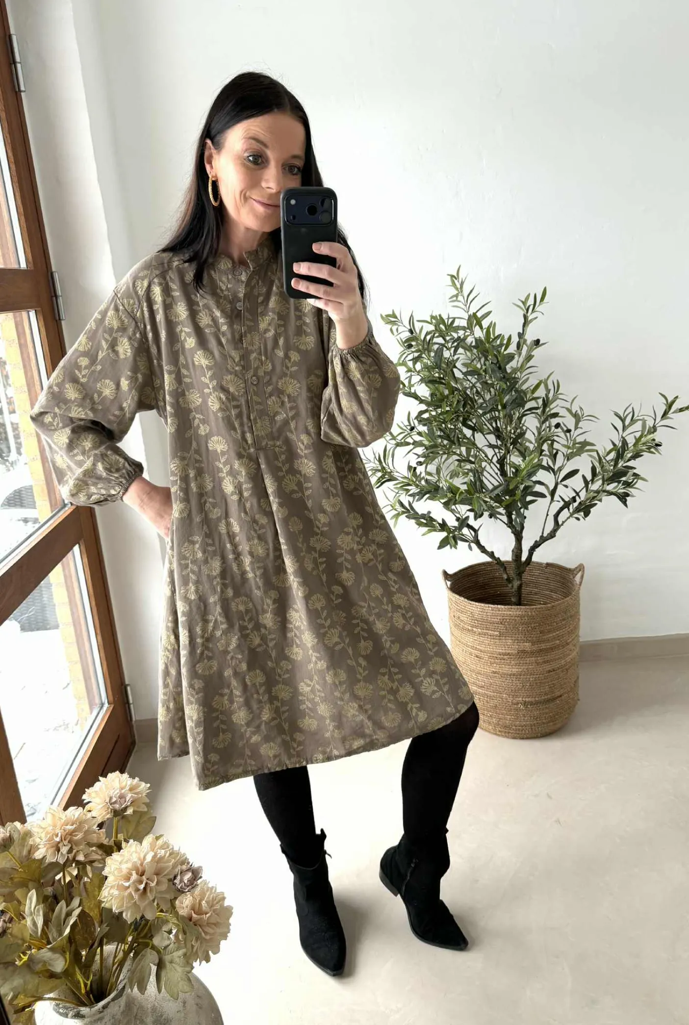 Kjole med guld print er en flot kjole med et unikt guldmønster, der giver et dekorativt udtryk. Materialet er 90% Viskose og 10% Nylon. Kjolen er rummelig i størrelsen, og Maja har S/M på. Den kan bruges både til hverdags- og finere brug.