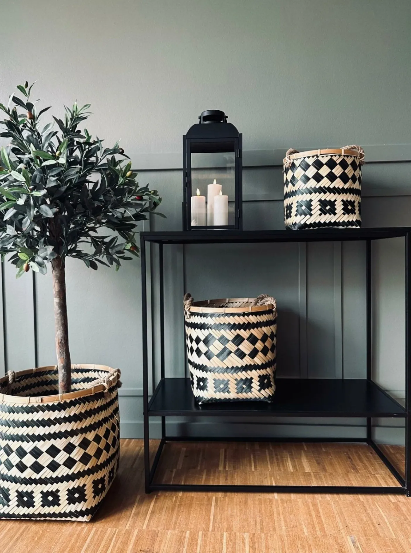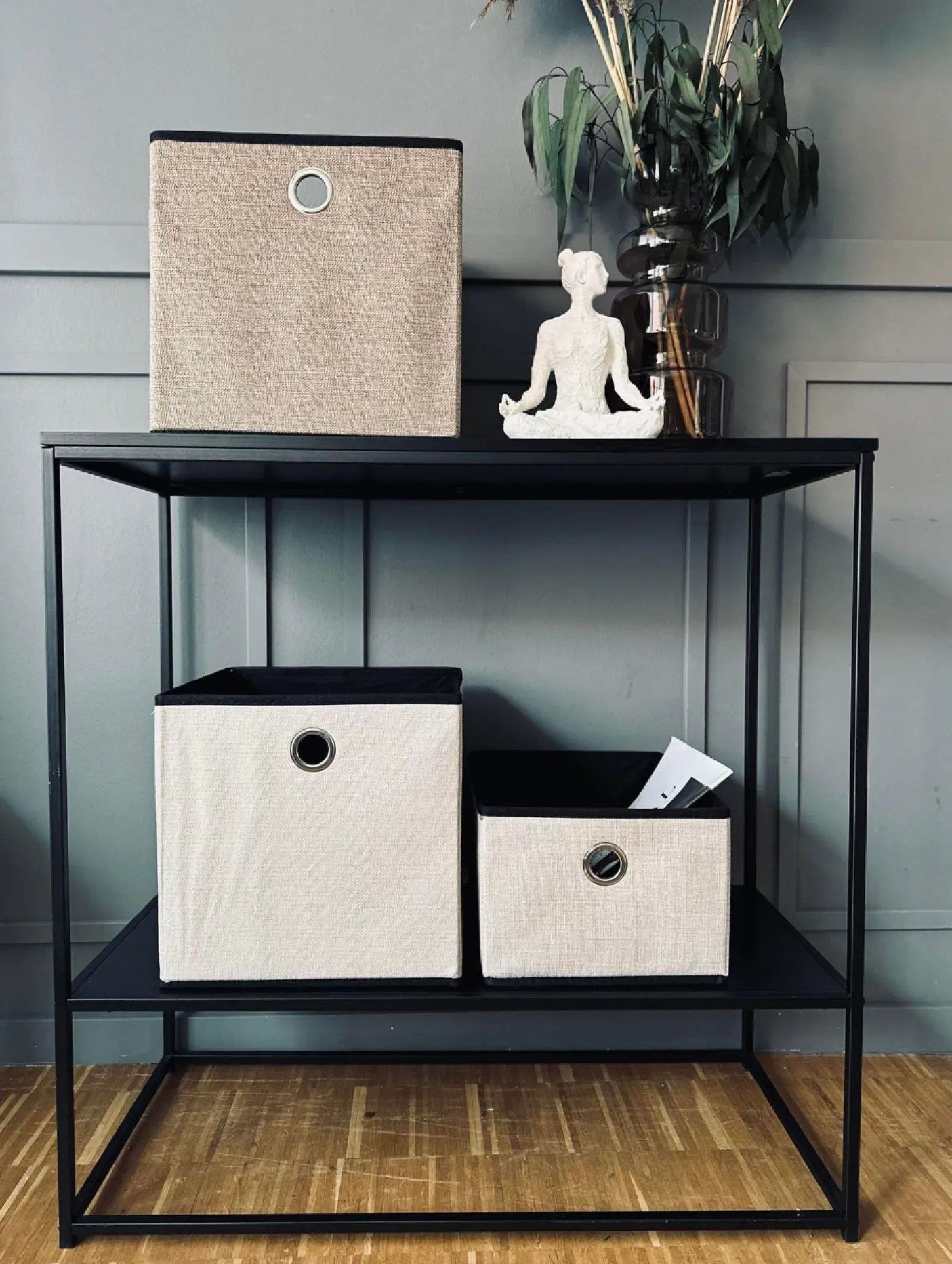 Konsolbord med sort ramme og to sorte hylder