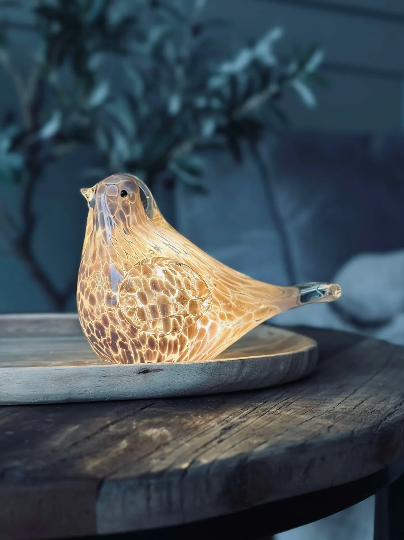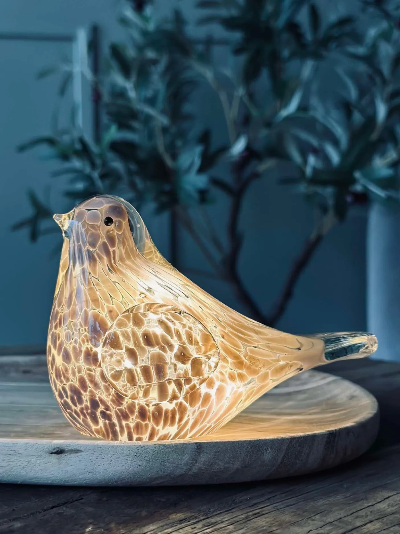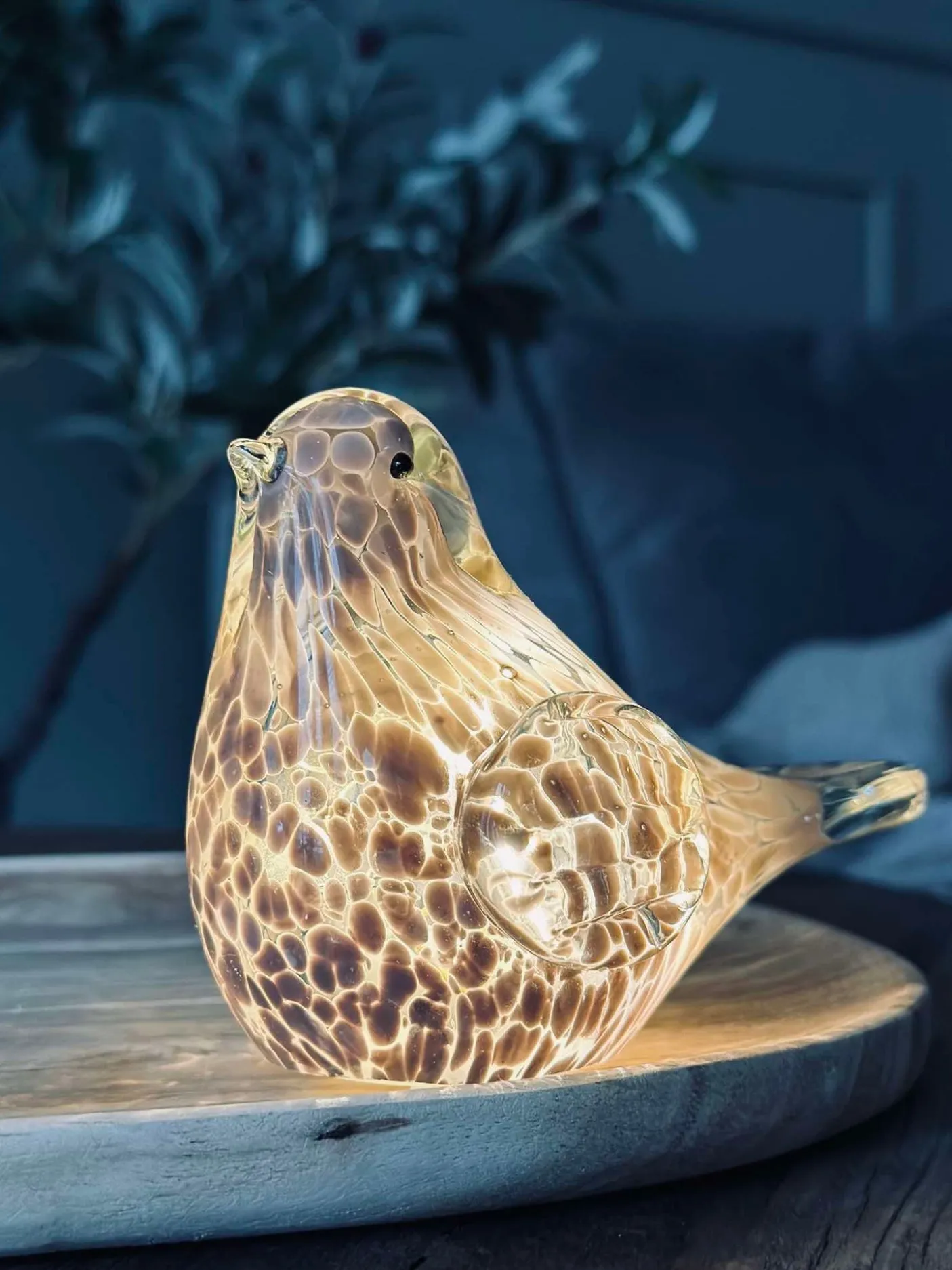 - LED-fuglen er lavet af mundblæst glas