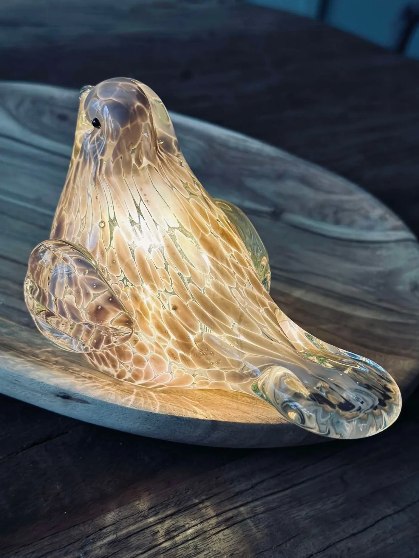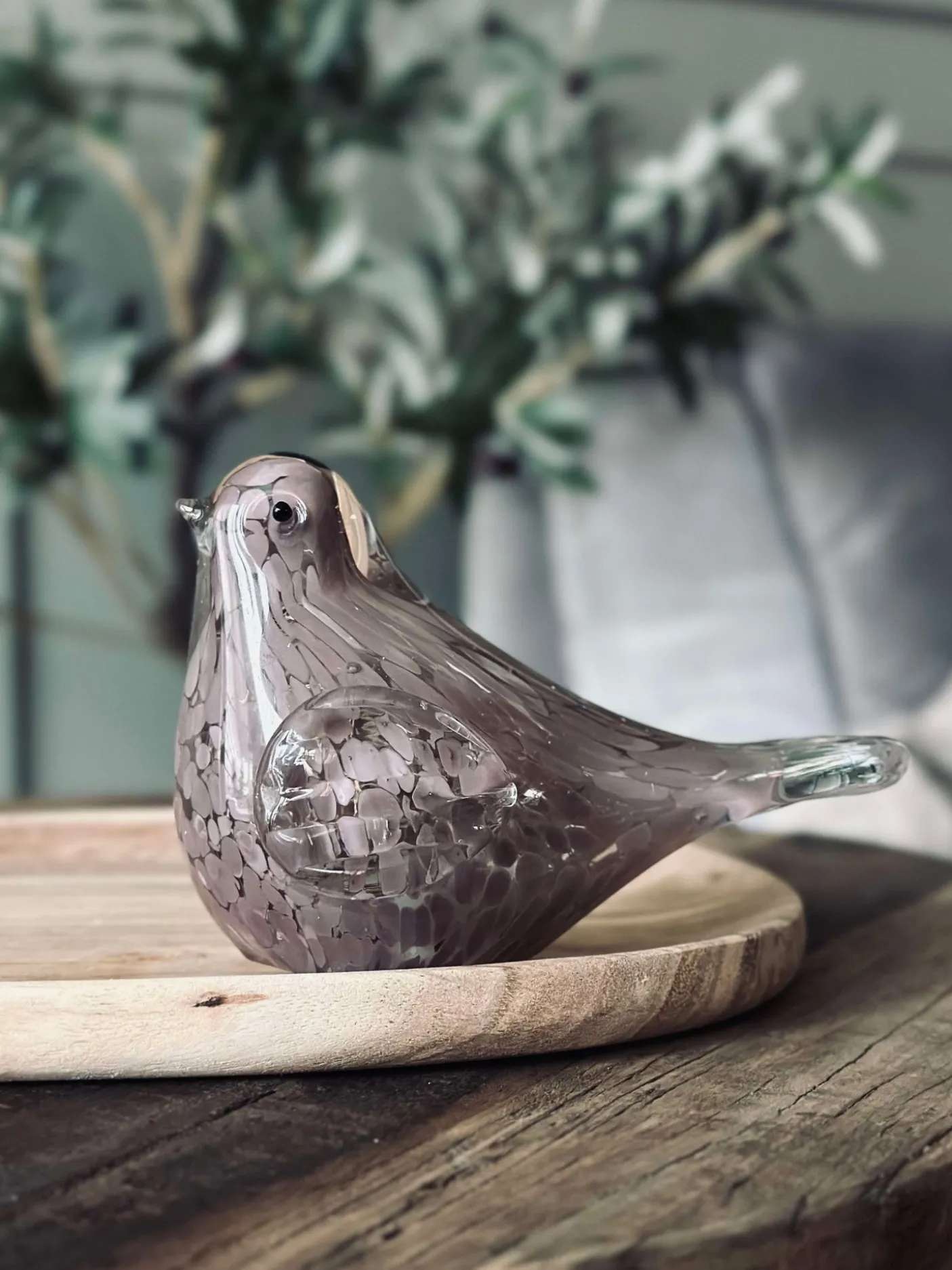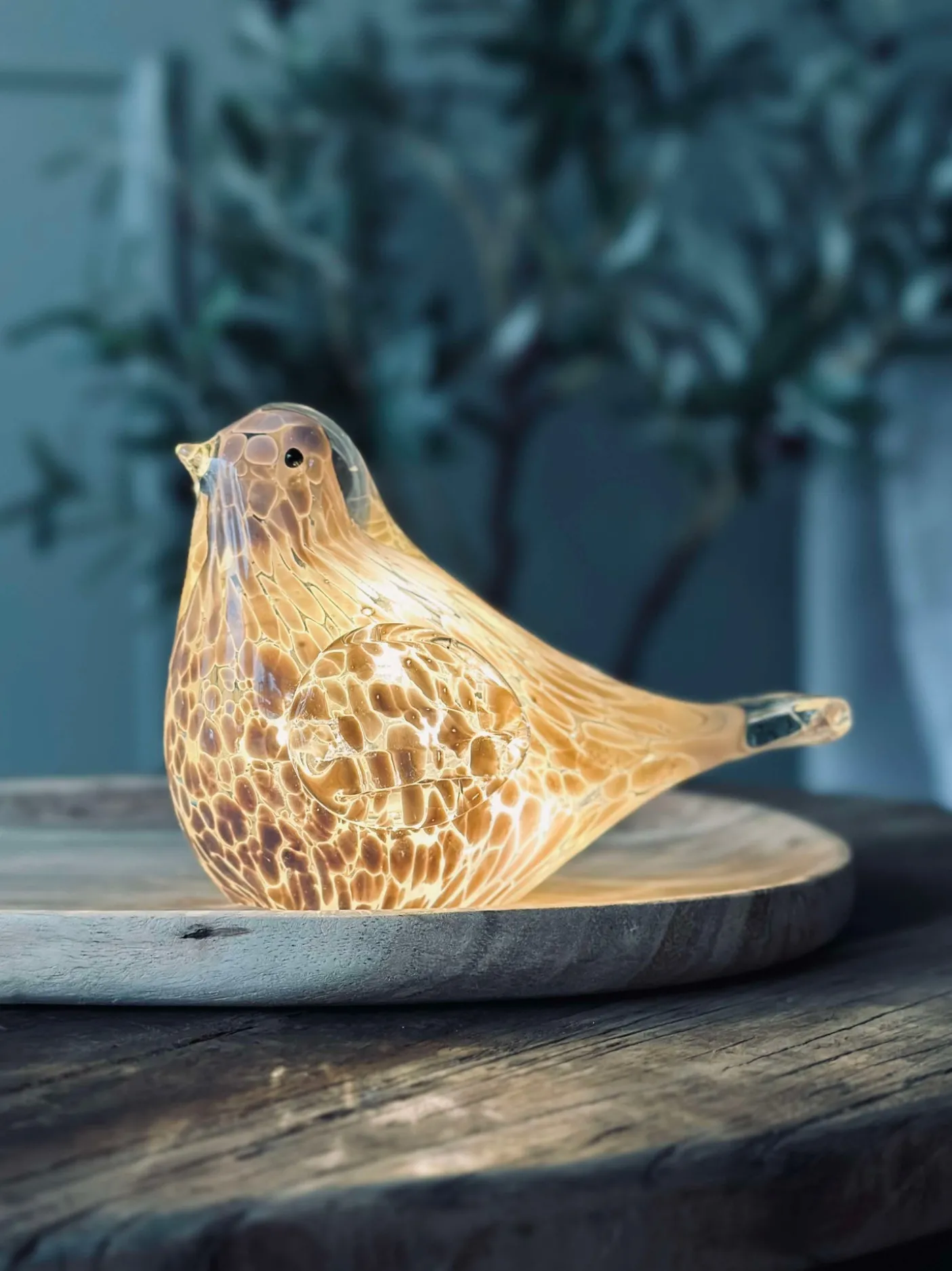 - LED-fuglen er lavet af mundblæst glas