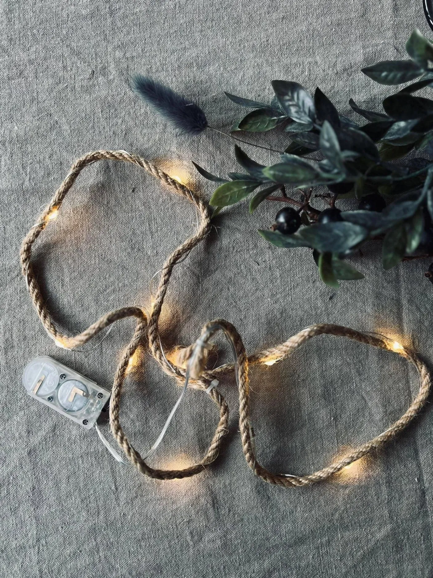 LED Lyskæde med bast-snor til alm batterier .