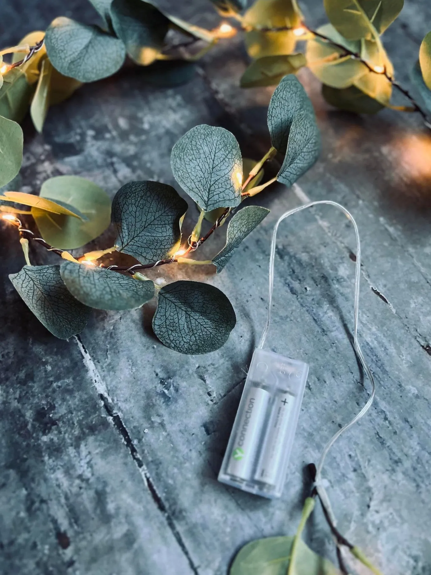 Super fin og dekorativ lyskæde med eucalyptus blade.