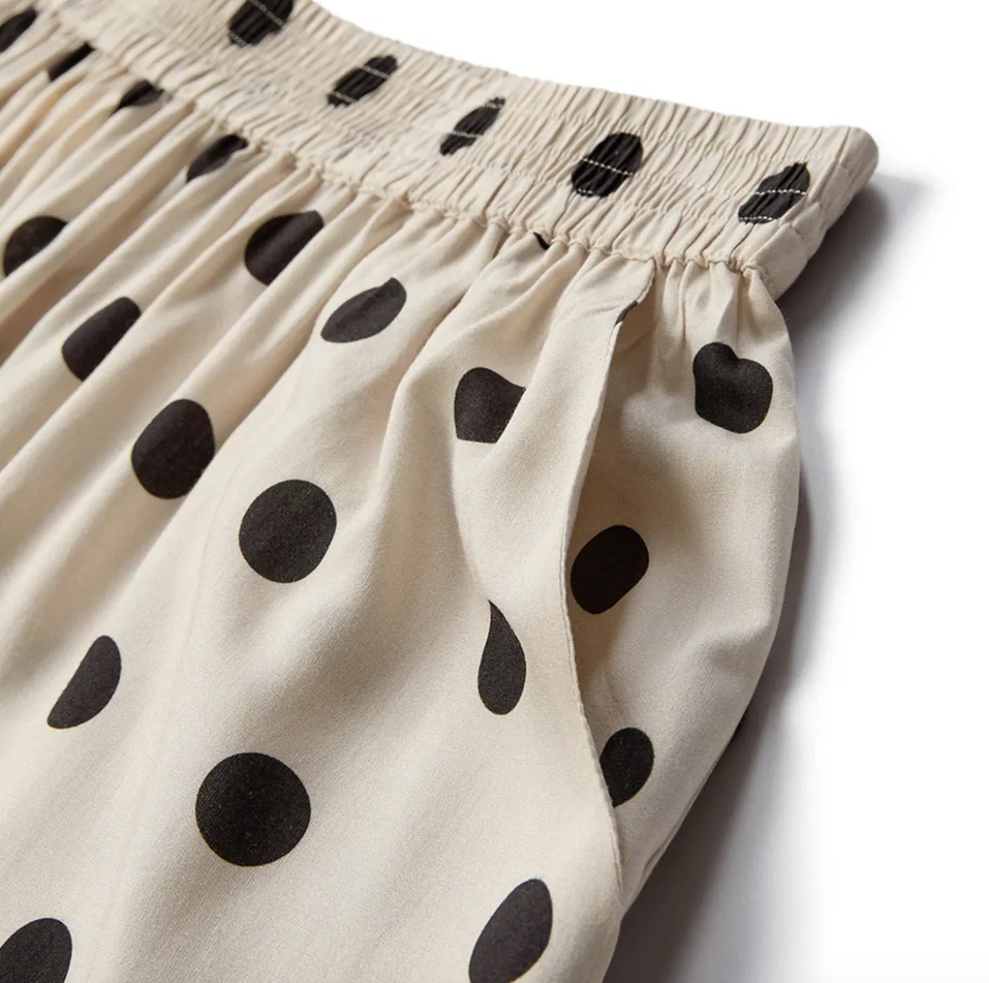 Meghan nederdelen er en feminin A-formet nederdel med prikket print i blød cremefarve, ideel til sommergarderoben. Modellen er fremstillet i 100% viskose og fås i størrelserne S/M og L/XL. Længden går til under knæet og skaber et sofistikeret, men legende udtryk. Designet kombinerer komfort med et tidløst snit, som let kan styles op eller ned.