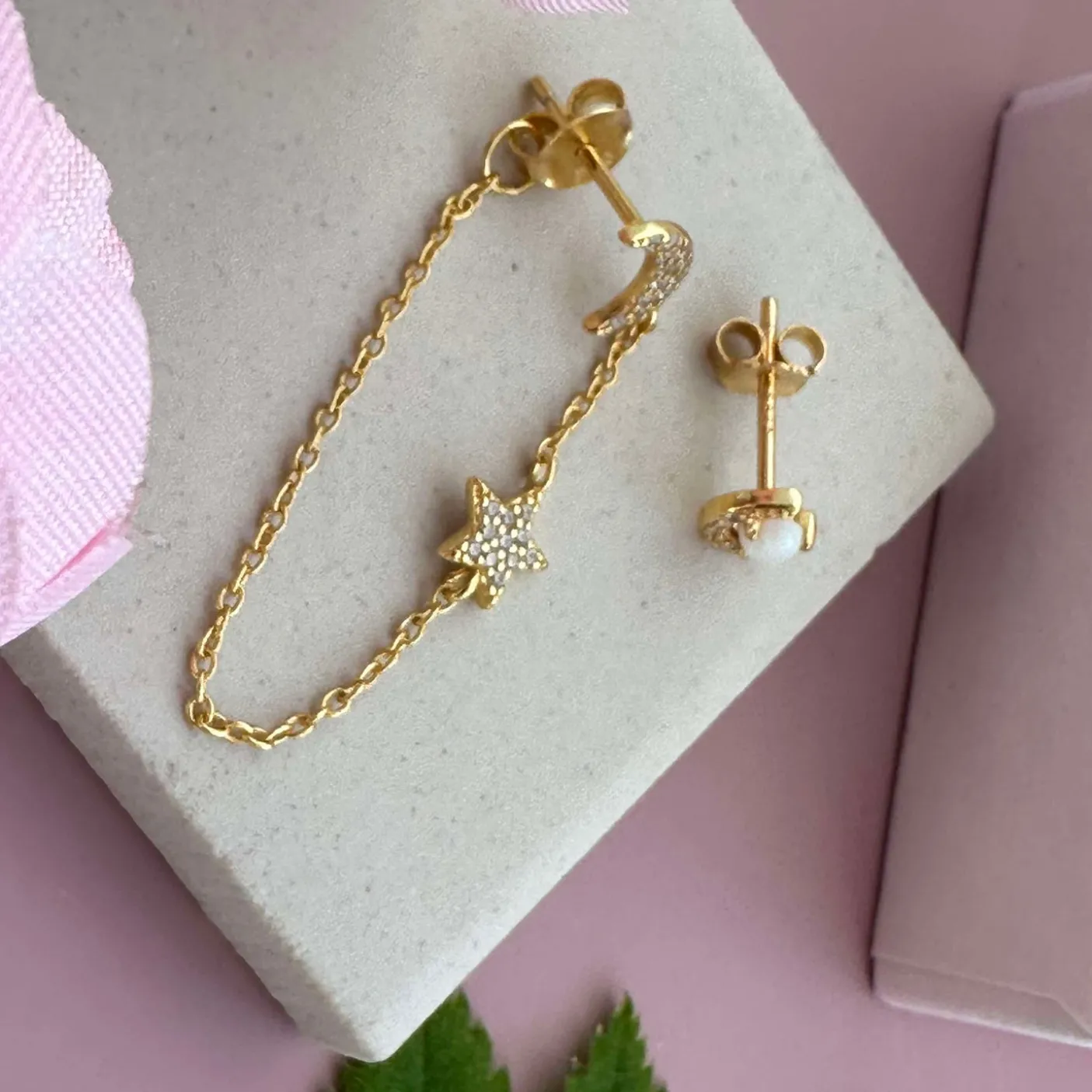 Udført i solidt sterling sølv og derefter forgyldt med 18K guld. Stenene, der er anvendt er CZ Zirkoner, men den lille centersten i ørestikkerne er en lille månesten.