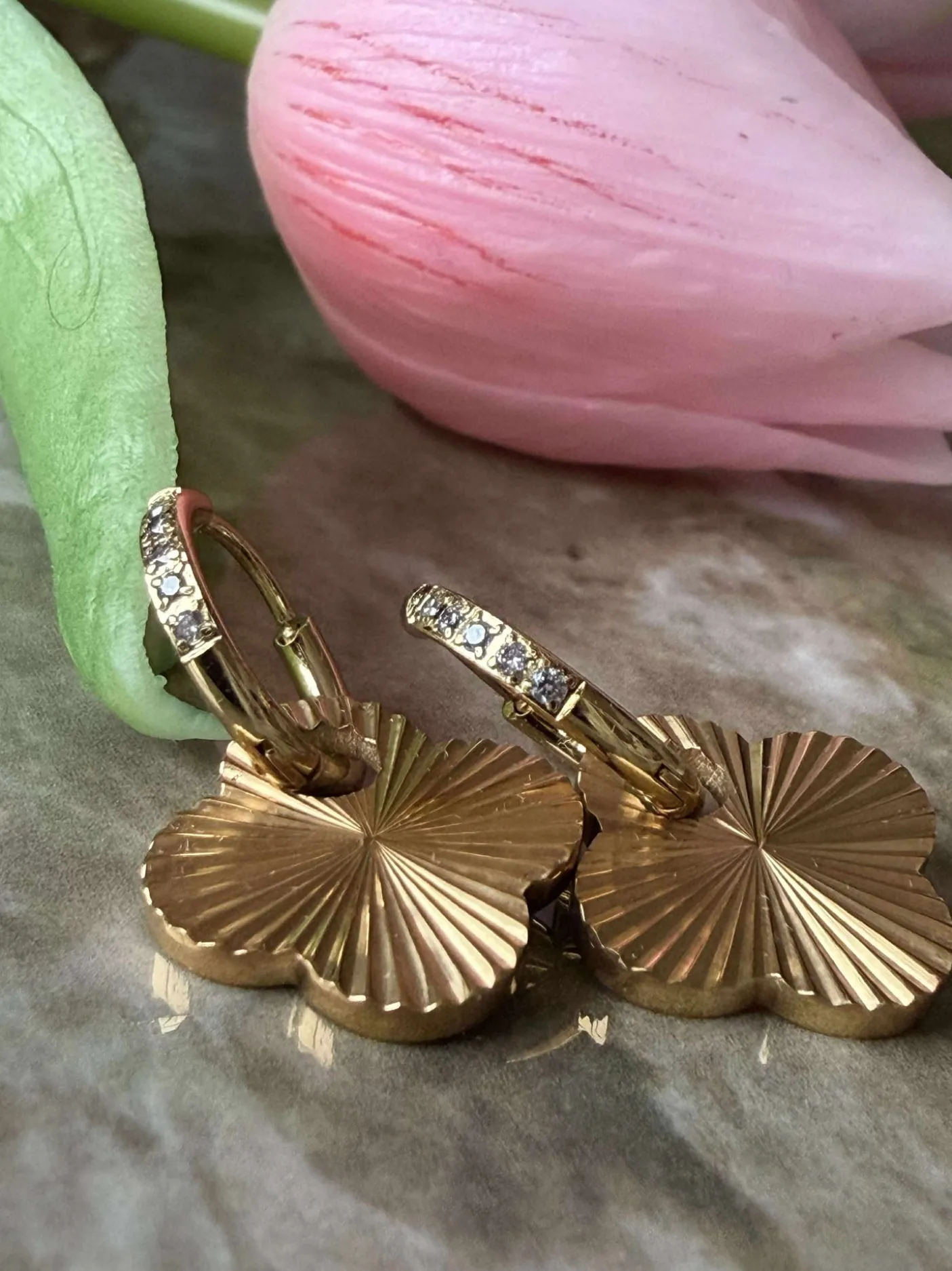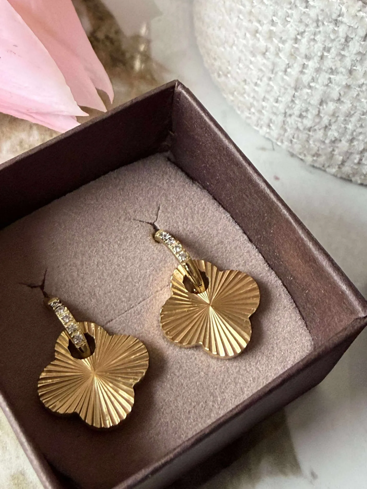 Øreringe SAGA – forgyldt er et par delikate øreringe med drop kløver-vedhæng. Fremstillet i rustfrit stål med forgyldt finish og længde 2.5 cm. Udtrykket er varmt og fint takket være den gyldne overflade, som løfter både afslappede og mere elegante looks. Designet er enkelt nok til hverdag og detaljeret nok til særlige lejligheder.