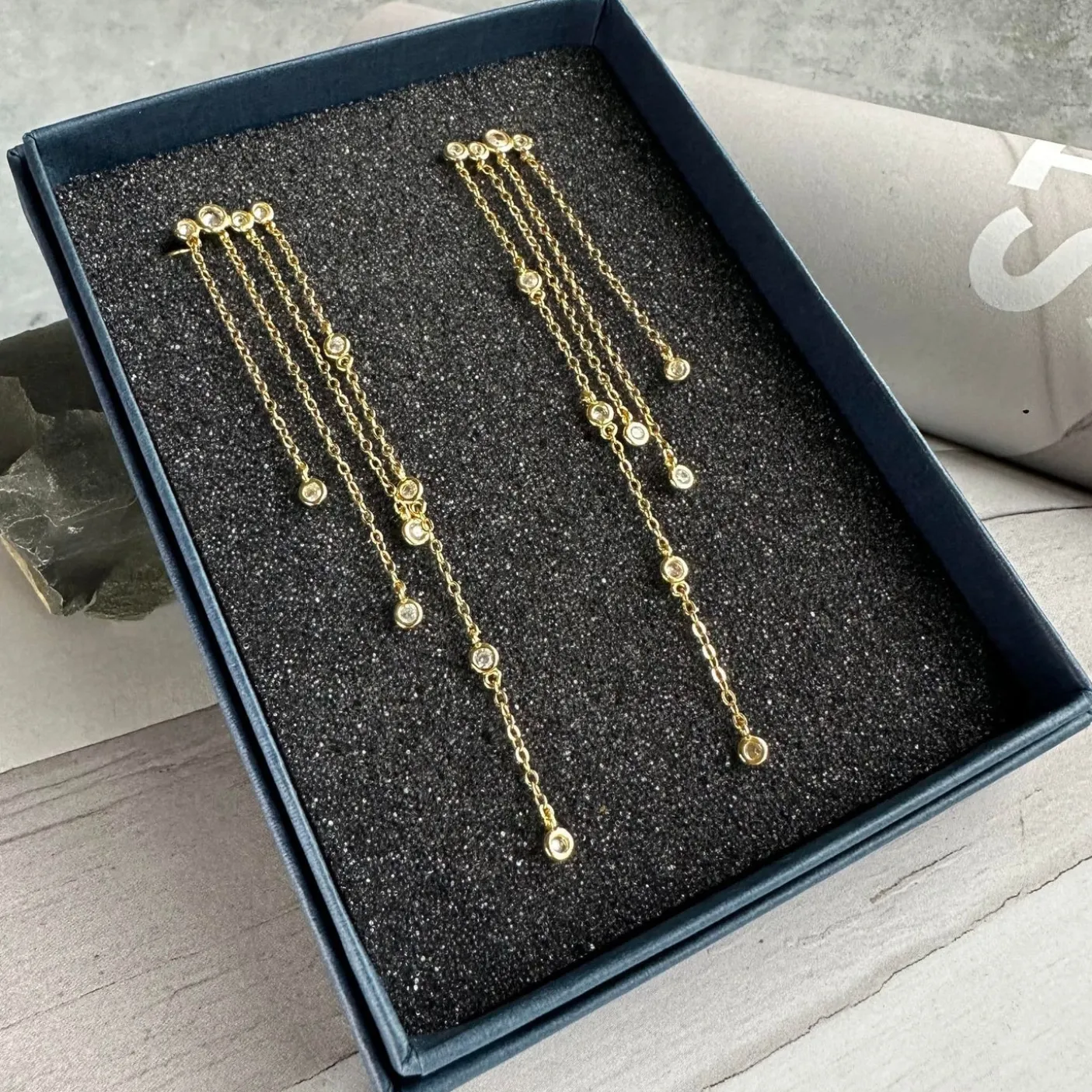 Øreringene har en række med smukke CZ Zirkoner, og herfra er de fineste kæder vedhængt med små drops med cz Zirkoner.