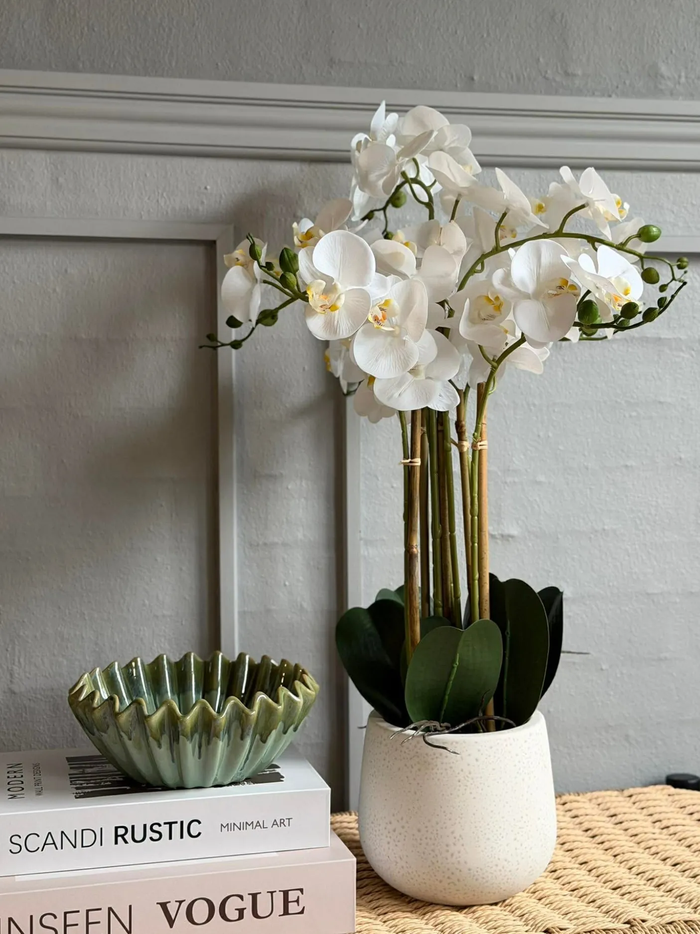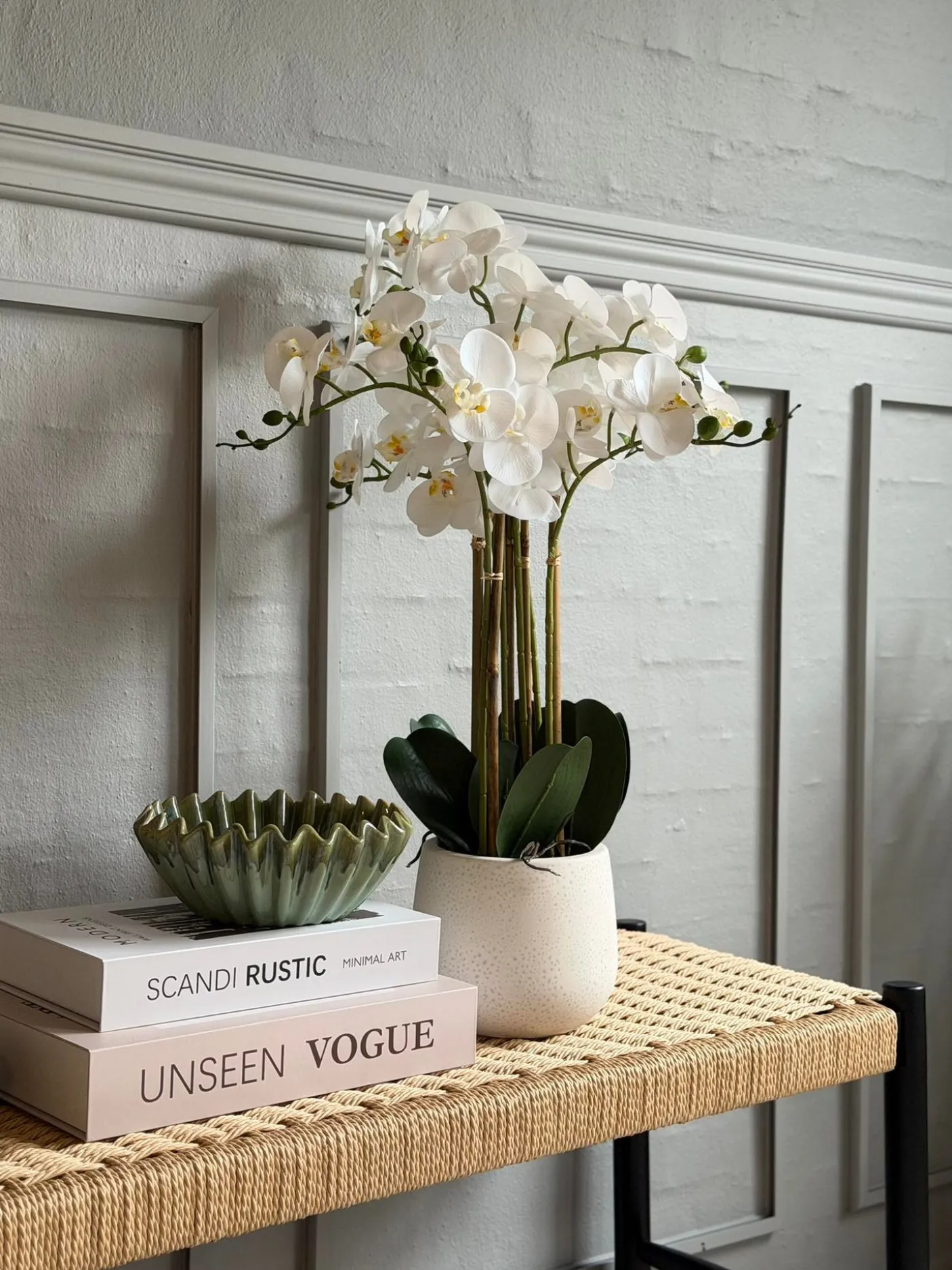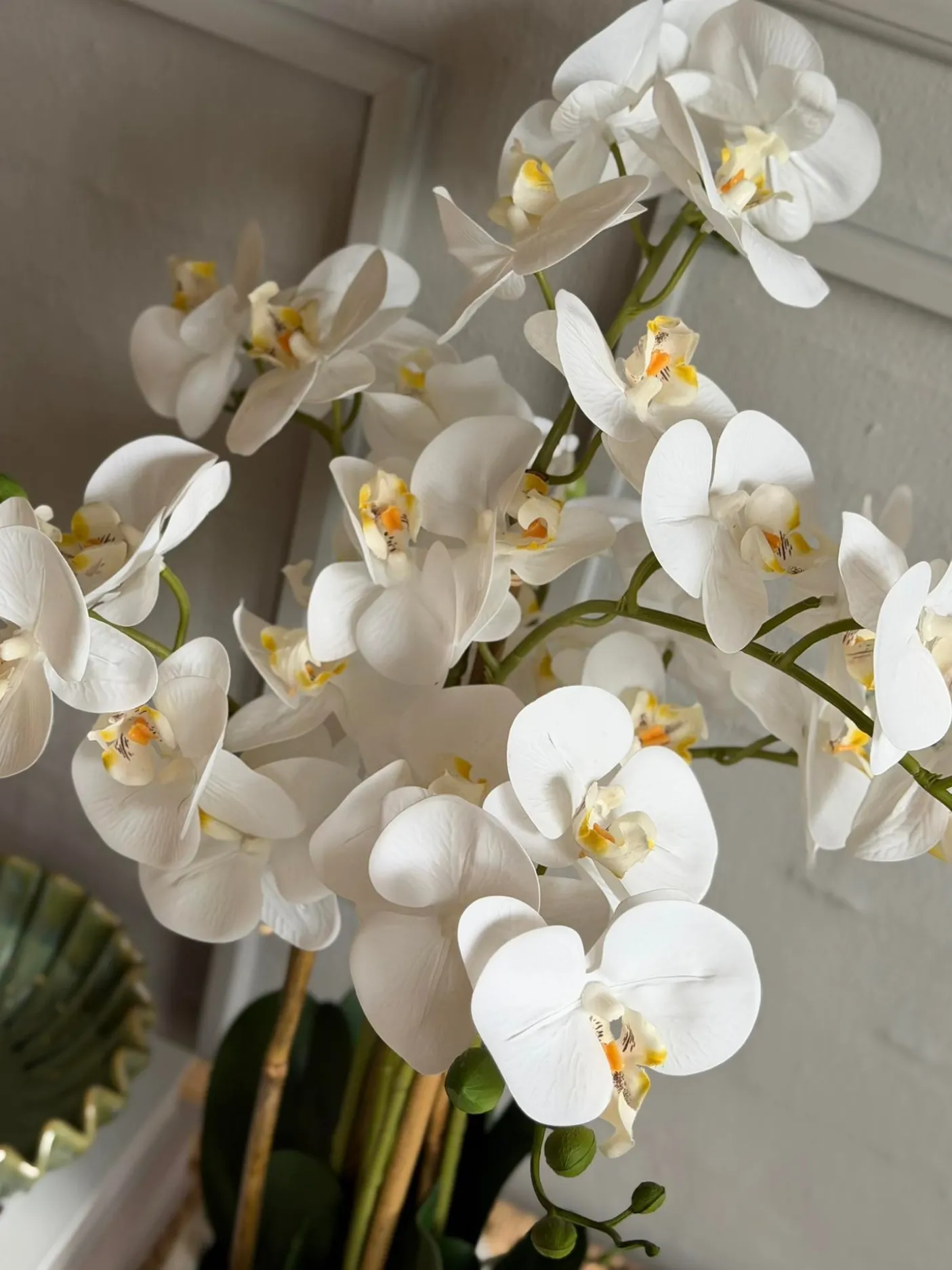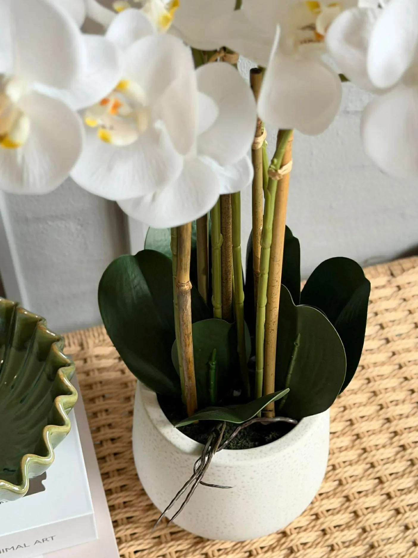 Naturtro orkidé i potte — et dekorativt element til stue, entré eller på kontoret. Højde: 65 cm. Potten medfølger. Udtrykket er afdæmpet og velegnet til neutrale farveskemaer.