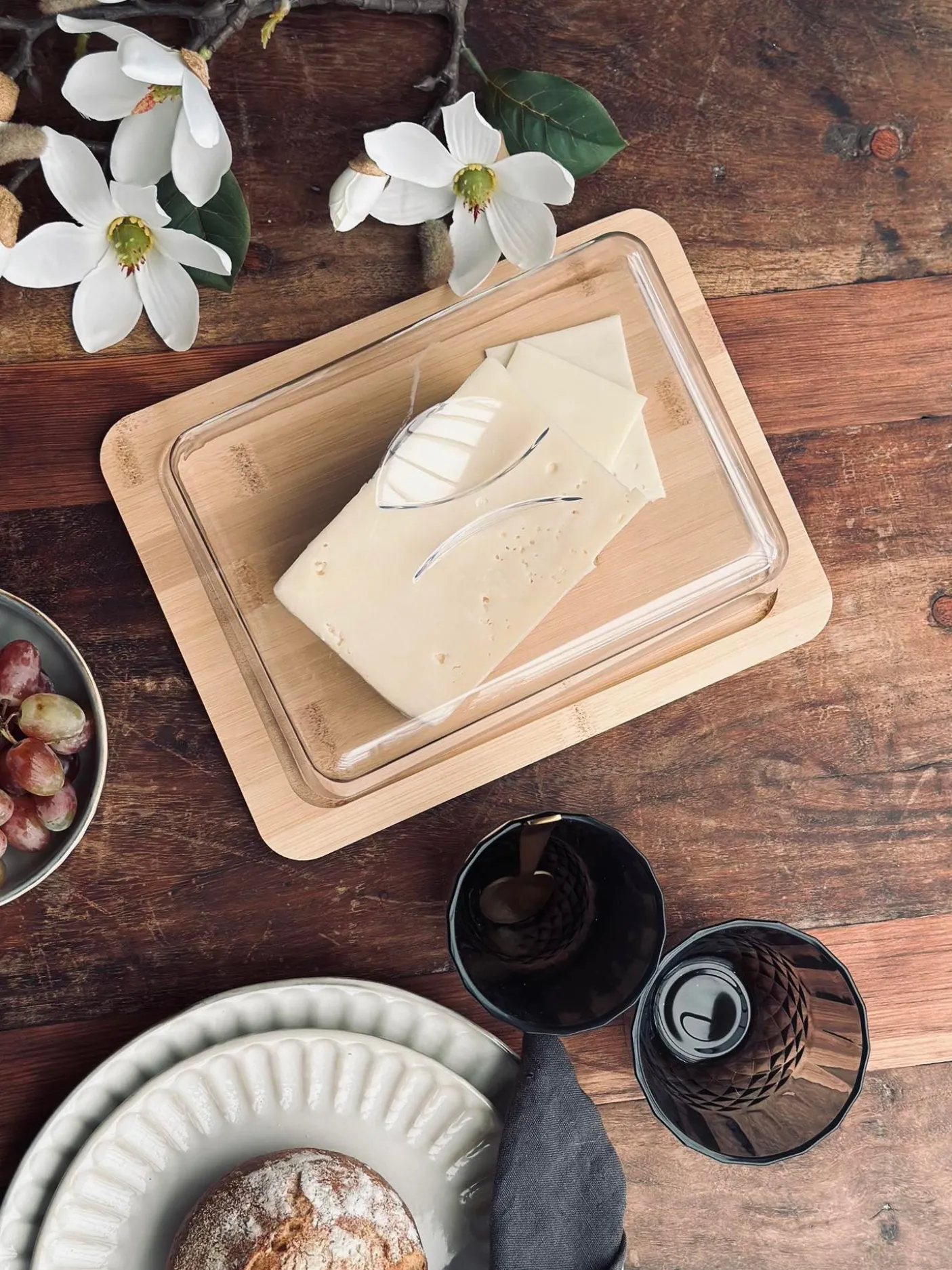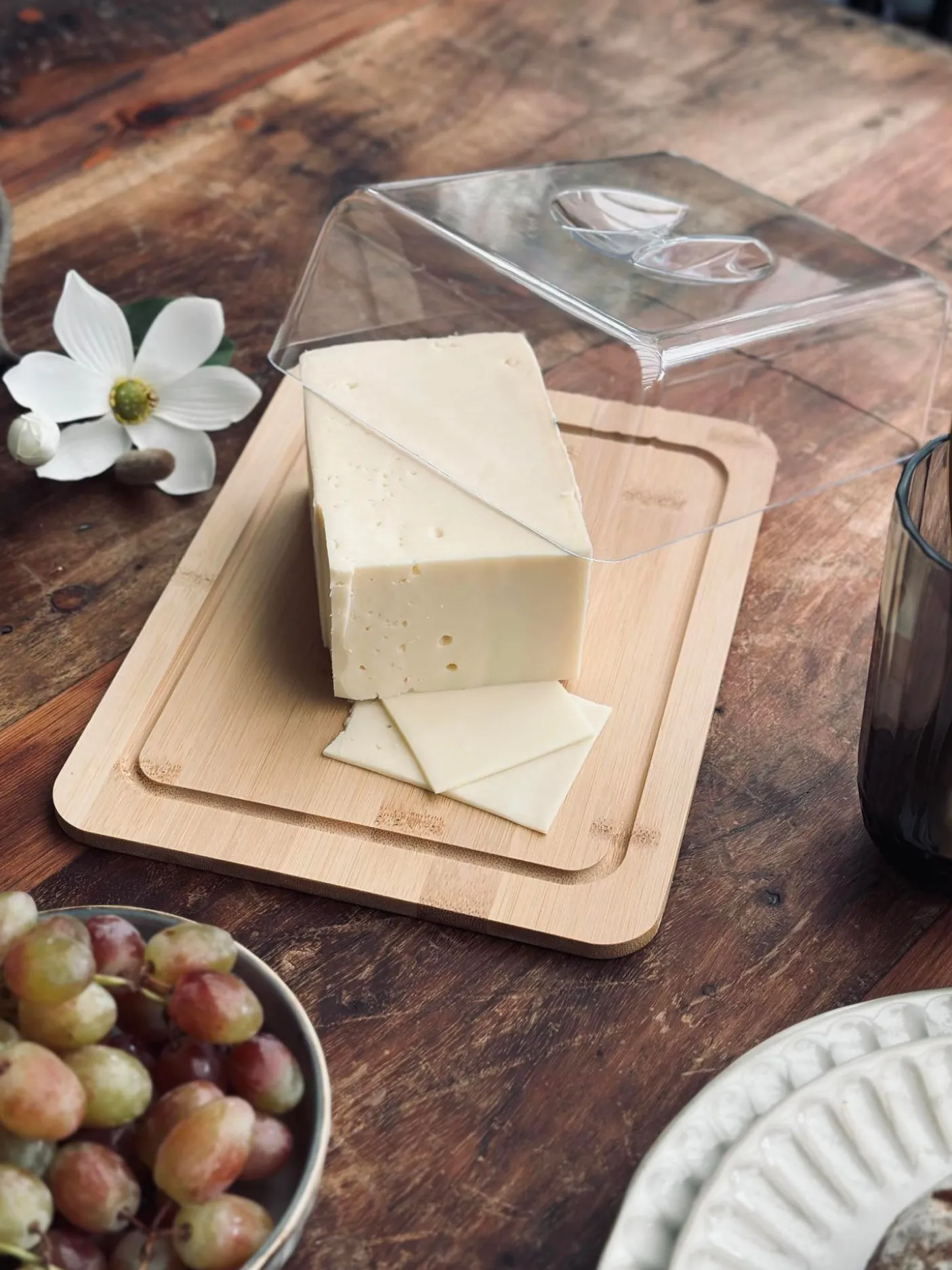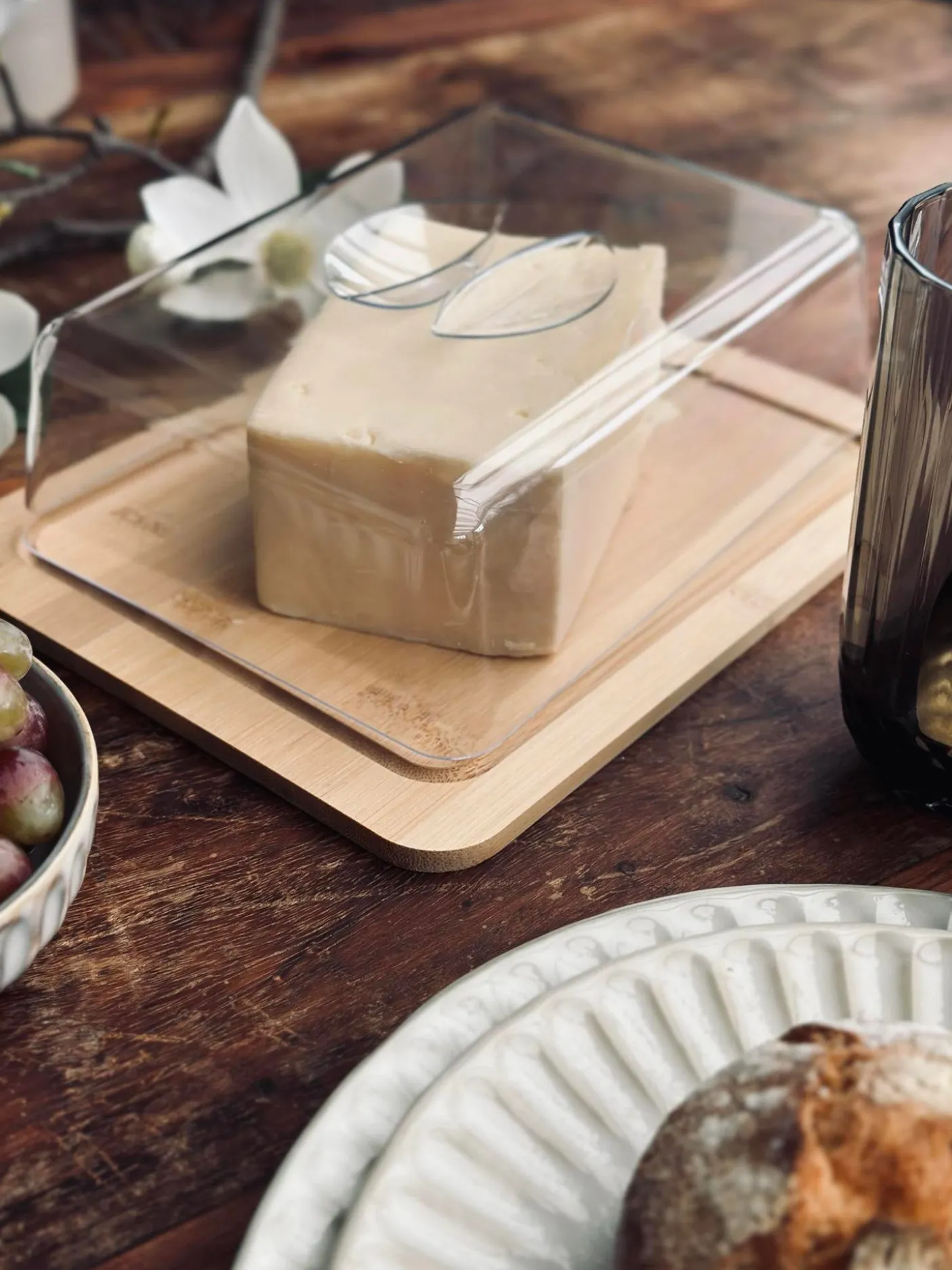 Dette ostefad med låg gør det nemt at servere ost med et roligt, naturligt udtryk. Fadet har en underdel i træ og et låg i plast, der samler serveringen og giver et enkelt look på bordet.